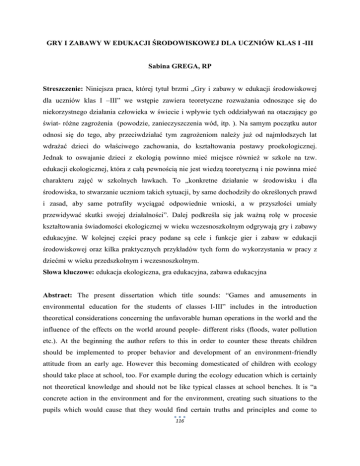 GRY I ZABAWY W EDUKACJI ŚRODOWISKOWEJ DLA UCZNIÓW KLAS I -III Sabina GREGA, RP Streszczenie: Niniejsza praca, której tytuł brzmi „Gry i zabawy w edukacji środowiskowej dla uczniów klas I –III” we wstępie zawiera teoretyczne rozważania odnoszące się do niekorzystnego działania człowieka w świecie i wpływie tych oddziaływań na otaczający go świat- różne zagrożenia (powodzie, zanieczyszczenia wód, itp. ). Na samym początku autor odnosi się do tego, aby przeciwdziałać tym zagrożeniom należy już od najmłodszych lat wdrażać dzieci do właściwego zachowania, do kształtowania postawy proekologicznej. Jednak to oswajanie dzieci z ekologią powinno mieć miejsce również w szkole na tzw. edukacji ekologicznej, która z całą pewnością nie jest wiedzą teoretyczną i nie powinna mieć charakteru zajęć w szkolnych ławkach. To „konkretne działanie w środowisku i dla środowiska, to stwarzanie uczniom takich sytuacji, by same dochodziły do określonych prawd i zasad, aby same potrafiły wyciągać odpowiednie wnioski, a w przyszłości umiały przewidywać skutki swojej działalności”. Dalej podkreśla się jak ważną rolę w procesie kształtowania świadomości ekologicznej w wieku wczesnoszkolnym odgrywają gry i zabawy edukacyjne. W kolejnej części pracy podane są cele i funkcje gier i zabaw w edukacji środowiskowej oraz kilka praktycznych przykładów tych form do wykorzystania w pracy z dziećmi w wieku przedszkolnym i wczesnoszkolnym. Słowa kluczowe: edukacja ekologiczna, gra edukacyjna, zabawa edukacyjna Abstract: The present dissertation which title sounds: “Games and amusements in environmental education for the students of classes I-III” includes in the introduction theoretical considerations concerning the unfavorable human operations in the world and the influence of the effects on the world around people- different risks (floods, water pollution etc.). At the beginning the author refers to this in order to counter these threats children should be implemented to proper behavior and development of an environment-friendly attitude from an early age. However this becoming domesticated of children with ecology should take place at school, too. For example during the ecology education which is certainly not theoretical knowledge and should not be like typical classes at school benches. It is “a concrete action in the environment and for the environment, creating such situations to the pupils which would cause that they would find certain truths and principles and come to 116 adequate conclusions themselves and were able to predict the effects of their activities in the future”. Further there is emphasized the importance of games and amusements in the environmental education for the process of development of the environmental awareness at the preschool age. In the next part of the dissertation there are listed the aims and functions of games and amusements in the environmental education and some practical examples of this kinds for using them during working with children at the preschool and early-school age. Key words: environmental education, game in the environmental education, amusement in the environmental education Zainteresowanie środowiskiem i jego ochroną wzrasta systematycznie a powodów tego jest bardzo wiele, m.in. szybki postęp techniczny, wyczerpywanie się zasobów naturalnych, zaburzenia równowagi ekologicznej czy postępująca urbanizacja. Skutki działania tych czynników są coraz bardziej odczuwalne przez społeczeństwa w postaci niedostatków czystej wody, zanieczyszczenia powietrza, wielu różnorodnych chorób oraz anomalii klimatycznych. Zatem aby przeciwdziałać zagrożeniom, które już istnieją i zapobiegać pojawianiu się nowych, należy poprzez odpowiednio zorganizowaną edukację przygotowywać społeczeństwa do racjonalnego, świadomego i w pełni odpowiedzialnego korzystania z zasobów przyrody oraz podejmowania wszelkich działań na rzecz środowiska. 1 Aby zahamować degradację środowiska, poprawić jakość naszego życia i zdrowia oraz zapewnić perspektywy godziwego życia przyszłym pokoleniom edukacja ekologiczna winna obejmować wszystkich ludzi bez wyjątku. U najmłodszych konieczne jest kształtowanie postaw, z kolei dorośli muszą zmieniać swoje przyzwyczajenia, by stawać się świadomymi uczestnikami środowiska. Jak napisał James Hindson „ludzie są zainteresowani ekologią tak długo, jak długo nie ma to specjalnego wpływu na ich codzienne życie, kiedy mogą mieć wszystko to, do czego się przyzwyczaili, krok dalej wymaga wyższej świadomości akceptującej wyrzeczenia”. Dlatego ciężko jest uczyć dorosłych zmieniać przyzwyczajenia i nawyki, świadomie wyrzekać się wszelkich wygód. Z tego powodu więc, edukacją ekologiczną w pierwszej kolejności należy objąć dzieci. Najmłodsi nie mają jeszcze wykształconych i utrwalonych nawyków, stereotypów, dlatego przy udziale odpowiednich form i metod, można skutecznie kształtować ich postawę, która będzie etyczna względem 1 T. Parczewska, Edukacja ekologiczna w przedszkolu, Wydawnictwo Uniwersytetu Marii Curie – Skłodowskiej, Lublin 2009, s.6. 117 środowiska. Należy jedynie dać im szansę, a wyrośnie z nich pokolenie, które rozważnie i świadomie będzie korzystało z darów jakie daje nam Ziemia.2 Jak pisze Lidia Wołoszynowa dziecko w młodszym wieku szkolnym jest szczególnie wrażliwe na to co je otacza, zarówno na piękno przyrody, jak i na szkody jej zadawane. Kontakt dziecka z przyrodą ma charakter niezwykle emocjonalny, a działania mające na celu utrzymanie tego kontaktu prowadzą do rozwijania postaw proekologicznych. To właśnie na etapie edukacji wczesnoszkolnej osiągane są najlepsze wyniki w kształtowaniu świadomości ekologicznej.3 Rezultatem szeroko pojętej edukacji ekologicznej winna być mądrość, a nie ulotna i krótkotrwała wiedza. Mądrość, która kie