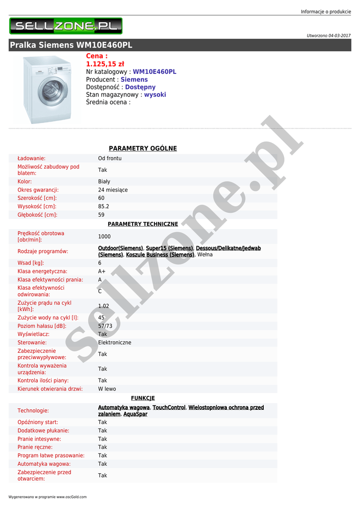 Informacje o produkcie Utworzono 04-03-2017 Pralka Siemens WM10E460PL Cena : 1.125,15 zł Od frontu Możliwość zabudowy pod blatem: Tak Kolor: Biały Okres gwarancji: 24 miesiące Szerokość [cm]: 60 Wysokość [cm]: 85.2 Głębokość [cm]: 59 on Ładowanie: e. PARAMETRY OGÓLNE pl Nr katalogowy : WM10E460PL Producent : Siemens Dostępność : Dostępny Stan magazynowy : wysoki Średnia ocena : PARAMETRY TECHNICZNE 1000 Rodzaje programów: Outdoor(Siemens), Super15 (Siemens), Dessous/Delikatne/Jedwab (Siemens), Koszule Business (Siemens), Wełna Wsad [kg]: 6 Klasa energetyczna: A+ Klasa efektywności prania: A Klasa efektywności odwirowania: C Zużycie prądu na cykl [kWh]: 1.02 Zużycie wody na cykl [l]: 45 Poziom hałasu [dB]: 57/73 Wyświetlacz: Tak Sterowanie: Elektroniczne Zabezpieczenie przeciwwypływowe: Tak Kontrola wyważenia urządzenia: Tak Kontrola ilości piany: Tak Kierunek otwierania drzwi: W lewo se llz Prędkość obrotowa [obr/min]: FUNKCJE Technologie: Automatyka wagowa, TouchControl, Wielostopniowa ochrona przed zalaniem, AquaSpar Opóźniony start: Tak Dodatkowe płukanie: Tak Pranie intesywne: Tak Pranie ręczne: Tak Program łatwe prasowanie: Tak Automatyka wagowa: Tak Zabezpieczenie przed otwarciem: Tak Wygenerowano w programie www.oscGold.com Wskaźnik przebiegu programu se llz on e. pl Inne: