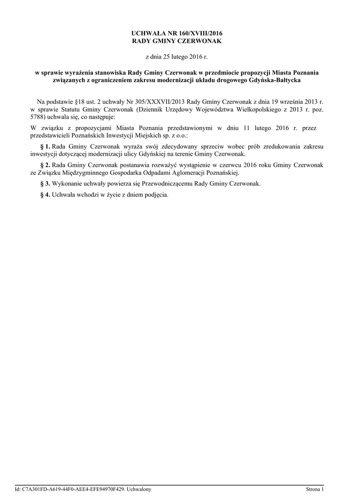 UCHWAŁA NR 160/XVIII/2016 RADY GMINY CZERWONAK z dnia 25 lutego 2016 r. w sprawie wyrażenia stanowiska Rady Gminy Czerwonak w przedmiocie propozycji Miasta Poznania związanych z ograniczeniem zakresu modernizacji układu drogowego Gdyńska-Bałtycka Na podstawie §18 ust. 2 uchwały Nr 305/XXXVII/2013 Rady Gminy Czerwonak z dnia 19 września 2013 r. w sprawie Statutu Gminy Czerwonak (Dziennik Urzędowy Województwa Wielkopolskiego z 2013 r. poz. 5788) uchwala się, co następuje: W związku z propozycjami Miasta Poznania przedstawionymi w dniu 11 lutego 2016 r. przez przedstawicieli Poznańskich Inwestycji Miejskich sp. z o.o.: § 1. Rada Gminy Czerwonak wyraża swój zdecydowany sprzeciw wobec prób zredukowania zakresu inwestycji dotyczącej modernizacji ulicy Gdyńskiej na terenie Gminy Czerwonak. § 2. Rada Gminy Czerwonak postanawia rozważyć wystąpienie w czerwcu 2016 roku Gminy Czerwonak ze Związku Międzygminnego Gospodarka Odpadami Aglomeracji Poznańskiej. § 3. Wykonanie uchwały powierza się Przewodniczącemu Rady Gminy Czerwonak. § 4. Uchwała wchodzi w życie z dniem podjęcia. Id: C7A301FD-A619-44F0-AEE4-EFE94970F429. Uchwalony Strona 1 Uzasadnienie uchwały Rady Gminy Czerwonak w sprawie wyrażenia stanowiska Rady Gminy Czerwonak w przedmiocie propozycji Miasta Poznania związanych z ograniczeniem zakresu modernizacji układu drogowego Gdyńska-Bałtycka W związku z informacjami, jakie zostały przedstawione w dniu 11 lutego 2016 r. przez przedstawicieli Poznańskich Inwestycji Miejskich sp. z o.o., które wskazują na próby ograniczenia zakresu modernizacji ulicy Gdyńskiej na terenie Gminy Czerwonak oraz stoją w sprzeczności względem dotychczas złożonych deklaracji przez Władze Miasta Poznania poprzedniej i obecnej kadencji, Rada Gminy powinna zająć zdecydowane stanowisko w tej sprawie. W trakcie konsultacji społecznych związanych z lokalizacją Instalacji Termicznego Przekształcania Odpadów Komunalnych (ITPOK) na terenie Elektrociepłowni Poznań – Karolin, a także po rozpoczęciu przedmiotowej inwestycji Władze Miasta Poznania wielokrotnie deklarowały modernizację układu drogowego Gdyńska-Bałtycka. Opracowany został projekt modernizacji układu drogowego, określone zostały jego etapy, a inwestycja została rozpoczęta. Projekt, który był przedstawiany mieszkańcom Gminy Czerwonak oraz Władzom Gminy obejmuje na terenie Gminy Czerwonak m.in. budowę dodatkowych pasów drogowych oraz skrzyżowań typu ronda (projekt z 7 września 2012 r.). Propozycje przedstawione w dniu 11 lutego 2016 r. w znaczący sposób ograniczają zakres tej modernizacji. Ponadto należy podkreślić, że zarówno mieszkańcy Gminy Czerwonak negatywnie zaopiniowali lokalizację Instalacji Termicznego Przekształcania Odpadów Komunalnych (m.in. w konsultacjach przeprowadzonych przez Gminę Czerwonak w 2009 roku), jak też w swoich dotychczasowych stanowiskach podtrzymała je Rada Gminy. Rada Gminy w minionych kadencjach dwukrotnie (odpowiednio: 19 czerwca 2009 roku i 12 czerwca 2014 roku) podejmowała uchwały w sprawie wyrażenia stanowiska na temat lokalizacji i budowy Instalacji Termicznego Przekształcania Frakcji Resztkowej Zmieszanych Odpadów Komunalnych (ITPOK), zwanej potocznie spalarnią śmieci. W uchwałach tych wyrażone zostało negatywne stanowisko w sprawie lokalizacji i budowy przedmiotowej inwestycji na terenie Elektrociepłowni Poznań – Karolin. Mimo sprzeciwu społecznego w 2014 roku rozpoczęła się na terenie Poznania/Karolina budowa spalarni śmieci. Inwestycja ta wywoływała i wywołuje nadal wiele kontrowersji i obaw wśród mieszkańców gminy Czerwonak, a w szczególności wśród mieszkańców Koziegłów, którzy w największym stopniu będą narażeni na ewentualne uciążliwości związane z jej funkcjonowaniem. Deklaracja Miasta Poznania dotycząca modernizacji układu drogowego jest natomiast wynikiem treści decyzji o środowiskowych uwarunkowaniach dla przedsięwzięcia polegającego na budowie instalacji termicznego przekształcenia frakcji resztkowej zmieszanych odpadów komunalnych (ITPOK) wydanej w dniu 15 kwietnia 2010r., w której jako warunek wskazano m.in. zmodernizowanie istniejącego w rejonie ITPOK układu komunikacyjnego, a także wynikiem obietnic składanych mieszkańcom gminy przez Władze Poznania, w trakcie protestów, które miały miejsce w trakcie konsultacji. W ocenie wielu mieszkańców Gminy Czerwonak modernizacja układu drogowego w zakresie przedstawianym przed 11 lutego 2016 r. i tak stanowi niewystarczającą rekompensatę za budowę spalarni w pobliżu miejscowości Koziegłowy zamieszkałej przez kilkanaście tysięcy ludzi. Kolejnym istotnym argumentem za przyjęciem niniejszego stanowiska jest także wysoki koszt związany z odbieraniem odpadów od mieszkańców Gminy Czerwonak, który jest ponoszony na skutek udziału Gminy w Związku Międzygminnym Gospodarka Odpadami Aglomeracji Poznańskiej. Po ewentualnym wystąpieniu z tego związku koszty odbioru odpadów ponoszone przez mieszkańców gminy mają realną szansę ulec zmniejszeniu, natomiast zwiększeniu mogą ulec koszty ponoszone z tego tytułu przez mieszkańców Poznania. W zaistniałej sytuacji podjęcie przedmiotowej uchwały przez Radę Gminy na podstawie §18 ust. 2 uchwały Nr 305/XXXVII/2013 Rady Gminy Czerwonak z dnia 19 września 2013 r. w sprawie Statutu Gminy Czerwonak (Dziennik Urzędowy Województwa Wielkopolskiego z 2013 r. poz. 5788) jest w pełni uzasadnione. Id: C7A301FD-A619-44F0-AEE4-EFE94970F429. Uchwalony Strona 1
