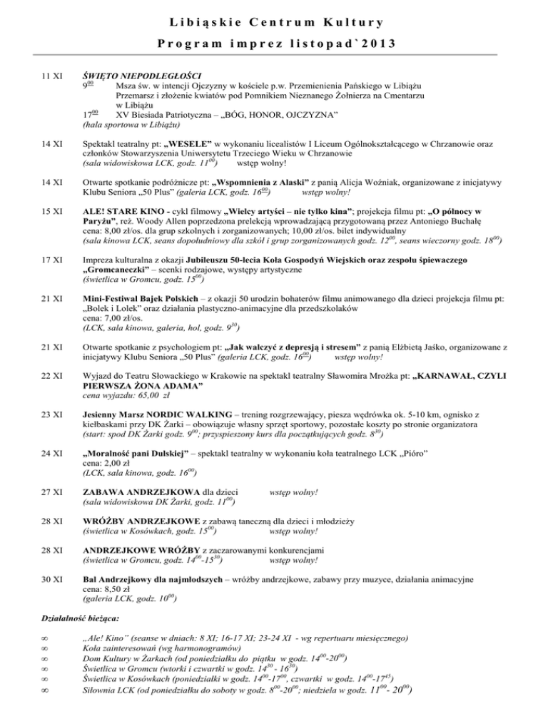 Libiąskie Centrum Kultury Program imprez listopad`2013 11 XI ŚWIĘTO NIEPODLEGŁOŚCI 900 Msza św. w intencji Ojczyzny w kościele p.w. Przemienienia Pańskiego w Libiążu Przemarsz i złożenie kwiatów pod Pomnikiem Nieznanego Żołnierza na Cmentarzu w Libiążu 1700 XV Biesiada Patriotyczna – „BÓG, HONOR, OJCZYZNA” (hala sportowa w Libiążu) 14 XI Spektakl teatralny pt: „WESELE” w wykonaniu licealistów I Liceum Ogólnokształcącego w Chrzanowie oraz członków Stowarzyszenia Uniwersytetu Trzeciego Wieku w Chrzanowie (sala widowiskowa LCK, godz. 1100) wstęp wolny! 14 XI Otwarte spotkanie podróżnicze pt: „Wspomnienia z Alaski” z panią Alicja Woźniak, organizowane z inicjatywy Klubu Seniora „50 Plus” (galeria LCK, godz. 1600) wstęp wolny! 15 XI ALE! STARE KINO - cykl filmowy „Wielcy artyści – nie tylko kina”; projekcja filmu pt: „O północy w Paryżu”, reż. Woody Allen poprzedzona prelekcją wprowadzającą przygotowaną przez Antoniego Buchałę cena: 8,00 zł/os. dla grup szkolnych i zorganizowanych; 10,00 zł/os. bilet indywidualny (sala kinowa LCK, seans dopołudniowy dla szkół i grup zorganizowanych godz. 1200, seans wieczorny godz. 1800) 17 XI Impreza kulturalna z okazji Jubileuszu 50-lecia Koła Gospodyń Wiejskich oraz zespołu śpiewaczego „Gromcaneczki” – scenki rodzajowe, występy artystyczne (świetlica w Gromcu, godz. 1500) 21 XI Mini-Festiwal Bajek Polskich – z okazji 50 urodzin bohaterów filmu animowanego dla dzieci projekcja filmu pt: „Bolek i Lolek” oraz działania plastyczno-animacyjne dla przedszkolaków cena: 7,00 zł/os. (LCK, sala kinowa, galeria, hol, godz. 930) 21 XI Otwarte spotkanie z psychologiem pt: „Jak walczyć z depresją i stresem” z panią Elżbietą Jaśko, organizowane z inicjatywy Klubu Seniora „50 Plus” (galeria LCK, godz. 1600) wstęp wolny! 22 XI Wyjazd do Teatru Słowackiego w Krakowie na spektakl teatralny Sławomira Mrożka pt: „KARNAWAŁ, CZYLI PIERWSZA ŻONA ADAMA” cena wyjazdu: 65,00 zł 23 XI Jesienny Marsz NORDIC WALKING – trening rozgrzewający, piesza wędrówka ok. 5-10 km, ognisko z kiełbaskami przy DK Żarki – obowiązuje własny sprzęt sportowy, pozostałe koszty po stronie organizatora (start: spod DK Żarki godz. 900; przyspieszony kurs dla początkujących godz. 830) 24 XI „Moralność pani Dulskiej” – spektakl teatralny w wykonaniu koła teatralnego LCK „Pióro” cena: 2,00 zł (LCK, sala kinowa, godz. 1600) 27 XI ZABAWA ANDRZEJKOWA dla dzieci (sala widowiskowa DK Żarki, godz. 1100) 28 XI WRÓŻBY ANDRZEJKOWE z zabawą taneczną dla dzieci i młodzieży (świetlica w Kosówkach, godz. 1500) wstęp wolny! 28 XI ANDRZEJKOWE WRÓŻBY z zaczarowanymi konkurencjami (świetlica w Gromcu, godz. 1400-1530) wstęp wolny! 30 XI Bal Andrzejkowy dla najmłodszych – wróżby andrzejkowe, zabawy przy muzyce, działania animacyjne cena: 8,50 zł (galeria LCK, godz. 1000) wstęp wolny! Działalność bieżąca: • • • • • • „Ale! Kino” (seanse w dniach: 8 XI; 16-17 XI; 23-24 XI - wg repertuaru miesięcznego) Koła zainteresowań (wg harmonogramów) Dom Kultury w Żarkach (od poniedziałku do piątku w godz. 1400-2000) Świetlica w Gromcu (wtorki i czwartki w godz. 1430 - 1630) Świetlica w Kosówkach (poniedziałki w godz. 1400-1700, czwartki w godz. 1400-1745) 00 00 Siłownia LCK (od poniedziałku do soboty w godz. 800-2000; niedziela w godz. 11 - 20 )