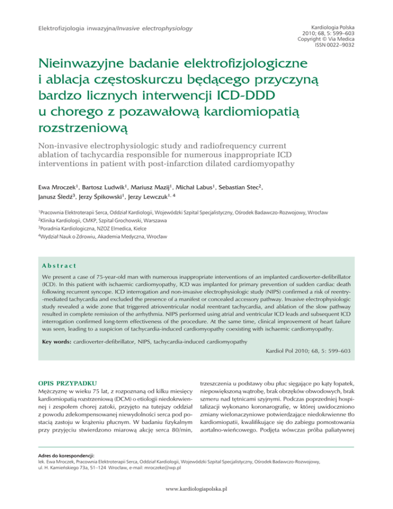 Kardiologia Polska 2010; 68, 5: 599–603 Copyright © Via Medica ISSN 0022–9032 Elektrofizjologia inwazyjna/Invasive electrophysiology Nieinwazyjne badanie elektrofizjologiczne i ablacja częstoskurczu będącego przyczyną bardzo licznych interwencji ICD−DDD u chorego z pozawałową kardiomiopatią rozstrzeniową Non-invasive electrophysiologic study and radiofrequency current ablation of tachycardia responsible for numerous inappropriate ICD interventions in patient with post-infarction dilated cardiomyopathy Ewa Mroczek1, Bartosz Ludwik1, Mariusz Mazij1, Michał Labus1, Sebastian Stec2, Janusz Śledź3, Jerzy Śpikowski1, Jerzy Lewczuk1, 4 1Pracownia Elektroterapii Serca, Oddział Kardiologii, Wojewódzki Szpital Specjalistyczny, Ośrodek Badawczo-Rozwojowy, Wrocław 2Klinika Kardiologii, CMKP, Szpital Grochowski, Warszawa 3Poradnia Kardiologiczna, NZOZ Elmedica, Kielce 4Wydział Nauk o Zdrowiu, Akademia Medyczna, Wrocław Abstract We present a case of 75-year-old man with numerous inappropriate interventions of an implanted cardioverter-defibrillator (ICD). In this patient with ischaemic cardiomyopathy, ICD was implanted for primary prevention of sudden cardiac death following recurrent syncope. ICD interrogation and non-invasive electrophysiologic study (NIPS) confirmed a risk of reentry-mediated tachycardia and excluded the presence of a manifest or concealed accessory pathway. Invasive electrophysiologic study revealed a wide zone that triggered atrioventricular nodal reentrant tachycardia, and ablation of the slow pathway resulted in complete remission of the arrhythmia. NIPS performed using atrial and ventricular ICD leads and subsequent ICD interrogation confirmed long-term effectiveness of the procedure. At the same time, clinical improvement of heart failure was seen, leading to a suspicion of tachycardia-induced cardiomyopathy coexisting with ischaemic cardiomyopathy. Key words: cardioverter-defibrillator, NIPS, tachycardia-induced cardiomyopathy Kardiol Pol 2010; 68, 5: 599–603 OPIS PRZYPADKU Mężczyznę w wieku 75 lat, z rozpoznaną od kilku miesięcy kardiomiopatią rozstrzeniową (DCM) o etiologii niedokrwiennej i zespołem chorej zatoki, przyjęto na tutejszy oddział z powodu zdekompensowanej niewydolności serca pod postacią zastoju w krążeniu płucnym. W badaniu fizykalnym przy przyjęciu stwierdzono miarową akcję serca 80/min, trzeszczenia u podstawy obu płuc sięgające po kąty łopatek, niepowiększoną wątrobę, brak obrzęków obwodowych, brak szmeru nad tętnicami szyjnymi. Podczas poprzedniej hospitalizacji wykonano koronarografię, w której uwidoczniono zmiany wielonaczyniowe potwierdzające niedokrwienne tło kardiomiopatii, kwalifikujące się do zabiegu pomostowania aortalno-wieńcowego. Podjęta wówczas próba paliatywnej Adres do korespondencji: lek. Ewa Mroczek, Pracownia Elektroterapii Serca, Oddział Kardiologii, Wojewódzki Szpital Specjalistyczny, Ośrodek Badawczo-Rozwojowy, ul. H. Kamieńskiego 73a, 51–124 Wrocław, e-mail: [email protected] www.kardiologiapolska.pl 600 Ewa Mroczek et al. PCI-OM nie powiodła się. Pacjent został zdyskwalifikowany z zabiegu pomostowania ze względu na wysokie ryzyko operacyjne (EUROSCORE 7 punktów) oraz wąskie i miażdżycowo zmienione obwody naczyniowe uniemożliwiające wszczepienie pomostów. W badaniu echokardiograficznym stwierdzono znacznie upośledzoną funkcję lewej komory (LVEDD = 72 mm, LA = = 44 mm, RV = 21 mm, EF = 22%, cechy nadciśnienia płucnego, rozległe zaburzenia kurczliwości: przegroda — akineza; koniuszek — akineza; ściana dolna — akineza; w pozostałych odcinkach — hipokinetyczna) oraz łagodną niedomykalność mitralną, aortalną i trójdzielną. W ciągu 6 miesięcy przed hospitalizacją miały miejsce 2 incydenty omdleń o niewyjaśnionym charakterze. W 24-godzinnym monitorowaniu metodą Holtera potwierdzono cechy choroby węzła zatokowego i zarejestrowano bezobjawowy, kilkuminutowy częstoskurcz z wąskimi QRS o częstości około 150/min. Chory dotychczas nigdy nie był hospitalizowany z powodu arytmii i nie zgłaszał typowych kołatań serca. Wobec stwierdzonej DCM i towarzyszących czynników ryzyka (niska frakcja wyrzutowa, omdlenia, zmiany w naczyniach wieńcowych bez możliwości rewaskularyzacji) chorego zakwalifikowano do implantacji kardiowertera-defibrylatora (ICD) w prewencji pierwotnej nagłego zgonu sercowego. W kwietniu 2009 roku pacjentowi wszczepiono ICD-DDD (Lexos DR, Biotronik) z końcówką elektrody przedsionkowej Setrox S53 o aktywnej fiksacji zlokalizowanej w okolicy wiązki Bachmanna oraz końcówką elektrody komorowej Linox SD 65/16 o aktywnej fiksacji zlokalizowanej w środkowej części przegrody międzykomorowej. W leczeniu stosowano: karwedilol (w łącznej dawce dobowej 37,5 mg), furosemid (120 mg/d.) spironolacton (50 mg/d.), kwas acetylosalicylowy (150 mg/d.), cilazapril (0,5 mg/d.), acenocumarol, monoazotan izosorbitu (100 mg/d.), molsidominę (8 mg/d.), atorwastatynę (20 mg/d.). Urządzenie ICD-DDD zaprogramowano na tryb DDD 75/min z częstotliwością programu nocnego 65/min i dynamicznym opóźnieniem przedsionkowo-komorowym. Zaprogramowano 3 strefy detekcji i terapii: dla częstoskurczu komorowego (VT1) strefę 140–175/min, wyłącznie z terapią antyarytmiczną (ATP); dla VT2 strefę 176–199/min z terapią ATP (3 ¥ Burst i 3 ¥ Ramp) oraz kardiowersję i defibrylację (VT 30 J–30 J–6 ¥ 30 J), strefę VF (30 J–30 J–6 ¥ 30 J); ATP-time-out był wyłączony. Podczas kontroli ICD po 3 miesiącach od implantacji zarejestrowano około 700 arytmii w strefie VT1, które w zapisie IEGM odpowiadały arytmii nadkomorowej przerywanej zwykle jednorazową stymulacją antyarytmiczną (ATP) o typie burst, składającą się z maksymalnie 6 pobudzeń. Głównym kryterium kwalifikującym do rozpoczęcia terapii był nagły początek arytmii (zaprogramowany onset SMART 20%, tutaj średnio 30–40%) przy stabilności