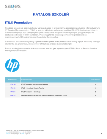 KATALOG SZKOLEŃ ITIL® Foundation Poniższa propozycja obejmuje kursy wprowadzające w problematykę zarządzania usługami informatycznymi (IT Service Management — ITSM) w oparciu bibliotekę najlepszych praktyk ITIL (IT Infrastructure Library). Szkolenia obejmują opis całego cyklu życia zarządzania usługami informatycznymi, przygotowując do zdobycia certyfikatu ITIL® Foundation. Prezentują także zestaw specyficznych przedsięwzięć organizacyjnych, które dają klientom korzyści w formie usług. Szkolenia z prezentowanej oferty są realizowane przez firmę HP która ma istotny wpływ na rozwój samego standardu, co gwarantuje, iż uczestnicy otrzymują wiedzę z pierwszej ręki. Bardzo atrakcyjne uzupełnienie kursu stanowi również gra symulacyjna ITSM - Race to Results Service Management Simulation. Kod szkolenia Nazwa szkolenia HF421M ITIL®Foundation - egzamin certyfikacyjny 1 HF415S ITIL® - Symulacja Race to Results 1 HF421S ITIL®Foundation + Symulacja 3 HF412S Wprowadzenie do Zarządzania Usługami w Oparciu o Bibliotekę ITIL® 1 Sages sp z o.o., ul. Nowogrodzka 62c, 02-002 Warszawa tel: +48 22 2035600 fax: +48 22 2035601 e-mail: [email protected] web: sages.io Powered by TCPDF (www.tcpdf.org) Czas trwania 1