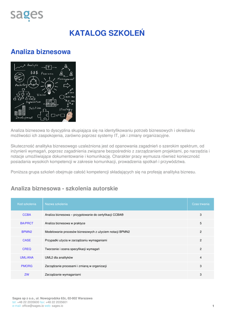 KATALOG SZKOLEŃ Analiza biznesowa Analiza biznesowa to dyscyplina skupiająca się na identyfikowaniu potrzeb biznesowych i określaniu możliwości ich zaspokojenia, zarówno poprzez systemy IT, jak i zmiany organizacyjne. Skuteczność analityka biznesowego uzależniona jest od opanowania zagadnień o szerokim spektrum, od inżynierii wymagań, poprzez zagadnienia związane bezpośrednio z zarządzaniem projektami, po narzędzia i notacje umożliwiające dokumentowanie i komunikację. Charakter pracy wymusza również konieczność posiadania wysokich kompetencji w zakresie komunikacji, prowadzenia spotkań i przywództwa. Poniższa grupa szkoleń obejmuje całość kompetencji składających się na profesję analityka biznesu. Analiza biznesowa - szkolenia autorskie Kod szkolenia CCBA Nazwa szkolenia Czas trwania Analiza biznesowa – przygotowanie do certyfikacji CCBA® 3 Analiza biznesowa w praktyce 5 Modelowanie procesów biznesowych z użyciem notacji BPMN2 2 CASE Przypadki użycia w zarządzaniu wymaganiami 2 CREQ Tworzenie i ocena specyfikacji wymagań 2 UML2 dla analityków 4 Zarządzanie procesami i zmianą w organizacji 3 Zarządzanie wymaganiami 3 BA/PRCT BPMN2 UML/ANA PMORG ZW Sages sp z o.o., ul. Nowogrodzka 62c, 02-002 Warszawa tel: +48 22 2035600 fax: +48 22 2035601 e-mail: [email protected] web: sages.io 1 IIBA® - BABOK® Proponowane szkolenia obejmują zagadnienia ujęte w Business Analysis Body of Knowledge® (BABOK® Guide) definiowanego przez International Institute of Business Analysis. Udział w szkoleniach kwalifikuje do uzyskania Professional Development (PD) oraz Continuing Development Units (CDUs) wymaganych do uzyskania i utrzymania certyfikacji Certification of Competency in Business Analysis™ (CCBA®) i Certified Business Analysis Professional™ (CBAP®), jak również Professional Development Units (PDU), wymaganych przy certyfikacji Project Management Institute®. Szkolenia realizowane są przez firmę HP, która posiada status Endorsed Education Provider organizacji IIBA®. Kod szkolenia Nazwa szkolenia Czas trwania HE551S Podstawy Analizy Biznesowej 3 HE555S Techniki Efektywnego Definiowania Wymagań 3 HE553S Umiejętności Przywódcze w Zawodzie Analityka Biznesu 4 HE552S Umiejętności Zarządzania Projektem w Pracy Analityka Biznesowego 3 REQB i IQBBA Kod szkolenia Nazwa szkolenia IQBBA/FX Egzamin IQBBA Poziom Podstawowy (Foundation Level) 1 REQB/FX Egzamin REQB Poziom Podstawowy (Foundation Level) 1 IQBBA Poziom Podstawowy (Foundation Level) - szkolenie z egzaminem certyfikacyjnym 3 IQBBA/F Przygotowanie do zdobycia certyfikatu IQBBA Poziom Podstawowy (Foundation Level) 3 REQB/F Przygotowanie do zdobycia certyfikatu REQB Poziom Podstawowy (Foundation Level) 2 REQB Poziom Podstawowy (Foundation Level) - szkolenie z egzaminem certyfikacyjnym 2 IQBBA/FFX REQB/FFX Sages sp z o.o., ul. Nowogrodzka 62c, 02-002 Warszawa tel: +48 22 2035600 fax: +48 22 2035601 e-mail: [email protected] web: sages.io Powered by TCPDF (www.tcpdf.org) Czas trwania 2
