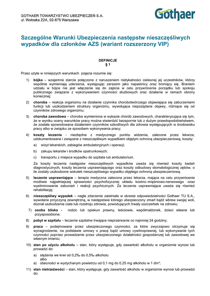 Szczególne Warunki Ubezpieczenia następstw nieszczęśliwych wypadków dla członków AZS (wariant rozszerzony VIP) DEFINICJE §1 Przez użyte w niniejszych warunkach pojęcia rozumie się: 1) bójka – wzajemne starcie połączone z naruszeniem nietykalności cielesnej jej uczestników, którzy wspólnie wymieniają uderzenia, występując zarazem jako napastnicy oraz broniący się. Braniem udziału w bójce nie jest włączenie się do zajścia w celu przywrócenia porządku lub spokoju publicznego związane z wykonywaniem czynności służbowych oraz działanie w ramach obrony koniecznej; 2) choroba – reakcja organizmu na działanie czynnika chorobotwórczego objawiająca się zaburzeniami funkcji lub uszkodzeniem struktury organizmu, wywołująca niepożądane objawy, różniące się od czynników zdrowego organizmu; 3) choroba zawodowa – choroba wymieniona w wykazie chorób zawodowych, charakteryzująca się tym, że w wyniku oceny warunków pracy można stwierdzić bezspornie lub z dużym prawdopodobieństwem, że została spowodowana działaniem czynników szkodliwych dla zdrowia występujących w środowisku pracy albo w związku ze sposobem wykonywania pracy; 4) koszty leczenia - niezbędne z medycznego punktu widzenia, zalecone przez lekarza, udokumentowane i związane z nieszczęśliwym wypadkiem objętym ochroną ubezpieczeniową, koszty: a) wizyt lekarskich, zabiegów ambulatoryjnych i operacji; b) zakupu lekarstw i środków opatrunkowych; c) transportu z miejsca wypadku do szpitala lub ambulatorium. Za koszty leczenia następstw nieszczęśliwych wypadków uważa się również koszty badań diagnostycznych, koszty leczenia usprawniającego oraz koszty odbudowy stomatologicznej zębów, o ile zostały uszkodzone wskutek nieszczęśliwego wypadku objętego ochroną ubezpieczeniową. 5) leczenie usprawniające – terapia medyczna zalecona przez lekarza, mająca na celu przywrócenie możliwie najpełniejszej sprawności psychofizycznej układu kostno–mięśniowo-nerwowego -oraz wyeliminowanie zaburzeń i reakcji psychicznych. Za leczenie usprawniające uważa się również rehabilitację; 6) nieszczęśliwy wypadek – nagłe zdarzenie zaistniałe w okresie odpowiedzialności Gothaer TU S.A., wywołane przyczyną zewnętrzną, w następstwie którego ubezpieczony zmarł bądź wbrew swojej woli, doznał uszkodzenia ciała lub rozstroju zdrowia, powodujących trwały uszczerbek na zdrowiu; 7) osoba bliska przysposobione; rodzic lub opiekun prawny, teściowie, współmałżonek, dzieci własne lub 8) pobyt w szpitalu – leczenie szpitalne trwające nieprzerwanie co najmniej 24 godziny; 9) praca – podejmowane przez ubezpieczonego czynności, za które zwyczajowo otrzymuje się wynagrodzenie, na podstawie umowy o pracę bądź umowy cywilnoprawnej, lub wykonywanie tych czynności poprzez prowadzenie przez ubezpieczonego działalności gospodarczej lub zawodowej we własnym imieniu; 10) stan po użyciu alkoholu – stan, który występuje, gdy zawartość alkoholu w organizmie wynosi lub prowadzi do: a) stężenia we krwi od 0,2‰ do 0,5‰ alkoholu albo a) obecności w wydychanym powietrzu od 0,1 mg do 0,25 mg alkoholu w 1 dm³; 11) stan nietrzeźwości – stan, który występuje, gdy zawartość alkoholu w organizmie wynosi lub prowadzi do: a) stężenia we krwi powyżej 0,5‰ alkoholu albo b) obecności w wydychanym powietrzu powyżej 0,25 mg alkoholu w 1 dm³; 12) szpital – zakład opieki zdrowotnej świadczący całodobową opiekę nad chorymi w zakresie diagnostyki i leczenia, przy wykorzystaniu wykwalifikowanego zespołu lekarskiego i pielęgniarskiego. Za szpital nie uważa się domów opieki, hospicjów, ośrodków leczenia uzależnień oraz szpitali i ośrodków sanatoryjnych, rehabilitacyjnych i wypoczynkowych; 13) środki pomocnicze – wszelkie elementy niezbędne w celu wspomagania procesu leczniczego, takie jak: gorsety, protezy, ortezy, kule, stabilizatory, aparaty ortopedyczne, okulary oraz aparaty słuchowe; 14) świadczenia podstawowe – świadczenia wypłacane w razie zaistnienia zdarzenia objętego ochroną ubezpieczeniową w zakresie następstw nieszczęśliwych wypadków na podstawie SWU; 15) trwały uszczerbek na zdrowiu - naruszenie sprawności organizmu, które powoduje upośledzenie czynności organizmu nierokujące poprawy, określone przez lekarza orzecznika Gothaer TU S.A. na podstawie przedstawionych dokumentów medycznych; 16) „Tabela norm procentowego uszczerbku na zdrowiu” – wykaz uszkodzeń oraz odpowiadający im procentowy przedział uszczerbku na zdrowiu przysługujący za dany uszczerbek. Tabela jest dostępna do wglądu w każdej jednostce organizacyjnej Gothaer TU S.A. oraz na stronie internetowej www.gothaer.pl; 17) ubezpieczający – Akademicki Związek Sportowy (AZS), Zarząd główny 18) ubezpieczony – członkowie AZS, którzy opłacili składkę członkowską na dany rok akademicki, na rachunek których zawarta została umowa ubezpieczenia; 19) uprawniony – osoba upoważniona do otrzymania świadczenia w razie śmierci ubezpieczonego. W razie niewyznaczenia osoby uprawnionej, świadczenie przysługuje członkom rodziny ubezpieczonego według następującej kolejności: a) b) c) d) małżonkowi, dzieciom, rodzicom, innym ustawowym spadkobiercom; 20) wyczynowe uprawianie sportu – forma aktywności fizycznej podejmowana w celu uzyskania, w drodze indywidualnej lub zbiorowej rywalizacji, maksymalnych wyników sportowych, polegająca na uprawianiu przez ubezpieczonego sportu w ramach klubów, związków i organizacji sportowych, m.in. poprzez uczestnictwo w treningach, zawodach, zgrupowaniach i obozach szkoleniowych. Za wyczynowe uprawianie sportu uważa się również uprawianie sportu w celach zarobkowych; PRZEDMIOT UBEZPIECZENIA I ZAKRES OCHRONY UBEZPIECZENIOWEJ §2 1. Przedmiotem ubezpieczenia jest zdrowie i życie ubezpieczonego. 2. Zakres ochrony ubezpieczeniowej obejmuje następstwa nieszczęśliwyc