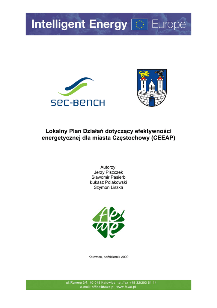 Lokalny Plan Działań dotyczący efektywności energetycznej dla miasta Częstochowy (CEEAP) Autorzy: Jerzy Piszczek Sławomir Pasierb Łukasz Polakowski Szymon Liszka Katowice, październik 2009 Niniejszy dokument opracowany został dzięki pomocy finansowej Unii Europejskiej. Poglądy w niej wyrażone należą do Fundacji na rzecz Efektywnego Wykorzystania Energii i nie odzwierciedlają w żadnym razie oficjalnego stanowiska Unii Europejskiej Spis treści: 1. 2. Wstęp .................................................................................................................. 2 Transpozycja krajowego celu indykatywnego w zakresie oszczędności energii.. 5 2.1 Przełożenie krajowego celu na gospodarkę energetyczną miasta na tle założeń do planu zaopatrzenia w ciepło, energię elektryczną i paliwa gazowe ...... 5 2.2 Ocena zasobów informacyjnych i dokumentacyjnych do budowy i monitorowania Lokalnego Planu Działań .............................................................. 8 3. Opis programów poprawy efektywności energetycznej ..................................... 10 3.1 Środki służące poprawie efektywności energetycznej w obiektach oświatowych.......................................................................................................... 10 3.1.1 Tabela przedstawiająca środki poprawy efektywności energetycznej w obiektach oświatowych .................................................................................. 10 3.1.2 Opis poszczególnych środków poprawy efektywności energetycznej w obiektach oświatowych .................................................................................. 11 3.2 Środki służące poprawie efektywności energetycznej w obiektach użyteczności publicznej......................................................................................... 16 3.2.1 Tabela przedstawiająca środki poprawy efektywności energetycznej w obiektach użyteczności publicznej ................................................................. 16 3.2.2 Opis poszczególnych środków poprawy efektywności energetycznej w sektorze użyteczności publicznej ................................................................... 17 3.3 Środki służące poprawie efektywności energetycznej w sektorze transportu (z wyłączeniem lotnictwa i żeglugi) ....................................................................... 21 3.3.1 Tabela przedstawiająca środki poprawy efektywności energetycznej w sektorze transportu ........................................................................................ 21 3.3.2 Opis poszczególnych środków poprawy efektywności energetycznej w sektorze transportu ........................................................................................ 22 3.4 Środki służące poprawie efektywności energetycznej w sektorze zaopatrzenia miasta w ciepło, energię elektryczną i paliwa gazowe oraz w gospodarce odpadami ....................................................................................... 28 3.4.1 Tabela przedstawiająca środki poprawy efektywności energetycznej w sektorze zaopatrzenia miasta w ciepło, energię elektryczną i paliwa gazowe oraz w gospodarce odpadami ........................................................................... 28 3.4.2 Opis poszczególnych środków poprawy efektywności energetycznej w sektorze zaopatrzenia miasta w ciepło, energie elektryczna i paliwa gazowe oraz w gospodarce odpadami ........................................................................... 28 3.5 Środki służące poprawie efektywności energetycznej w sektorze mieszkalnictwa oraz małych i średnich przedsiębiorstw........................................ 30 3.5.1 Tabela przedstawiająca środki poprawy efektywności energetycznej w sektorze mieszkalnictwa oraz małych i średnich przedsiębiorstw .................. 30 3.5.2 Opis poszczególnych środków poprawy efektywności energetycznej w sektorze mieszkalnictwa oraz małych i średnich przedsiębiorstw ..................... 31 4. Ocena efektów .................................................................................................. 34 4.1 Działania w ramach oceny efektów wdrażania Lokalnego Planu Działań .. 34 5. Podsumowanie .................................................................................................. 36 1 Lokalny Plan Działań dotyczący efektywności energetycznej dla miasta Częstochowy (CEEAP) -------------------------------------------------------------------------------------------------------------------------------------------------------------------------------------------------------------------------- 1. Wstęp Podstawą do opracowania „Lokalnego Planu Działań dotyczącego efektywności energetycznej dla miasta Częstochowy (CEEAP)” jest umowa z dnia 07.03.2009 r. zawarta pomiędzy Gminą Miasto Częstochowa a Fundacją na rzecz Efektywnego Wykorzystania Energii w Katowicach. Podstawę formalno-prawną „Lokalnego Plan Działań dotyczącego efektywności energetycznej dla miasta Częstochowy (CEEAP)” stanowią następujące dokumenty prawne planistyczne: - Ustawa Prawo Energetyczne z dnia 10 kwietnia 1997 z późniejszymi zmianami. - Polityka energetyczna Polski do 2030 roku. Załącznik 3 – Program Działań Wykonawczych na lata 2009 – 2012, Priorytet I. Poprawa Efektywności Energetycznej, Działanie 1.6. Zobowiązanie sektora publicznego do pełnienia wzorcowej roli w oszczędnym gospodarowaniu energią, punkt 4. Rozszerzenie zakresu założeń i planów zaopatrzenia w ciepło, energię elektryczną i paliwa gazowe o planowanie i organizację działań mających na celu racjonalizację zużycia energii i promowanie rozwiązań zmniejszających zużycie energii na obszarze gminy – 2010 r. - dyrektywa 2006/32/WE Parlamentu Europejskiego i rady z dnia 5 kwietnia 2006r. w sprawie efektywności końcowego wykorzystania energii i usług energetycznych. - Proje