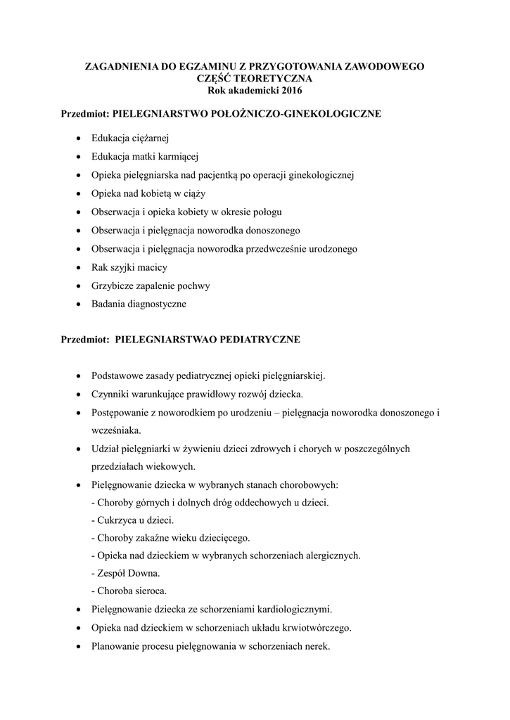 ZAGADNIENIA DO EGZAMINU Z PRZYGOTOWANIA ZAWODOWEGO CZĘŚĆ TEORETYCZNA Rok akademicki 2016 Przedmiot: PIELEGNIARSTWO POŁOŻNICZO-GINEKOLOGICZNE  Edukacja ciężarnej  Edukacja matki karmiącej  Opieka pielęgniarska nad pacjentką po operacji ginekologicznej  Opieka nad kobietą w ciąży  Obserwacja i opieka kobiety w okresie połogu  Obserwacja i pielęgnacja noworodka donoszonego  Obserwacja i pielęgnacja noworodka przedwcześnie urodzonego  Rak szyjki macicy  Grzybicze zapalenie pochwy  Badania diagnostyczne Przedmiot: PIELEGNIARSTWAO PEDIATRYCZNE  Podstawowe zasady pediatrycznej opieki pielęgniarskiej.  Czynniki warunkujące prawidłowy rozwój dziecka.  Postępowanie z noworodkiem po urodzeniu – pielęgnacja noworodka donoszonego i wcześniaka.  Udział pielęgniarki w żywieniu dzieci zdrowych i chorych w poszczególnych przedziałach wiekowych.  Pielęgnowanie dziecka w wybranych stanach chorobowych: - Choroby górnych i dolnych dróg oddechowych u dzieci. - Cukrzyca u dzieci. - Choroby zakaźne wieku dziecięcego. - Opieka nad dzieckiem w wybranych schorzeniach alergicznych. - Zespół Downa. - Choroba sieroca.  Pielęgnowanie dziecka ze schorzeniami kardiologicznymi.  Opieka nad dzieckiem w schorzeniach układu krwiotwórczego.  Planowanie procesu pielęgnowania w schorzeniach nerek.  Opieka pielęgniarska nad dziećmi ze schorzeniami układu pokarmowego.  Pielęgnowanie dziecka ze schorzeniami endokrynologicznymi.  Drgawki u dzieci  Obserwacja dziecka w zależności od stanu zdrowia i wieku dziecka.  Dokumentacja dziecka hospitalizowanego.  Pomiar podstawowych parametrów życiowych.  Udział pielęgniarki w przygotowaniu dzieci do badań diagnostycznych.  Techniki dostarczania pokarmów fizjologicznych dla wieku dziecka.  Drogi podawania leków u dzieci.  Obliczanie dawek pediatrycznych. Przedmiot: ANESTEZJIOLOGIA I PIELĘGNIARSTWO W ZAGROŻENIU ŻYCIA 1. Zasady monitorowania podstawowych funkcji życiowych na Oddziale Intensywnej Terapii oraz podczas znieczulenia na Bloku Operacyjnym (inwazyjne i nieinwazyjne) 2. Intensywna opieka pielęgniarska nad pacjentem nieprzytomnym (pacjent dorosły, dziecko, niemowlę) 3. Zasady i metody wentylacji mechanicznej 4. Rodzaje znieczulenia: metody, leki, środki anestetyczne, aparatura. 5. Obraz kliniczny najczęstszych stanów zagrożenia życia: a. Nagłe zatrzymanie krążenia; b. Ostra niewydolność oddechowa; c. Śpiączka hipo- i hiperglikemiczna; d. Wstrząs e. Obrzęk płuc Przedmiot: PIELĘGNIARSTWO PSYCHIATRYCZNE  Pielęgnowanie chorego ze schizofrenią.  Opieka pielęgniarska nad pacjentem z zaburzeniami depresyjnymi..  Obserwacja chorych psychicznie, rewers – ścisła obserwacja.  Skale do oceny stanu psychiczno-fizycznego chorych psychicznie (skale pielęgniarskie)  Opieka pielęgniarska nad chorym z zespołem maniakalnym.  Pielęgnowanie chorego z zaburzeniami lękowymi.  Postępowanie z pacjentem z zaburzeniami osobowości.  Formy pośrednie lecznictwa psychiatrycznego.  Stosowanie przymus bezpośredniego w psychiatrii – rola i zadania pielęgniarki.  Postępowanie z pacjentem przejawiającym zachowania gwałtowne i agresywne.  Fazy kontaktu terapeutycznego pielęgniarka – chory psychicznie.  Terapeutyczne i nieterapeutyczne formy kontaktu pielęgniarki z chorym psychicznie.  Udział pielęgniarki w procesie diagnostycznym i terapeutycznym chorych psychicznie – udział w leczeniu farmakologicznym chorych psychicznie, leczeniu wstrząsami elektrycznymi).  Zasady rehabilitacji chorych psychicznie.  Zasady organizowania i współuczestniczenia w społeczności terapeutycznej chorych psychicznie. Przedmiot: PIELĘGNIARSTWO NEUROLOGICZNE  Postępowanie pielęgniarskie w udarach mózgowych.  Postępowanie pielęgniarskie wobec pacjenta z afazją.  Zasady pielęgnowania pacjenta z polineuropatią.  Postępowanie pielęgniarskie wobec pacjentów z miastenią.  Problemy pielęgnacyjne pacjentów z otępieniem.  Procedury postępowania pielęgniarskiego w najczęściej spotykanych objawach SM.  Pielęgnowanie pacjentów z padaczką  Procedury postępowania pielęgniarskiego w chorobie Parkinsona.  Postępowanie z pacjentami z zespołami korzeniowymi  Zasady postępowania pielęgniarskiego w zapaleniu opon mózgowordzeniowych. Przedmiot: PIELĘGNIARSTWO INTERNISTYCZNE 1. Pierwotna i wtórna profilaktyka chorób układu krążenia. 2. Przygotowanie chorego do badań układu krążenia (echokardiografia, EKG spoczynkowe, cewnikowanie serca, koronarografia). Opieka nad chorym po wykonaniu badań. 3. Nadciśnienie tętnicze- zagadnienia edukacji zdrowotnej, profilaktyki, kontroli ciśnienia tętniczego. Zasady pomiaru ciśnienia tętniczego. 4. Proces pielęgnowania w przewlekłej niewydolności krążenia. 5.Cukrzyca. Postępowanie niefarmakologiczne (styl życia, dieta). Leczenie farmakologiczne. Zasady samokontroli. Profilaktyka powikłań. Zasady insulinoterapii. 6. Zasady diety w cukrzycy typu 1 lub typu 2. Zastosowanie wymienników węglowodanowych w diecie. Pojęcie indeksu glikemicznego. Zagadnienia edukacji terapeutycznej w cukrzycy. 7. Otyłość. Niedożywienie. Problemy pielęgnacyjne i edukacja terapeutyczna w zaburzeniach odżywiania. 8. Podstawy leczenia dietetycznego. Proces pielęgnowania chorego w chorobie wrzodowej żołądka i dwunastnicy. 9. Marskość wątroby. Opieka nad chorym z encefalopatią wątrobową. 10. Profilaktyka i leczenie zaparć. Standardy postępowania w zaparciach. 11. Pierwotna i wtórna profilaktyka schorzeń układu oddechowego. 12. Zasady i sposoby postępowania w duszności. Astma oskrzelowa i POChP– proces pielęgnowania, monitorowanie skuteczności leczenia. Edukacja terapeutyczna chorego na astmę i POChP. Zapalenie płuc i opłucnej -proces pielęgnowania. 13. Postępowanie w przypadku wystąpienia wstrząsu anafilaktycznego. 14.Badania diagnostyczne w schorzeniach układu moczowego (badanie moczu ogólne, na posiew, badania klirensowe, biopsja nerek, dobowa zbiórka moczu)