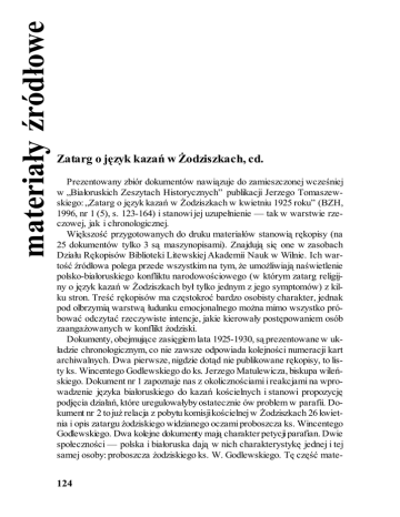 materiały źródłowe Zatarg o język kazań w Żodziszkach, cd. Prezentowany zbiór dokumentów nawiązuje do zamieszczonej wcześniej w „Białoruskich Zeszytach Historycznych” publikacji Jerzego Tomaszewskiego: „Zatarg o język kazań w Żodziszkach w kwietniu 1925 roku” (BZH, 1996, nr 1 (5), s. 123-164) i stanowi jej uzupełnienie — tak w warstwie rzeczowej, jak i chronologicznej. Większość przygotowanych do druku materiałów stanowią rękopisy (na 25 dokumentów tylko 3 są maszynopisami). Znajdują się one w zasobach Działu Rękopisów Biblioteki Litewskiej Akademii Nauk w Wilnie. Ich wartość źródłowa polega przede wszystkim na tym, że umożliwiają naświetlenie polsko-białoruskiego konfliktu narodowościowego (w którym zatarg religijny o język kazań w Żodziszkach był tylko jednym z jego symptomów) z kilku stron. Treść rękopisów ma częstokroć bardzo osobisty charakter, jednak pod olbrzymią warstwą łudunku emocjonalnego można mimo wszystko próbować odczytać rzeczywiste intencje, jakie kierowały postępowaniem osób zaangażowanych w konflikt żodziski. Dokumenty, obejmujące zasięgiem lata 1925-1930, są prezentowane w układzie chronologicznym, co nie zawsze odpowiada kolejności numeracji kart archiwalnych. Dwa pierwsze, nigdzie dotąd nie publikowane rękopisy, to listy ks. Wincentego Godlewskiego do ks. Jerzego Matulewicza, biskupa wileńskiego. Dokument nr 1 zapoznaje nas z okolicznościami i reakcjami na wprowadzenie języka białoruskiego do kazań kościelnych i stanowi propozycję podjęcia działań, które uregulowałyby ostatecznie ów problem w parafii. Dokument nr 2 to już relacja z pobytu komisji kościelnej w Żodziszkach 26 kwietnia i opis zatargu żodziskiego widzianego oczami proboszcza ks. Wincentego Godlewskiego. Dwa kolejne dokumenty mają charakter petycji parafian. Dwie społeczności — polska i białoruska dają w nich charakterystykę jednej i tej samej osoby: proboszcza żodziskiego ks. W. Godlewskiego. Tę część mate- 124 riałów kończą dwa pisma procesowe z 1926 roku z rozprawy sądowej toczonej przeciwko ks. W. Godlewskiemu. Dokument nr 5 informuje nas, jakie zarzuty postawiono ks. Godlewskiemu i kto świadczył w procesie (interesujące jest choćby skonfrontowanie listy świadków z podpisami pod petycją społeczności polskiej parafii żodziskiej do ks. Olszańskiego), a dokument nr 6 zapoznaje nas z wysokością wydanego wyroku i linią obrony prezentowaną przez adwokata ks. Godlewskiego na procesie apelacyjnym. Najliczniejszą grupę dokumentów (nr 7-24) stanowią listy nowo mianowanego (maj 1927 r.) na parafię żodziską proboszcza ks. Romualda Dronicza do ks. Romualda Jałbrzykowskiego, od 1926 roku arcybiskupa wileńskiego (aresztowanie w 1925 roku ks. W. Godlewskiego zbiegło się z odejściem z biskupstwa wileńskiego ks. Jerzego Matulewicza). Chociaż korespondencja ta trwała od lata 1927 roku aż do wybuchu wojny, dla potrzeb niniejszego tematu kończy się na roku 1930. Z tego bowiem roku pochodzi dokument wystawiony przez Kurię Wileńską dla Ministerstwa Wyznań Religijnych i Oświecenia Publicznego. Dokument ów stanowi znakomity przykład postrzegania przez Kurię stosunków narodowościowych w parafiach Archidiecezji Wileńskiej, w czym z pewnością utwierdzała ją treść korespondencji ks. R. Dronicza. Przygotowując niniejsze materiały do publikacji dostosowano się do formy zaproponowanej wcześniej przez J. Tomaszewskiego, a mianowicie zachowano oryginalną pisownię z lat międzywojennych ze wszystkimi jej osobliwościami i błędami. Trzy dokumenty (nr 1, 2, 4) oraz jeden przypis (nr 13) zaprezentowano w języku białoruskim alfabetem łacińskim, co jest zgodne z oryginałami. W dokumencie nr 4 część podpisów w oryginale wykonana została cyrylicą, co podkreślono informacją ujętą w nawiasie: [cyr.]. Małgorzata Moroz (Białystok) 125 Biblioteka LitewskiejAkademii Nauk — Dział Rękopisów; F-318-10967: Korespondencja do Kurii Wileńskiej w sprawie używania języka białoruskiego w kościele w Żodziszkach. Listy ks. Wincentego Godlewskiego, proboszcza żodziskiego, do biskupa wileńskiego ks. Jerzego Matulewicza. 1 List 1. Oryg., rkps [k. 14] Jaho Ekscelencyi Wilenskamu Biskupu Rapart Żodzišnaha probašča Spaúniajučy zahad Wašaj Ekscelencyi z dn. 11.XI. 24 h. za N= 3687 było zaraz-ža uviedziana u Žodzišny kaścioł kazańnie u polskaj mowie, pry hetym było abvieščsana z ambony ab vyšej-uspomnienym zahadzie Wašaj Ekscelencyi, kab usie žadajučyja słuchać słowa Božaje pa polsku, wiedali ab hetym i astawalisia pa sumie u kaściele. U pieršuju niadzielu astałosia słuchać polskaha kazańnia kala 40 asob, u druhuju niadzielu krychu mieniej — asob 25-30 i hetaja ličba asob mieniej-bolej astavałasia u kožnuju niadzielu i świata až da Kalad. Na pieršy dzień Kalad ja zrabiú publična padrachunak asob, słuchajučych polskaj navuki: było u kaściele mužčyn 6 (šeść), a kabiet 15 (piatnaccać), razam 21 asoba. Takdyž pa kazańni zrabiú uvahu, što hatkaja małaja ličba vyhladaje u kaściele nadta sumna i zaachvačyvaú, kab staralisia u balšym liku astavacca i zbiracca na polskuju navuku. Hetajež zaachvačwańnie ja paútaryú na Novy Hod pry poúnym kaściele narodu na biełaruskaj navucy ú časie sumy, adnak i u toj dzień astałosia słuchać polskaje navuki nia bolej 25 asob. Hetaja ličba słuchačaú (mieniej-bolej 20-25 asob) užo pakazvaje na stały lik žadajučych [k. 14v.] słuchać navuki pa polsku, pry hetym mužčyn astajecca zaúsiahdy 5-7 asob, a žančyn razna, ale nie bolej 20-25 asob. Saúsim inakš vyhladaje sprawa z biełaruskimi navukami — tahdy ludziej poúny kaścioł, navat bolej prychodzić ciapier, čym heta było daúniej pierad uviadzieńniem biełaruskaj movy ú kaścioł. Jašče mušu adznačyć, što ludzi słuchajuć z bolšaj uvahaj biełaruskaj navuki, čym słuchali daúniej polskaj