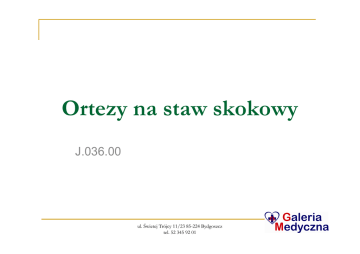 Ortezy na staw skokowy J.036.00 ul. Świetej Trójcy 11/23 85-224 Bydgoszcz tel. 52 345 92 01 Stabilizator stawu skokowego Zamst A2-DX Stabilizator Zamst daje duży komfort i ulgę w schorzeniach podczas uprawiania sportu. Cechy produktu: zapewnia bardzo dobrą stabilizację w obu kierunkach, posiada wewnętrzne i zewnętrzne paski antypoślizgowe, krzyżujące się taśmy przednie zapewniają stabilizację przednią - efekt tapingu. Zastosowanie: skręcenia stawu skokowego, nawykowe skręcenia stawu skokowego, profilaktyka urazów. J.036.00 ul. Świetej Trójcy 11/23 85-224 Bydgoszcz tel. 52 345 92 01 Stabilizator na kostkę Actimove® TaloCast-AirGel BSN Medical Talocast Airgel orteza stawu skokowego wyposażona w wyściółkę żelowo – powietrzną. Cechy produktu: zapewniająca wysoką stabilizację, masaż, równomierna kompresję, dopasowuje się do zmieniających stanów anatomicznych kostki. Wypełnienie żelowe pozwala na stosowanie terapii zimnem w celu uśmierzaniu bólu przy obrzękach. Wskazania: skręcenie stawu skokowego, stany wymagające stabilizacji stawu skokowego, profilaktyka w sporcie, chroniczna niestabilność stawu skokowego, pooperacyjne zaopatrzenie uszkodzeń. Rozmiar uniwersalny w wersji na prawą lub lewą stopę. J.036.00 ul. Świetej Trójcy 11/23 85-224 Bydgoszcz tel. 52 345 92 01 Stabilizator stawu skokowego z usztywnieniami S-04 Cechy produktu: wykonany z termoaktywnego neoprenu, posiada usztywnienia boczne – podwójne łupki o profilu anatomicznym wykonane z tworzywa sztucznego, rozgrzewa układ stawowo-mięśniowy i więzadłowy, odciąża ścięgno Achillesa, wzmacnia osłabione i przeciążone stawy skokowe, chroni i odciąża staw skokowy poprzez wygodny ucisk i stabilizację więzadeł, dzięki otworom na piętę oraz palce nie krępuje ruchów, regulacja zapięcia oraz system taśm umożliwia dopasowanie siły docisku i stabilizacji do indywidualnych potrzeb. Dostępne rozmiary (obwód wokół kostki): S/M 15 - 25 cm, L/XL 25 – 35 cm. J.036.00 ul. Świetej Trójcy 11/23 85-224 Bydgoszcz tel. 52 345 92 01 Protect Ankel lace up Ankel lace up to funkcjonalna orteza posiadająca dodatkowe wkładki stabilizujące. Cechy produktu: Sznurowania zapewniają komfort właściwego dopasowania. Specjalnie opracowana budowa sprawia, że orteza jest uniwersalna i nadaje się na prawą jak i lewą stopę, a dodatkowo jest przystosowana do noszenia w normalnym obuwiu. Wskazania: zachowawcze jak i pooperacyjne zaopatrzenie uszkodzeń więzadeł w obrębie stawu skokowego, skręcenie stawu skokowego, chroniczna niestabilność. Dostępne rozmiary: S, M, L, XL. J.036.00 ul. Świetej Trójcy 11/23 85-224 Bydgoszcz tel. 52 345 92 01 BSN Actimove orteza stawu skokowego Talostep Actimove TaloStep jest lekka i ma cienki profil. Dopasowuje się do każdego rodzaju obuwia, jednocześnie zapewniając bezpieczeństwo i stabilizację stawu. Cechy produktu: posiada wyjmowane wsuwki łuskowe, pokryte specjalnym żelem 3D działającym jako zimny kompres- ogranicza opuchliznę i ból, oddychający materiał ogranicza pocenie i wchłania wilgoć ze skóry, zaprojektowana, tak aby zapewnić odpowiednią stabilizację i kompresję stawu. Wskazania: uszkodzenia więzadeł i torebki stawowej w górnej części stawu skokowego, chroniczna niestabilność stawu skokowego, lekkie urazy tkanek miękkich, ostra, chroniczna i zapalna odma. J.036.00 ul. Świetej Trójcy 11/23 85-224 Bydgoszcz tel. 52 345 92 01 EMO LIF100 ORTEZA NA OPADAJĄCĄ STOPĘ Orteza Lifter - na opadającą stopę do obuwia sznurowanego. Utrzymuje przodostopie w prawidłowej pozycji co zapobiega zaczepianiu stopą o podłoże w trakcie chodzenia. Koryguje pozycje pięty w fazie stawiania stopy. Elementy ortezy mają za zadanie kompensować ograniczone funkcjonowanie porażonych mięśni oraz ścięgien. Cechy produktu: estetyczne wykonanie, prostota i funkcjonalność, należy używać w bucie sznurowanym lub zapinanym na rzep, dyskretny wygląd - prawie niezauważalny, wykonany z nowoczesnego "oddychającego" materiału, zapinanie i regulacja za pomocą micro-velcro, strefy komfortu ze specjalnym wyścieleniem w okolicy ścięgna Achillesa Wskazania: opadająca stopa wskutek różnego rodzaju schorzeń Rozmiar dobieramy mierząc obwód stawu skokowego wokół kostki. J.036.00 ul. Świetej Trójcy 11/23 85-224 Bydgoszcz tel. 52 345 92 01 J.036.01 ul. Świetej Trójcy 11/23 85-224 Bydgoszcz tel. 52 345 92 01 Stabilizator stawu skokowego Zamst A2-DX Stabilizator Zamst daje duży komfort i ulgę w schorzeniach podczas uprawiania sportu. Cechy produktu: zapewnia bardzo dobrą stabilizację w obu kierunkach, posiada wewnętrzne i zewnętrzne paski antypoślizgowe, krzyżujące się taśmy przednie zapewniają stabilizację przednią efekt tapingu. Zastosowanie: skręcenia stawu skokowego, nawykowe skręcenia stawu skokowego, profilaktyka urazów. J.036.01 ul. Świetej Trójcy 11/23 85-224 Bydgoszcz tel. 52 345 92 01 Stabilizator na kostkę Actimove® TaloCast-AirGel BSN Medical Talocast Airgel orteza stawu skokowego wyposażona w wyściółkę żelowo – powietrzną. Cechy produktu: zapewniająca wysoką stabilizację, masaż, równomierna kompresję, dopasowuje się do zmieniających stanów anatomicznych kostki. Wypełnienie żelowe pozwala na stosowanie terapii zimnem w celu uśmierzaniu bólu przy obrzękach. Wskazania: skręcenie stawu skokowego, stany wymagające stabilizacji stawu skokowego, profilaktyka w sporcie, chroniczna niestabilność stawu skokowego, pooperacyjne zaopatrzenie uszkodzeń. Rozmiar uniwersalny w wersji na prawą lub lewą stopę. J.036.01 ul. Świetej Trójcy 11/23 85-224 Bydgoszcz tel. 52 345 92 01 Protect Ankel lace up Ankel lace up to funkcjonalna orteza posiadająca dodatkowe wkładki stabilizujące. Cechy produktu: Sznurowania zapewniają komfort właściwego dopasowania. Specjalnie opracowana budowa sprawia, że orteza jest uniwersalna i nadaje się na prawą jak i lewą stopę, a 