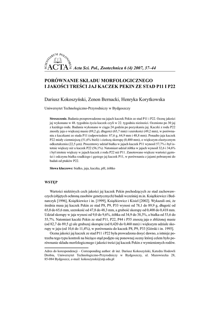 Acta Sci. Pol., Zootechnica 6 (4) 2007, 37–44 PORÓWNANIE SKŁADU MORFOLOGICZNEGO I JAKOŚCI TREŚCI JAJ KACZEK PEKIN ZE STAD P11 I P22 Dariusz Kokoszyński, Zenon Bernacki, Henryka Korytkowska Uniwersytet Technologiczno-Przyrodniczy w Bydgoszczy Streszczenie. Badania przeprowadzono na jajach kaczek Pekin ze stad P11 i P22. Ocenę jakości jaj wykonano w 48. tygodniu życia kaczek czyli w 22. tygodniu nieśności. Oceniono po 30 jaj z każdego rodu. Badania wykonano w ciągu 24 godzin po pozyskaniu jaj. Kaczki z rodu P22 znosiły jaja o większej masie (89,2 g), długości (65,7 mm) i szerokości (49,2 mm), w porównaniu z kaczkami ze stada P11 (odpowiednio: 87,6 g, 64,9 mm i 48,8 mm). Ponadto jaja kaczek P22 miały ciemniejszą (51,6% bieli) i cieńszą skorupę (0,400 mm), o większym elastycznym odkształceniu (22,5 µm). Procentowy udział białka w jajach kaczek P11 wynosił 57,7% i był istotnie większy niż u kaczek P22 (56,1%). Natomiast udział żółtka w jajach wynosił 32,6 i 34,6% i był istotnie większy w jajach kaczek z rodu P22 niż P11. Zanotowano większe wartości gęstości i odczynu białka rzadkiego i gęstego jaj kaczek P11, w porównaniu z jajami pobranymi do badań od ptaków P22. Słowa kluczowe: białko, jaja, kaczka, pH, żółtko WSTĘP Wartości niektórych cech jakości jaj kaczek Pekin pochodzących ze stad zachowawczych (objętych ochroną zasobów genetycznych) badali wcześniej m.in. Książkiewicz i Bednarczyk [1996], Książkiewicz i in. [1999], Książkiewicz i Kisiel [2002]. Wykazali oni, że średnia masa jaj kaczek Pekin ze stad P8, P9, P33 wynosi od 78,1 do 89,9 g, długość od 65,0 do 65,6 mm, szerokość od 47,8 do 48,3 mm, a grubość skorupy od 0,400 do 0,418 mm. Udział skorupy w jaja wynosi od 9,0 do 9,6%, żółtka od 34,9 do 38,3%, a białka od 53,6 do 55,7%. Natomiast kaczki Pekin ze stad P11, P22, P44 i P55 znoszą jaja o zbliżonej masie (od 82,7 do 89,5 g) ale grubszej skorupie (od 0,420 do 0,460 mm) i większym udziale skorupy w jaju (od 10,6 do 11,4%), w porównaniu do kaczek P8, P9, P33 [Górski i in. 1995]. Ocena jakości jaj kaczek ze stad P11 i P22 była prowadzona dosyć dawno, a istnieje potrzeba tego typu kontroli na bieżąco stąd podjęto się ponownej oceny której celem było porównanie składu morfologicznego i jakości treści jaj kaczek Pekin z wymienionych rodów. Adres do korespondencji – Corresponding author: dr inż. Dariusz Kokoszyński, Katedra Hodowli Drobiu, Uniwersytet Technologiczno-Przyrodniczy w Bydgoszczy, ul. Mazowiecka 28, 85-084 Bydgoszcz, e-mail: [email protected] 38 D. Kokoszyński i in. MATERIAŁ I METODY Badania przeprowadzono w Katedrze Hodowli Drobiu Wydziału Hodowli i Biologii Zwierząt Uniwersytetu Technologiczno-Przyrodniczego w Bydgoszczy. Materiał doświadczalny stanowiły jaja kaczek Pekin ze stad zachowawczych P11 i P22. W okresie pozyskiwania jaj do badań ptaki przebywały w tym samym budynku, z dostępem do wybiegu i były żywione przemysłowymi mieszankami treściwymi dla drobiu wodnego. Jaja z gniazd zamykanych (okres indywidualnej nieśności) zbierano od godziny 6 rano. Po zbiorze jaja odkażano 1% roztworem Virkonu. Ocenę składu morfologicznego i cech fizycznych jaja wykonano w 48. tygodniu życia kaczek będących w 22. tygodniu nieśności. Z każdego rodu oceniano po 30 jaj. Badania wykonano w ciągu 24 godzin po pozyskaniu jaj. Masę jaj (g) oznaczono na wadze laboratoryjnej Medicat. Suwmiarką elektroniczną zmierzono długość (oś długa) i szerokość (oś krótka) jaja. Stosunek szerokości do długości wyrażony w procentach stanowił indeks kształtu jaja. Do obliczenia powierzchni skorupy jaja (cm2) zastosowano wzór Paganelliego i in. [1974]: Ps = 4,835 x W0,662, gdzie W = masa jaja. Elastyczne odkształcenie skorupy (µm·cm–2) określono za pomocą aparatu Marius. Barwę skorupy (% bieli) zmierzono za pomocą reflektometru QCR angielskiej firmy TSS. Po wybiciu treści jaja na szklany stolik z lustrem, zmierzono aparatem QCD firmy TSS, wysokość żółtka i białka gęstego. Proporcja wysokości białka gęstego do jego średniej średnicy stanowiła jego indeks. Suwmiarką wzdłuż linii chalaz określono średnicę żółtka (mm). Stosunek wysokości żółtka do jego średnicy wyrażony w procentach, stanowił indeks żółtka. Barwę żółtka określono za pomocą 15-stopniowej skali La Roche’a. Po wykonaniu oznaczeń na wybitej treści jaja wyodrębniono białko rzadkie, białko gęste i żółtko na których przy użyciu elektrody uniwersalnej do mierzenia pH w substancjach płynnych podłączonej do pH-metru CP-401 oznaczono odczyn. Wyznaczono również gęstość żółtka i obu frakcji białka (g · cm–3) za pomocą zestawu do wyznaczania gęstości cieczy z zastosowaniem programu wagi WPS 360C firmy RADWAG. Skorupę po wybiciu treści jaja suszono przez trzy godziny w temperaturze 105˚C w suszarce typu SUP 100 M. Następnie na wadze Medicat oceniano masę skorupy (g), a elektroniczną śrubą mikrometryczną na osi krótkiej jej grubość w milimetrach Z różnicy między masą jaja, a masą żółtka i skorupy obliczono masę białka jaja. Procentową zawartość żółtka, białka i skorupy, odniesiono do masy świeżego jaja. Zgromadzone dane liczbowe scharakteryzowano statystycznie, obliczając wartości średnie (x) i współczynniki zmienności (v) ocenianych cech. Istotność różnic w badanych cechach jaj między rodami weryfikowano testem t. WYNIKI I DYSKUSJA Średnia masa jaj zniesionych przez kaczki z rodu P11 wynosiła 87,6 g (tab. 1) i była o 1,6 g mniejsza od masy jaj pozyskanych od ptaków z rodu P22. Mniejszą średnią masę Acta Sci. Pol. Porównanie składu morfologicznego i jakości treści jaj kaczek Pekin ze stad P11 i P22 39 jaj od kaczek P11 i P22 stwierdziła Kontecka [1979] – odpowiednio: 85,99 i 83,32 g oraz Górski i in. [1995] – ród P11 85,31 g, P22 – 88,28 g. Zmienność tej cechy była mała, a 