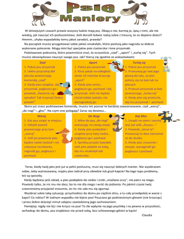 W dzisiejszych czasach prawie wszyscy ludzie mają psy. Dbają o nie, karmią je, śpią z nimi, ale nie wiedzą, jak nauczyć ich posłuszeństwa. Jeśli dorośli ledwie radzą sobie z tresurą, to co dopiero dzieci? Hmmm…chyba wypadałoby temu jakoś zaradzić, prawda? Na początek musisz przygotować sobie jakieś smakołyki, które posłużą jako nagroda za dobrze wykonane polecenie. Mogą nimi być specjalne psie ciasteczka i inne przysmaki. Podstawowe polecenia, które powinniście znać, to oczywiście „siad”, „aport” i „turlaj się”. Tych musisz obowiązkowo nauczyć swego psa. Jak? Kieruj się zgodnie ze wskazówkami: Siad Aport Turlaj się 1. Pokaż psu przysmak 1. Pokaż psu przysmak 1. Pokaż psu przysmak 2. Lekko przyciskaj dół 2. Rzuć patyk na odległość 2. Przesuwaj go nad jego pleców powtarzając około 10 metrów krzycząc głową do tyłu, aż pies komendę „siad” „aport” położy się na bok lub na 3. Kiedy pies usiądzie, daj 3. Kiedy pies wróci, plecach przysmak, pogłaszcz go i pogłaszcz go, pochwal i daj 3. Przesuń przysmak w bok powiedz „Świetnie się przysmak. Jeśli nie będzie powtarzając „turlaj się” spisałeś! Tak trzymaj! Dobry chciał oddać patyka, nie 4. Kiedy pies się przeturla, piesek!” wynagradzaj go. daj mu przysmak i pochwal. Skoro już znasz podstawowe komendy, musisz też poznać te bardziej zaawansowane, czyli „waruj”, „do nogi” i „głos”. Na czym one polegają? Zaraz się dowiesz… Waruj 1. Każ psu usiąść w miejscu 2. Odejdź powoli powtarzając przy tym „waruj” 3. Jeśli po powrocie pies będzie nadal siedział i nie usłyszysz szczekania, nagrodź go, pogłaszcz i pochwal. Do Nogi 1. Mów do psa „do nogi” wskazując na swoją stopę 2. Kiedy pies podejdzie i usiądzie przy twej nodze , pogłaszcz go i pochwal 3. Spróbuj przejść kawałek. Jeśli pies pójdzie za tobą, daj mu smakołyk lub ciasteczko. Daj Głos 1. Usiądź na ziemi i zacznij wyć jak wilk „Auuuu…” 2. Powiedz „teraz ty”. Powtarzaj te dwa ćwiczenia aż do skutku 3. Kiedy pies zrozumie i zawyje, wynagrodź go pogłaszcz i pochwal. Teraz, kiedy twój pies jest już w pełni posłuszny, musi się nauczyć dobrych manier. Nie wyobrażam sobie, żeby wytresowany, mądry pies żebrał przy obiedzie lub gryzł kapcie! Na tego typu problemy, też są sposoby. Kiedy będziesz jeść obiad, a pies podejdzie do ciebie i zrobi „maślane oczy”, nie patrz na niego. Powiedz tylko, że nic mu nie dasz, bo to nie dla niego i wróć do jedzenia. Po jakimś czasie twój czworonożny przyjaciel zrozumie, że nic nie uda mu się zgarnąć. Wyobraź sobie taką sytuację: przychodzisz do domu po ciężkim dniu, a tu cały przedpokój w wacie z kapci! Co robisz? W żadnym wypadku nie bijesz psa! Pouczasz go podniesionym głosem (nie krzycząc) i przez dobre dziesięć minut udajesz zawiedzioną jego zachowaniem. Pamiętaj: nigdy nie bij i nie krzycz na psa! To źle wpłynie na jego psychikę i na pewno w przyszłości, wchodząc do domu, psa znajdziesz nie przed sobą, lecz schowanego gdzieś w kącie! Claudia