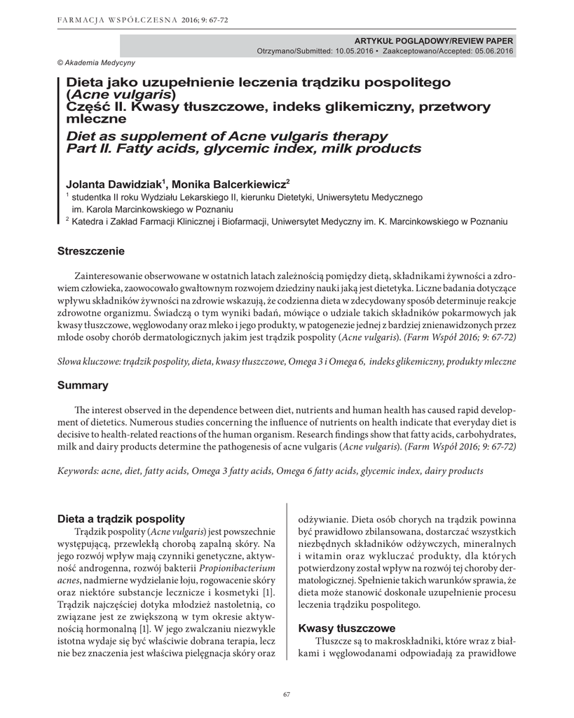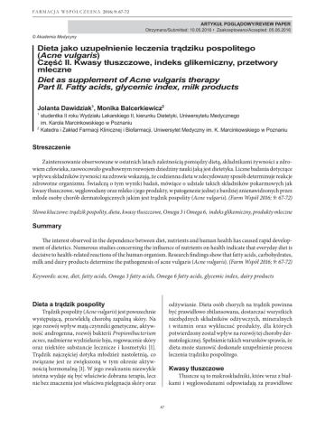 67 FA R M A C J A W S P Ó Ł C Z E S N A 2016; 9: 67-72 ARTYKUŁ POGLĄDOWY/REVIEW PAPER Otrzymano/Submitted: 10.05.2016 • Zaakceptowano/Accepted: 05.06.2016 © Akademia Medycyny Dieta jako uzupełnienie leczenia trądziku pospolitego (Acne vulgaris) Część II. Kwasy tłuszczowe, indeks glikemiczny, przetwory mleczne Diet as supplement of Acne vulgaris therapy Part II. Fatty acids, glycemic index, milk products Jolanta Dawidziak1, Monika Balcerkiewicz2 1 2 studentka II roku Wydziału Lekarskiego II, kierunku Dietetyki, Uniwersytetu Medycznego im. Karola Marcinkowskiego w Poznaniu Katedra i Zakład Farmacji Klinicznej i Biofarmacji, Uniwersytet Medyczny im. K. Marcinkowskiego w Poznaniu Streszczenie Zainteresowanie obserwowane w ostatnich latach zależnością pomiędzy dietą, składnikami żywności a zdrowiem człowieka, zaowocowało gwałtownym rozwojem dziedziny nauki jaką jest dietetyka. Liczne badania dotyczące wpływu składników żywności na zdrowie wskazują, że codzienna dieta w zdecydowany sposób determinuje reakcje zdrowotne organizmu. Świadczą o tym wyniki badań, mówiące o udziale takich składników pokarmowych jak kwasy tłuszczowe, węglowodany oraz mleko i jego produkty, w patogenezie jednej z bardziej znienawidzonych przez młode osoby chorób dermatologicznych jakim jest trądzik pospolity (Acne vulgaris). (Farm Współ 2016; 9: 67-72) Słowa kluczowe: trądzik pospolity, dieta, kwasy tłuszczowe, Omega 3 i Omega 6, indeks glikemiczny, produkty mleczne Summary The interest observed in the dependence between diet, nutrients and human health has caused rapid development of dietetics. Numerous studies concerning the influence of nutrients on health indicate that everyday diet is decisive to health-related reactions of the human organism. Research findings show that fatty acids, carbohydrates, milk and dairy products determine the pathogenesis of acne vulgaris (Acne vulgaris). (Farm Współ 2016; 9: 67-72) Keywords: acne, diet, fatty acids, Omega 3 fatty acids, Omega 6 fatty acids, glycemic index, dairy products Dieta a trądzik pospolity odżywianie. Dieta osób chorych na trądzik powinna być prawidłowo zbilansowana, dostarczać wszystkich niezbędnych składników odżywczych, mineralnych i witamin oraz wykluczać produkty, dla których potwierdzony został wpływ na rozwój tej choroby dermatologicznej. Spełnienie takich warunków sprawia, że dieta może stanowić doskonałe uzupełnienie procesu leczenia trądziku pospolitego. Trądzik pospolity (Acne vulgaris) jest powszechnie występującą, przewlekłą chorobą zapalną skóry. Na jego rozwój wpływ mają czynniki genetyczne, aktywność androgenna, rozwój bakterii Propionibacterium acnes, nadmierne wydzielanie łoju, rogowacenie skóry oraz niektóre substancje lecznicze i kosmetyki [1]. Trądzik najczęściej dotyka młodzież nastoletnią, co związane jest ze zwiększoną w tym okresie aktywnością hormonalną [1]. W jego zwalczaniu niezwykle istotna wydaje się być właściwie dobrana terapia, lecz nie bez znaczenia jest właściwa pielęgnacja skóry oraz Kwasy tłuszczowe Tłuszcze są to makroskładniki, które wraz z białkami i węglowodanami odpowiadają za prawidłowe 67