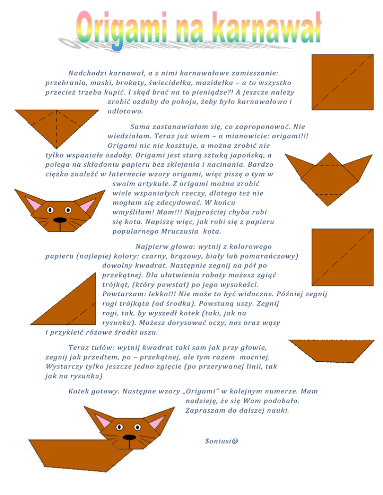 Nadchodzi karnawał, a z nimi karnawałowe zamieszanie: przebrania, maski, brokaty, świecidełka, mazidełka – a to wszystko przecież trzeba kupić. I skąd brać na to pieniądze?! A jeszcze należy zrobić ozdoby do pokoju, żeby było karnawałowo i odlotowo. Sama zastanawiałam się, co zaproponować. Nie wiedziałam. Teraz już wiem – a mianowicie: origami!!! Origami nic nie kosztuje, a można zrobić nie tylko wspaniałe ozdoby. Origami jest starą sztuką japońską, a polega na składaniu papieru bez sklejania i nacinania. Bardzo ciężko znaleźć w Internecie wzory origami, więc piszę o tym w swoim artykule. Z origami można zrobić wiele wspaniałych rzeczy, dlatego też nie mogłam się zdecydować. W końcu wmyśliłam! Mam!!! Najprościej chyba robi się kota. Napiszę więc, jak robi się z papieru popularnego Mruczusia kota. Najpierw głowa: wytnij z kolorowego papieru (najlepiej kolory: czarny, brązowy, biały lub pomarańczowy) dowolny kwadrat. Następnie zegnij na pół po przekątnej. Dla ułatwienia roboty możesz zgiąć trójkąt, (który powstał) po jego wysokości. Powtarzam: lekko!!! Nie może to być widoczne. Później zegnij rogi trójkąta (od środka). Powstaną uszy. Zegnij rogi, tak, by wyszedł kotek (taki, jak na rysunku). Możesz dorysować oczy, nos oraz wąsy i przykleić różowe środki uszu. Teraz tułów: wytnij kwadrat taki sam jak przy głowie, zegnij jak przedtem, po – przekątnej, ale tym razem mocniej. Wystarczy tylko jeszcze jedno zgięcie (po przerywanej linii, tak jak na rysunku) Kotek gotowy. Następne wzory „Origami” w kolejnym numerze. Mam nadzieję, że się Wam podobało. Zapraszam do dalszej nauki. $oniusi@