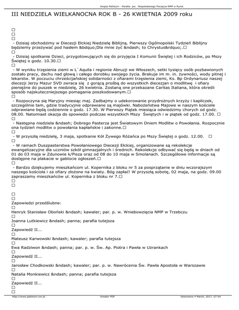 Księża Pallotyni - Parafia pw. Niepokalanego Poczęcia NMP w Rynie III NIEDZIELA WIELKANOCNA ROK B - 26 KWIETNIA 2009 roku - Dzisiaj obchodzimy w Diecezji Ełckiej Niedzielę Biblijną. Pierwszy Ogólnopolski Tydzień Biblijny będziemy przeżywać pod hasłem „Dla mnie żyć – to Chrystus”. - Dzisiaj spotkanie Dzieci, przygotowujących się do przyjęcia I Komunii Świętej i ich Rodziców, po Mszy Świętej o godz. 10.30. - W wyniku trzęsienia ziemi w L`Aquila i regionie Abruzji we Włoszech, setki tysięcy osób pozbawionych zostało pracy, dachu nad głową i całego dorobku swojego życia. Brakuje im m. in. żywności, wody pitnej i lekarstw. W poczuciu chrześcijańskiej solidarności z ofiarami trzęsienia ziemi, Ks. Bp Ordynariusz naszej diecezji Jerzy Mazur SVD zwraca się z gorącą prośbą do wszystkich diecezjan o modlitwę i ofiary pieniężne do puszek w niedzielę, 26 kwietnia. Zostaną one przekazane Caritas Italiana, która określi sposób najskuteczniejszego pomagania poszkodowanym. - Rozpoczyna się Maryjny miesiąc maj. Zadbajmy o udekorowanie przydrożnych krzyży i kapliczek, szczególnie tam, gdzie tradycyjnie odprawiane są majówki. Nabożeństwa Majowe w naszym kościele odprawiane będą codziennie o godz. 17.30. W Pierwszy Piątek miesiąca odwiedzimy chorych od godz. 08.00. Natomiast okazja do spowiedzi podczas wszystkich Mszy Świętych i w piątek od godz. 17.00. - Następna niedziela – Dobrego Pasterza jest Światowym Dniem Modlitw o Powołania. Rozpocznie ona tydzień modlitw o powołania kapłańskie i zakonne. - W przyszłą niedzielę, 3 maja, spotkanie Kół Żywego Różańca po Mszy Świętej o godz. 12.00. - W ramach Duszpasterstwa Powołaniowego Diecezji Ełckiej, organizowane są rekolekcje ewangelizacyjne dla uczniów szkół gimnazjalnych i średnich. Rekolekcje odbywać się będą w dniach od 01 do 03 maja w Zdunowie k/Pisza oraz od 08 do 10 maja w Smolanach. Szczegółowe informacje są dostępne na plakacie w gablocie ogłoszeń. - Bardzo dziękujemy mieszkańcom ul. Kopernika z bloku nr 5 za posprzątanie w dniu wczorajszym naszego kościoła i za ofiary złożone na kwiaty. Bóg zapłać! W przyszłą sobotę, 02 maja, na godz. 09.00 zapraszamy mieszkańców ul. Kopernika z bloku nr 7. Zapowiedzi przedślubne: Henryk Stanisław Oboński – kawaler; par. p. w. Wniebowzięcia NMP w Trzebczu Joanna Lutkiewicz – panna; parafia tutejsza Zapowiedź II... Mateusz Karwowski – kawaler; parafia tutejsza Ewa Radziwon – panna; par. p. w. Św. Ap. Piotra i Pawła w Użrankach Zapowiedź II... Jarosław Chodkowski – kawaler; par. p. w. Nawrócenia Św. Pawła Apostoła w Warszawie Natalia Monkiewicz – panna; parafia tutejsza Zapowiedź II... http://www.pallotyni.ryn.pl Kreator PDF Utworzono 4 March, 2017, 07:54 Księża Pallotyni - Parafia pw. Niepokalanego Poczęcia NMP w Rynie http://www.pallotyni.ryn.pl Kreator PDF Utworzono 4 March, 2017, 07:54