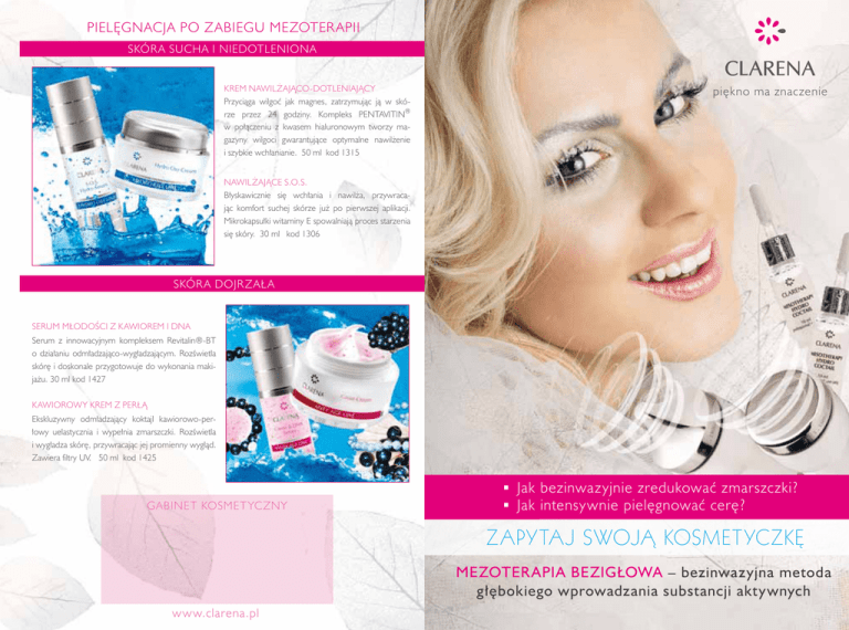 Pielęgnacja PO Z ABIEGU MEZOTER APII Skór a sucha i niedotleniona Krem nawilżająco-dotleniający Przyciąga wilgoć jak magnes, zatrzymując ją w skó- piękno ma znaczenie rze przez 24 godziny. Kompleks PENTAVITIN® w połączeniu z kwasem hialuronowym tworzy magazyny wilgoci gwarantujące optymalne nawilżenie i szybkie wchłanianie. 50 ml kod 1315 Nawilżające S.O.S. Błyskawicznie się wchłania i nawilża, przywracając komfort suchej skórze już po pierwszej aplikacji. Mikrokapsułki witaminy E spowalniają proces starzenia się skóry. 30 ml kod 1306 Skór a dojr z ał a Serum młodości z kawiorem i DNA Serum z innowacyjnym kompleksem Revitalin®-BT o działaniu odmładzająco-wygładzającym. Rozświetla skórę i doskonale przygotowuje do wykonania makijażu. 30 ml kod 1427 Kawiorowy krem z perłą Ekskluzywny odmładzający koktajl kawiorowo-perłowy uelastycznia i wypełnia zmarszczki. Rozświetla i wygładza skórę, przywracając jej promienny wygląd. Zawiera filtry UV. 50 ml kod 1425 GABINET KOSMET YCZNY Jak bezinwazyjnie zredukować zmarszczki? Jak intensywnie pielęgnować cerę? Zapytaj swoją kosmetyczkę Mezoter apia bezigłowA – bezinwazyjna metoda głębokiego wprowadzania substancji akty wnych w w w.clarena.pl Mezoterapia bezigłowa Clarena: efekty zabiegu na twarz: Mezoterapia bezigłowa to nowy system śródskórnej aplikacji substancji aktywnych. Jest to jedyna metoda oparta na terapii skojarzonej, wykorzystującej jednoczesne działanie trzech rodzajów bodźców: fali ultradźwiękowej (UD) impulsu elektroterapeutycznego koktajli substancji aktywnych odświeżenie i regeneracja wygładzenie zmarszczek Mezoterapia bezigłowa – szybko, bezinwazyjnie i bezboleśnie usuwa zmarszczki i odmładza skórę bez ryzyka powikłań związanych z metodą igłową (iniekcyjną). działanie mezoterapii clarena: skuteczność widoczna już po 1 zabiegu bezpieczna alternatywa mezoterapii igłowej intensywny zabieg ujędrniający – ANTI AGE witaminowy zabieg odżywiający – BOMBA WITAMINOWA redukcja „kurzych łapek”– EYE LIFT antycellulitowy zabieg - CELLULIT STOP możliwość stosowania na twarz, ciało i okolice oczu efekty zabiegu na ciało: wysoki komfort i krótki czas zabiegu warstwa rogowa tradycyjna aplikacja kosmetyków redukcja cellulitu wprowadzanie innymi metodami warstwa podstawna warstwa kolczysta warstwa ziarnista brak skutków ubocznych skóra właściwa naskórek likwidacja cieni i worków pod oczami Głębokość działania mezoterapii bezigłowej mezoterapia bezigłowa czas trwania zabiegu: 60 minut ilość zabiegów: 6 częstotliwość zabiegów: 2 razy w tygodniu profilaktycznie: 1 raz w miesiącu