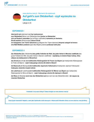 www.aterima-med.pl - Niemiecki dla opiekunek Auf geht's zum Oktoberfest - czyli wycieczka na Oktoberfest Lekcja nr 23 ODPOWIEDZI I überrascht sein [yberraszt zajn] być zaskoczonym zum Oktoberfest [fahren cum Oktoberfest faren] jechać na Oktoberfest sich auf Deutsch unterhalten [zyś ałf Dojcz unterhalten] rozmawiać po niemiecku Dirndl anziehen [Dirndl ancijen] ubierać Dirndl ein Autogramm vom Trainer bekommen [aj Ałtogram fom Trajner bekomen] otrzymać autograf od trenera eine Maß Weißbier probieren [ajne Mas Wajsbir probiren] próbować kufel piwa ODPOWIEDZI II das Oktoberfest [das Oktoberfest] das größte Volksfest der Welt, das jeden Herbst in München stattfindet [das gryste Folksfest der Welt, das jeden Herbst in Mynsien sztatfindet] – największy na świecie festyn ludowy, który odbywa się każdej jesieni w Monachium das Dirndl [das Dirndl] ein traditionelles Kleidungsstück für Frauen aus Bayern [ajn tradicjoneles Klaidungssztyk fyr Frałen ałs Bajern] – część tradycyjnego ubrania dla kobiet w Bawarii die Blasmusik [di Blasmjuzik] die traditionelle, bayerische Volksmusik [di tradicjonele, bajerisze Folksmjuzik] – tradycyjna, bawarska muzyka ludowa die Lederhose [di Lederhoze] ein traditionelles Kleidungsstück für Männer aus Bayern [ajn tradicjoneles Klajdungssztyk fyr Mena ałs Bajern] – część tradycyjnego ubrania dla mężczyzn w Bawarii die Wiesn [di Wizn] so nennt man das Oktoberfest auch [zo nent man das Oktoberfest ałch] – tak nazywa się rówznież Oktoberfest