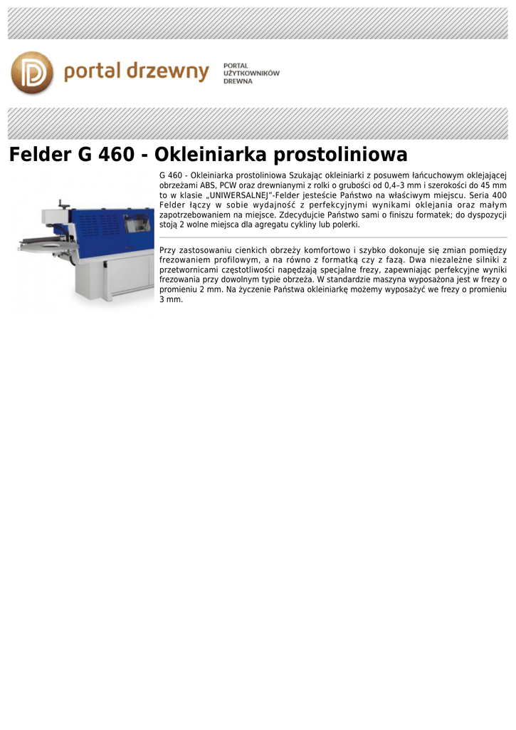 Felder G 460 - Okleiniarka prostoliniowa G 460 - Okleiniarka prostoliniowa Szukając okleiniarki z posuwem łańcuchowym oklejającej obrzeżami ABS, PCW oraz drewnianymi z rolki o grubości od 0,4–3 mm i szerokości do 45 mm to w klasie „UNIWERSALNEJ”-Felder jesteście Państwo na właściwym miejscu. Seria 400 Felder łączy w sobie wydajność z perfekcyjnymi wynikami oklejania oraz małym zapotrzebowaniem na miejsce. Zdecydujcie Państwo sami o finiszu formatek; do dyspozycji stoją 2 wolne miejsca dla agregatu cykliny lub polerki. Przy zastosowaniu cienkich obrzeży komfortowo i szybko dokonuje się zmian pomiędzy frezowaniem profilowym, a na równo z formatką czy z fazą. Dwa niezależne silniki z przetwornicami częstotliwości napędzają specjalne frezy, zapewniając perfekcyjne wyniki frezowania przy dowolnym typie obrzeża. W standardzie maszyna wyposażona jest w frezy o promieniu 2 mm. Na życzenie Państwa okleiniarkę możemy wyposażyć we frezy o promieniu 3 mm.