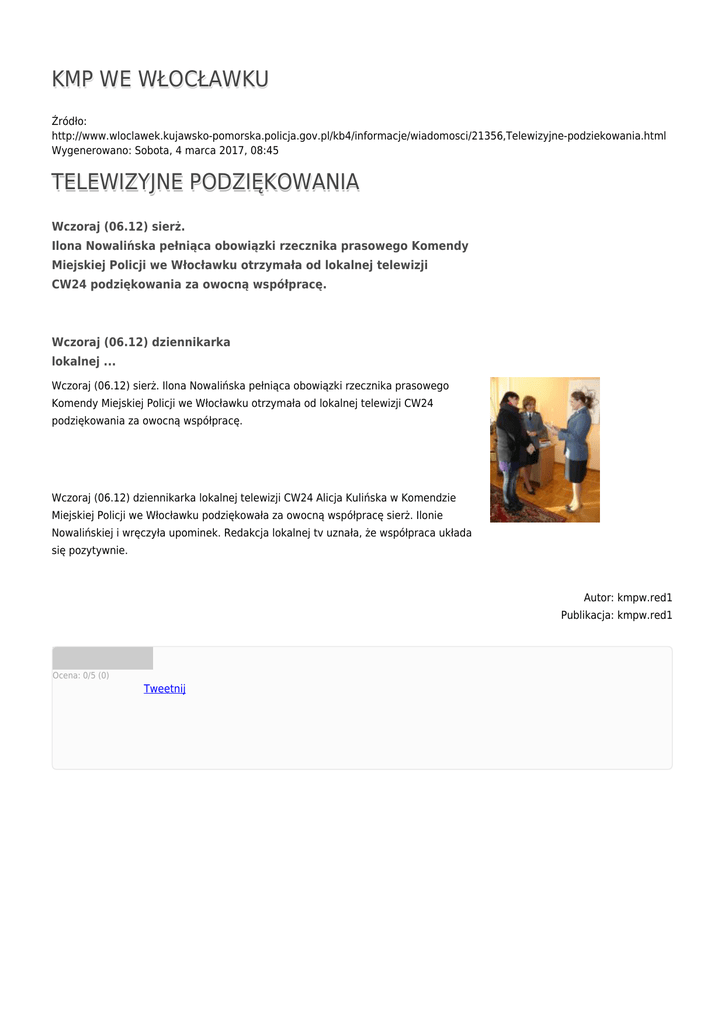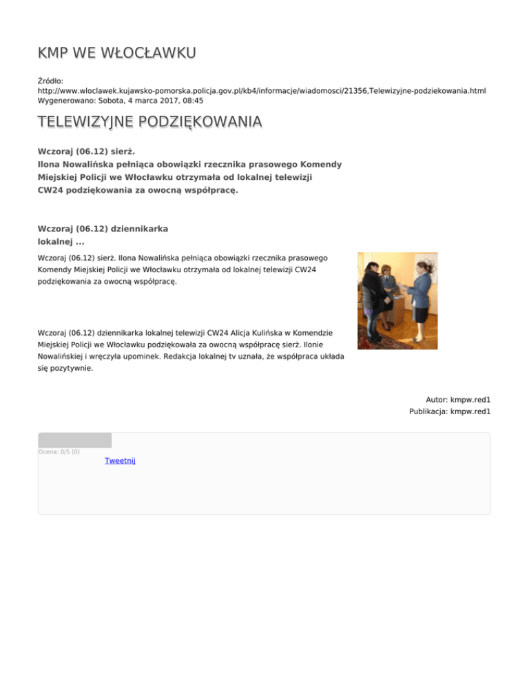 KMP WE WŁOCŁAWKU Źródło: http://www.wloclawek.kujawsko-pomorska.policja.gov.pl/kb4/informacje/wiadomosci/21356,Telewizyjne-podziekowania.html Wygenerowano: Sobota, 4 marca 2017, 08:45 TELEWIZYJNE PODZIĘKOWANIA Wczoraj (06.12) sierż. Ilona Nowalińska pełniąca obowiązki rzecznika prasowego Komendy Miejskiej Policji we Włocławku otrzymała od lokalnej telewizji CW24 podziękowania za owocną współpracę. Wczoraj (06.12) dziennikarka lokalnej ... Wczoraj (06.12) sierż. Ilona Nowalińska pełniąca obowiązki rzecznika prasowego Komendy Miejskiej Policji we Włocławku otrzymała od lokalnej telewizji CW24 podziękowania za owocną współpracę. Wczoraj (06.12) dziennikarka lokalnej telewizji CW24 Alicja Kulińska w Komendzie Miejskiej Policji we Włocławku podziękowała za owocną współpracę sierż. Ilonie Nowalińskiej i wręczyła upominek. Redakcja lokalnej tv uznała, że współpraca układa się pozytywnie. Autor: kmpw.red1 Publikacja: kmpw.red1 Ocena: 0/5 (0) Tweetnij