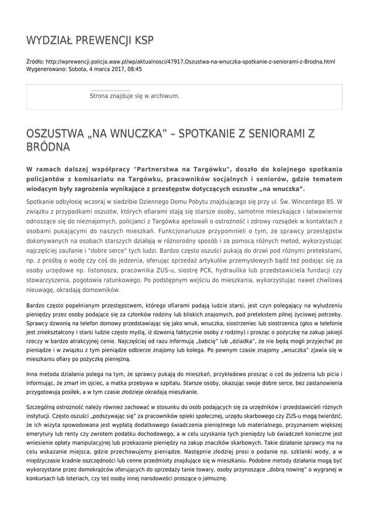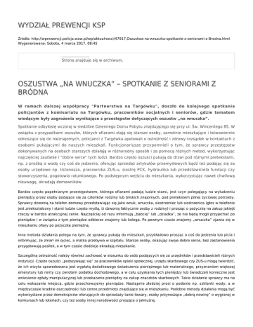 WYDZIAŁ PREWENCJI KSP Źródło: http://wprewencji.policja.waw.pl/wp/aktualnosci/47917,Oszustwa-na-wnuczka-spotkanie-z-seniorami-z-Brodna.html Wygenerowano: Sobota, 4 marca 2017, 08:45 Strona znajduje się w archiwum. OSZUSTWA „NA WNUCZKA” – SPOTKANIE Z SENIORAMI Z BRÓDNA W ramach dalszej współpracy "Partnerstwa na Targówku", doszło do kolejnego spotkania policjantów z komisariatu na Targówku, pracowników socjalnych i seniorów, gdzie tematem wiodącym były zagrożenia wynikające z przestępstw dotyczących oszustw „na wnuczka”. Spotkanie odbyłosię wczoraj w siedzibie Dziennego Domu Pobytu znajdującego się przy ul. Św. Wincentego 85. W związku z przypadkami oszustw, których ofiarami stają się starsze osoby, samotnie mieszkające i łatwowiernie odnoszące się do nieznajomych, policjanci z Targówka apelowali o ostrożność i zdrowy rozsądek w kontaktach z osobami pukającymi do naszych mieszkań. Funkcjonariusze przypomnieli o tym, że sprawcy przestępstw dokonywanych na osobach starszych działają w różnorodny sposób i za pomocą różnych metod, wykorzystując najczęściej zaufanie i "dobre serce" tych ludzi. Bardzo często oszuści pukają do drzwi pod różnymi pretekstami, np. z prośbą o wodę czy coś do jedzenia, oferując sprzedaż artykułów przemysłowych bądź też podając się za osoby urzędowe np. listonosza, pracownika ZUS-u, siostrę PCK, hydraulika lub przedstawiciela fundacji czy stowarzyszenia, pogotowia ratunkowego. Po podstępnym wejściu do mieszkania, wykorzystując nawet chwilową nieuwagę, okradają domowników. Bardzo często popełnianym przestępstwem, którego ofiarami padają ludzie starsi, jest czyn polegający na wyłudzeniu pieniędzy przez osoby podające się za członków rodziny lub bliskich znajomych, pod pretekstem pilnej życiowej potrzeby. Sprawcy dzwonią na telefon domowy przedstawiając się jako wnuk, wnuczka, siostrzeniec lub siostrzenica (głos w telefonie jest zniekształcony i starsi ludzie często myślą, iż dzwonią faktycznie osoby z rodziny) i prosząc o pożyczkę na zakup jakiejś rzeczy w bardzo atrakcyjnej cenie. Najczęściej od razu informują „babcię” lub „dziadka”, że nie będą mogli przyjechać po pieniądze i w związku z tym pieniądze odbierze znajomy lub kolega. Po pewnym czasie znajomy „wnuczka” zjawia się w mieszkaniu ofiary po pożyczkę pieniężną. Inna metoda działania polega na tym, że sprawcy pukają do mieszkań, przykładowo prosząc o coś do jedzenia lub picia i informując, że zmarł im ojciec, a matka przebywa w szpitalu. Starsze osoby, okazując swoje dobre serce, bez zastanowienia przygotowują posiłek, a w tym czasie złodzieje okradają mieszkanie. Szczególną ostrożność należy również zachować w stosunku do osób podających się za urzędników i przedstawicieli różnych instytucji. Często oszuści „podszywając się” za pracowników opieki społecznej, urzędu skarbowego czy ZUS-u mogą twierdzić, że ich wizyta spowodowana jest wypłatą dodatkowego świadczenia pieniężnego lub materialnego, przyznaniem większej emerytury lub renty czy zwrotem podatku dochodowego, a w celu uzyskania tych pieniędzy lub świadczeń konieczne jest wniesienie opłaty manipulacyjnej lub przekazanie pieniędzy na zakup znaczków skarbowych. Takie działanie sprawcy ma na celu wskazanie miejsca, gdzie przechowujemy pieniądze. Następnie złodziej prosi o podanie np. szklanki wody, a w międzyczasie kradnie oszczędności lub cenne przedmioty znajdujące się w mieszkaniu. Podobne metody działania mogą być wykorzystane przez domokrążców oferujących do sprzedaży tanie towary, osoby przynoszące „dobrą nowinę” o wygranej w konkursach lub loteriach, czy też osoby innej narodowości proszące o jałmużnę. Sprawcy oszustw mogą także podszywać się pod funkcjonariuszy Policji lub Straży Miejskiej, informując (np. że ktoś z rodziny nie ma pieniędzy, aby zapłacić mandat lub że ktoś z bliskich popełnił przestępstwo lub wykroczenie. Jednocześnie sugerują, iż sprawę można załatwić polubownie poza „granicami prawa”. Chęć udzielenia pomocy bliskim powoduje, że osoby starsze płacą za tę „wymyśloną usługę” znaczne sumy pieniędzy. W wymienionych sytuacjach zawsze należy potwierdzić fakty przekazywane nam przez nieznajomego lub nieznajomą, którzy zapukają do naszych drzwi oraz zadzwonić osobiście pod numer telefonu członka rodziny, aby przekonać się, czy jego znajomy mówi prawdę. Należy przestrzegać zasady, że nie należy przekazywać pieniędzy osobom, których nie znamy osobiście. Aby nie stać się ofiarą oszustwa, należy przestrzegać następujących zasad: Przed otwarciem drzwi: ● Spojrzeć przez wizjer w drzwiach lub przez okno – kto to? ● Jeśli nie znamy odwiedzającego – spytać o cel jego wizyty, zapiąć łańcuch zabezpieczający (jeśli zdecydujemy się na otwarcie drzwi) oraz poprosić o pokazanie dowodu tożsamości lub legitymacji służbowej, identyfikatora. Uczciwej osoby nie zrazi takie postępowanie powodowane ostrożnością. ● W razie wątpliwości należy umówić się na inny termin, sprawdzając uprzednio w administracji osiedla lub innej odpowiedniej instytucji wiarygodność osoby pukającej do drzwi (jeśli osoba podaje się za przedstawiciela administracji lub innej odpowiedniej instytucji). W sytuacji, gdy osoba staje się natarczywa, natychmiast należy zadzwonić napolicję lub zaalarmować otoczenie. We wszystkich opisanych przypadkach należy kontaktować się z Policją, dzwoniąc na numer alarmowy 997 lub 112 z telefonu komórkowego, przekazując jak najwięcej zapamiętanych szczegółów, np. wygląd nieznajomej osoby, numer i markę samochodu, którym ewentualnie przyjechała, a w przypadku rozmowy telefonicznej – numer z wyświetlacza telefonu, datę i godzinę rozmowy. Mat. opracowano w Wydziale Prewencji KSP ms/KSP Ocena: 0/5 (0