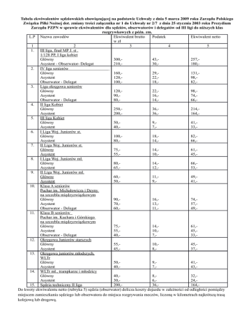 Tabela ekwiwalentów sędziowskich obowiązującej na podstawie Uchwały z dnia 5 marca 2009 roku Zarządu Polskiego Związku Piłki Nożnej dot. zmiany treści załącznika nr 1 do Uchwały nr 2/7 z dnia 25 stycznia 2003 roku Prezydium Zarządu PZPN w sprawie ekwiwalentów dla sędziów, obserwatorów i delegatów od III ligi do niższych klas rozgrywkowych z późn. zm. L.P Nazwa zawodów Ekwiwalent brutto Podatek Ekwiwalent netto w zł 1 2 3 4 5 1. III liga, finał MP J. st . 1/128 PP, I liga kobiet Główny 300,43,257,Asystent - Obserwator- Delegat 210,30,180,2. IV liga seniorów Główny 160,29,131,Asystent 120,22,98,Obserwator - Delegat 100,18,82,3. Liga okręgowa seniorów Główny 120,22,98,Asystent 90,16,74,Obserwator - Delegat 80,14,66,4. II liga Kobiet Główny 250,36,214,Asystent 200,36,164,5. III liga Kobiet Główny 50,9,41,Asystent 40,7,33,6. I Liga Woj. Juniorów st. Główny 100,18,82,Asystent 80,14,66,7. II Liga Woj. Juniorów st. Główny 75,14,61,Asystent 55,10,45,8. I Liga Woj. Juniorów mł. Główny 80,14,66,Asystent 65,12,53,9. II Liga Woj. Juniorów mł. Główny 60,11,49,Asystent 50,9,41,10. Klasa A seniorów Puchar im. Michałowicza i Deyny na szczeblu międzyzwiązkowym Główny 90,16,74,Asystent 70,13,57,Obserwator - Delegat 60,11,49,11. Klasa B seniorów Puchar im. Kuchara i Górskiego na szczeblu międzyzwiązkowym Główny 75,14,61,Asystent 55,10,45,Obserwator - Delegat 40,7,33,12. Okręgowa Juniorów starszych Główny 55,10,45,Asystent 45,8,37,13. Okręgowa juniorów młodszych, WLTr Główny 50,9,41,Asystent 40,7,43,14. WLTr mł., trampkarze i młodzicy Główny 40,8,32,Asystent 30,6,24,15. Sędzia techniczny II liga 200,36,164,Do kwoty ekwiwalentu netto (rubryka 5) sędzia (obserwator) dolicza koszty dojazdu w zależności od odległości pomiędzy miejscem zamieszkania sędziego lub obserwatora do miejsca rozgrywania meczów, liczoną w kilometrach najkrótszą trasą kolejową lub drogową.