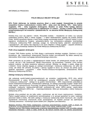 INFORMACJA PRASOWA 08.12.2015, Warszawa POLKI DBAJĄ O MŁODY WYGLĄD! 93% Polek deklaruje, że kobiety powinny dbać o swój wygląd. Uzasadniają to przede wszystkim troską o zadowolenie z siebie (38% – żeby czuć się dobrze, 18% – żeby ładnie wyglądać, 14% – żeby wyglądać atrakcyjnie). Średnio co piąta Polka byłaby skłonna skorzystać z medycyny estetycznej w najbliższych 2-3 latach – wynika z badań TNS Polska przeprowadzonych we wrześniu i październiku br. na zlecenie Kliniki Medycyny Estetycznej ESTELL*. Kobiety chcą czuć się pięknie i młodo. Wszystkie kobiety – niezależnie od wieku czy sytuacji materialnej powinny dbać o młody wygląd – z takim stwierdzeniem zgadza się prawie połowa Polek. Wśród sposobów dbania o swój młody wygląd wymieniają średnio 7 różnych metod, w tym: regularne chodzenie do fryzjera, uprawianie sportu czy korzystanie z zabiegów kosmetologii i medycyny estetycznej. Polki zwracają uwagę na harmonię między pięknem wewnętrznym i zewnętrznym. Jak ważną rolę odgrywa w ich życiu dbałość o młody wygląd – zapytali ankieterzy z TNS Polska prowadząc badania dla Kliniki Medycyny Estetycznej ESTELL. Polki chcą wyglądać atrakcyjnie Z badań TNS Polska wynika, że Polki dbają o zachowanie młodego wyglądu. Zarówno w życiu prywatnym, jak i zawodowym atrakcyjność fizyczna kobiet ma znaczenie. Są także zawody czy stanowiska, które wręcz wymagają reprezentacyjnego wizerunku. Polki uznawane są za jedne z najpiękniejszych kobiet świata. Ich atrakcyjność wynika nie tylko z urody, ale też z siły osobowości. Myślą nowocześnie, są pomysłowe i zaradne. Choć bardzo oddane rodzinie, są także świadome własnych potrzeb. Wiedzą, że dbając o siebie, dbają też o bliskich. Coraz chętniej sięgają po zabiegi kosmetologii i medycyny estetycznej, nie tylko dla urody, ale także dla zdrowia, bo piękny i zdrowy wygląd to klucz, by cieszyć się pełnią życia, spełniać zawodowo i prywatnie – mówi Paulina Smaszcz-Kurzajewska, ambasadorka Kliniki Medycyny Estetycznej ESTELL. Zabiegi medycyny estetycznej Jak pokazują wyniki badań przeprowadzonych we wrześniu i październiku 2015 roku wśród Warszawianek w wieku 30-60 lat zarabiających powyżej 4000PLN netto i korzystających z medycyny estetycznej**, zabiegi te są godne rekomendacji – 88% respondentek poleciłaby je swoim koleżankom/znajomym. Ankietowane deklarują, że zabiegi poprawiają wygląd i dzięki temu mają lepsze samopoczucie. Przyznają̨, że główną motywacją do skorzystania z nowoczesnych rozwiązań medycyny estetycznej była chęć́ podobania się̨ sobie (56%), jednak często także podszyta kompleksami (39%) lub … inspiracją koleżanek, które już skorzystały z oferty medycyny estetycznej (37%). Kobiety chcą podobać się nie tylko sobie i partnerowi, ale też innym mężczyznom i kobietom. Piękny wygląd wpływa na zwiększenie samoakceptacji, a to sprzyja apetytowi na seks i większej pewności siebie w łóżku. Nie tylko zabiegi z medycyny estetycznej okolic intymnych, ale i zwykłe wypełnienie niechcianej zmarszczki może spowodować, że kobieta poczuje się piękniejsza i bardziej seksowna – komentuje wyniki badań prof. Zbigniew Lew-Starowicz. *Badanie Omnibus TNS Polska zrealizowane w technice bezpośredniego wywiadu CAPI w dniach 1823.09.2015, na reprezentatywnej próbie Polek w wieku 15 lat i więcej, wielkość próby: n=528. **Badanie Ad hoc TNS Polska zrealizowane w technice bezpośredniego wywiadu CAPI na próbie celowej mieszkanek Warszawy i okolic w wieku 30-60 lat, dla których dochód netto na członka gospodarstwa domowego wynosi min. 4000 PLN, wielkość próby: n=204, z czego: 103 respondentki korzystały w ciągu ostatnich dwóch lat minimum z jednego zabiegu medycyny estetycznej, a 101 nie korzystało, ale nie odrzuca takiej możliwości w ciągu najbliższych 2/3 lat. Więcej informacji o klinice na: www.estell.pl oraz www.facebook.com/EstellKlinikaMedycynyEstetycznej. O ENEL-MED S.A. Centrum Medyczne ENEL-MED S.A. to polska firma rodzinna, oferująca pełną obsługę medyczną. ENELMED opiekuje się pacjentem od konsultacji, przez diagnostykę, hospitalizację, operację, aż po rehabilitację. Na ogólnopolską sieć medyczną ENEL-MED składają się dwa szpitale zlokalizowane w Warszawie: Szpital Zacisze oraz Szpital Centrum, wieloprofilowe oddziały własne w Warszawie, Gdańsku, Łodzi, Krakowie, Poznaniu, Katowicach i Wrocławiu oraz sześć specjalistycznych przychodni przyzakładowych, a także ponad 1300 placówek partnerskich na terenie całego kraju. Od 2014 roku w ramach sieci funkcjonuje również Klinika Medycyny Estetycznej ESTELL, a od 2015 klinika medycyny sportowej ENEL-SPORT. ENEL-MED zatrudnia wybitnych lekarzy, blisko 60 specjalizacji. Kompleksowa oferta wieloprofilowych oddziałów obejmuje m.in. badania laboratoryjne i szeroki zakres badań diagnostycznych takich jak USG, EKG, RTG, tomografia czy rezonans magnetyczny. ENEL-MED świadczy też usługi w zakresie stomatologii zachowawczej, protetyki i chirurgii. Spółka od 2011 r. jest notowana na Giełdzie Papierów Wartościowych. Centrum Medyczne ENEL-MED posiada certyfikat ISO 9001. Kontakt dla mediów: Agencja Face it! Dorota Steliga - tel. 512 949 039, e-mail [email protected]