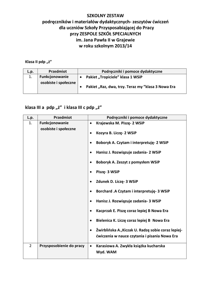 SZKOLNY ZESTAW podręczników i materiałów dydaktycznych- zeszytów ćwiczeń dla uczniów Szkoły Przysposabiającej do Pracy przy ZESPOLE SZKÓŁ SPECJALNYCH im. Jana Pawła II w Grajewie w roku szkolnym 2013/14 Klasa II pdp „ż” L.p. 1. Przedmiot Funkcjonowanie osobiste i społeczne Podręczniki i pomoce dydaktyczne Pakiet „Tropiciele” klasa 1 WSiP Pakiet „Raz, dwa, trzy. Teraz my ”klasa 3 Nowa Era klasa III a pdp „ż” i klasa III c pdp „ż” L.p. 1. 2 Przedmiot Funkcjonowanie osobiste i społeczne Przysposobienie do pracy Podręczniki i pomoce dydaktyczne Krajewska M. Piszę- 2 WSiP Kozyra B. Liczę- 2 WSiP Boboryk A. Czytam i interpretuję- 2 WSiP Hanisz J. Rozwiązuje zadania- 2 WSiP Boboryk A. Zeszyt z pomysłem WSiP Piszę- 3 WSiP Zdunek D. Liczę- 3 WSiP Borchard .A Czytam i interpretuję- 3 WSiP Hanisz J. Rozwiązuje zadania- 3 WSiP Kacprzak E. Piszę coraz lepiej B Nowa Era Bielenica K. Liczę coraz lepiej B Nowa Era Żwirblińska A.,Kiczak U. Radzę sobie coraz lepiejćwiczenia w nauce czytania i pisania Nowa Era Karasiowa A. Zwykła książka kucharska Wyd. WAM
