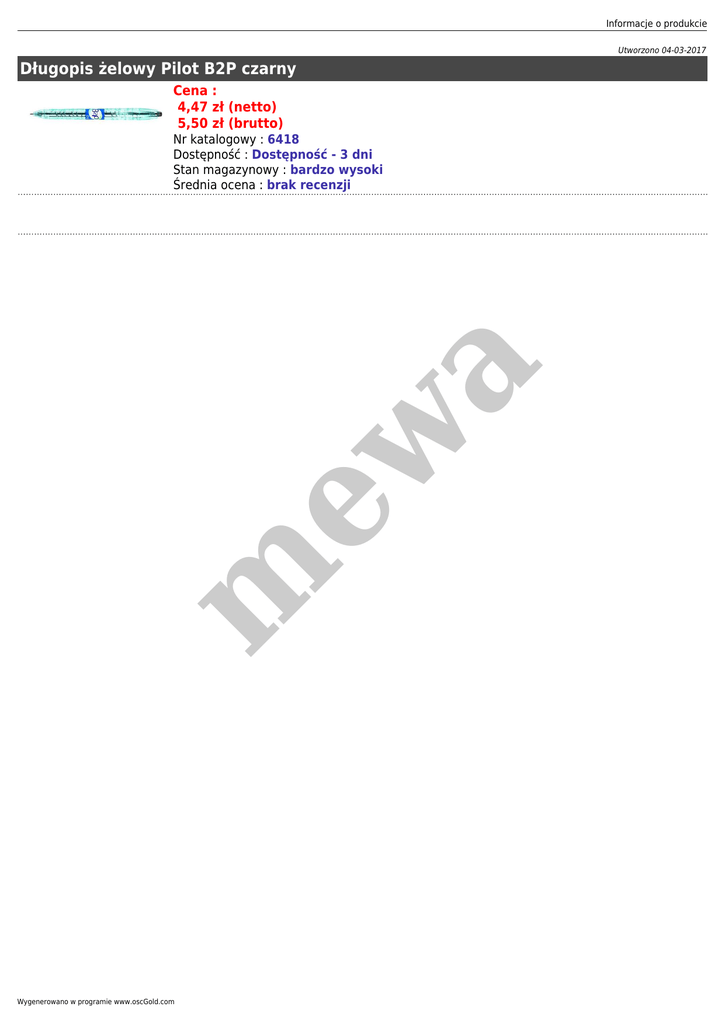 Informacje o produkcie Utworzono 04-03-2017 Długopis żelowy Pilot B2P czarny Cena : 4,47 zł (netto) 5,50 zł (brutto) m ew a Nr katalogowy : 6418 Dostępność : Dostępność - 3 dni Stan magazynowy : bardzo wysoki Średnia ocena : brak recenzji Wygenerowano w programie www.oscGold.com