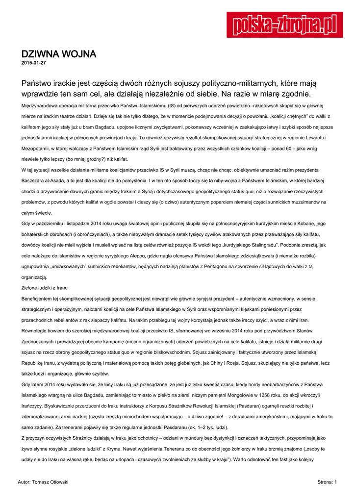 DZIWNA WOJNA 2015-01-27 Państwo irackie jest częścią dwóch różnych sojuszy polityczno-militarnych, które mają wprawdzie ten sam cel, ale działają niezależnie od siebie. Na razie w miarę zgodnie. Międzynarodowa operacja militarna przeciwko Państwu Islamskiemu (IS) od pierwszych uderzeń powietrzno--rakietowych skupia się w głównej mierze na irackim teatrze działań. Dzieje się tak nie tylko dlatego, że w momencie podejmowania decyzji o powołaniu „koalicji chętnych” do walki z kalifatem jego siły stały już u bram Bagdadu, upojone licznymi zwycięstwami, pokonawszy wcześniej w zaskakująco łatwy i szybki sposób najlepsze jednostki armii irackiej w północnych prowincjach kraju. To również oczywisty rezultat skomplikowanej sytuacji strategicznej w regionie Lewantu i Mezopotamii, w której walczący z Państwem Islamskim rząd Syrii jest traktowany przez wszystkich członków koalicji – ponad 60 – jako wróg niewiele tylko lepszy (bo mniej groźny?) niż kalifat. W tej sytuacji wszelkie działania militarne koalicjantów przeciwko IS w Syrii muszą, chcąc nie chcąc, obiektywnie umacniać reżim prezydenta Baszszara al-Asada, a to jest dla koalicji nie do pomyślenia. I w ten oto sposób toczy się ta niby-wojna z Państwem Islamskim, w której bardziej chodzi o przywrócenie dawnych granic między Irakiem a Syrią i dotychczasowego geopolitycznego status quo, niż o rozwiązanie rzeczywistych problemów, z powodu których kalifat w ogóle powstał i cieszy się (o dziwo) autentycznym poparciem niemałej części sunnickich muzułmanów na całym świecie. Gdy w październiku i listopadzie 2014 roku uwaga światowej opinii publicznej skupiła się na północnosyryjskim kurdyjskim mieście Kobane, jego bohaterskich obrońcach (i obrończyniach), a także niebywałym dramacie setek tysięcy cywilów atakowanych przez przeważające siły kalifatu, dowódcy koalicji nie mieli wyjścia i musieli wpisać na listę celów również pozycje IS wokół tego „kurdyjskiego Stalingradu”. Podobnie zresztą, jak cele należące do islamistów w regionie syryjskiego Aleppo, gdzie nagła ofensywa Państwa Islamskiego zdziesiątkowała (i niemalże rozbiła) ugrupowania „umiarkowanych” sunnickich rebeliantów, będących nadzieją planistów z Pentagonu na stworzenie sił lądowych do walki z tą organizacją. Zielone ludziki z Iranu Beneficjentem tej skomplikowanej sytuacji geopolitycznej jest niewątpliwie głównie syryjski prezydent – autentycznie wzmocniony, w sensie strategicznym i operacyjnym, nalotami koalicji na cele Państwa Islamskiego w Syrii oraz wspomnianymi klęskami poniesionymi przez prozachodnich rebeliantów z rąk siepaczy kalifatu. Na takim przebiegu tej wojny korzystają jednak także iraccy szyici, a wraz z nimi Iran. Równolegle bowiem do szerokiej międzynarodowej koalicji przeciwko IS, sformowanej we wrześniu 2014 roku pod przywództwem Stanów Zjednoczonych i prowadzącej obecnie kampanię (mocno ograniczonych) uderzeń powietrznych na cele kalifatu, istnieje i działa militarnie drugi sojusz na rzecz obrony geopolitycznego status quo w regionie bliskowschodnim. Sojusz zainicjowany i faktycznie utworzony przez Islamską Republikę Iranu, z wydatną polityczną i materiałową pomocą takich potęg globalnych, jak Chiny i Rosja. Sojusz, skupiający nie tylko państwa, lecz także ludzi i organizacje, głównie szyitów. Gdy latem 2014 roku wydawało się, że losy Iraku są już przesądzone, że jest już tylko kwestią czasu, kiedy hordy neobarbarzyńców z Państwa Islamskiego wtargną na ulice Bagdadu, zamieniając to miasto w piekło na ziemi, niczym pamiętni Mongołowie w 1258 roku, do akcji wkroczyli Irańczycy. Błyskawicznie przerzuceni do Iraku instruktorzy z Korpusu Strażników Rewolucji Islamskiej (Pasdaran) ogarnęli resztki rozbitej i zdemoralizowanej armii irackiej (często zresztą mimochodem współpracując – o dziwo zgodnie! – z doradcami amerykańskimi, mającymi w Iraku to samo zadanie). Za trenerami pojawiły się także regularne jednostki Pasdaranu (ok. 1–2 tys. ludzi). Z przyczyn oczywistych Strażnicy działają w Iraku jako ochotnicy – odziani w mundury bez dystynkcji i oznaczeń taktycznych, przypominają jako żywo słynne rosyjskie „zielone ludziki” z Krymu. Nawet wyjaśnienia Teheranu co do obecności jego żołnierzy w Iraku brzmią znajomo („osoby te udały się do Iraku na własną rękę, będąc na urlopach i czasowych zwolnieniach ze służby w kraju”). Warto odnotować ten fakt jako kolejny Autor: Tomasz Otłowski Strona: 1 przyczynek do tezy o zmieniającej się naturze współczesnych konfliktów zbrojnych. Wraz z najlepszymi ludźmi do Iraku wysłano także uzbrojenie, tysiące ton amunicji i wyposażenia wojskowego, w tym sprzęt ciężki – transportery, wojskowe ciężarówki, śmigłowce. Teheran – starając się zresztą utrzymać całą sprawę w tajemnicy – w lipcu 2014 roku „przekazał” również Irakowi siedem samolotów szturmowych Su-25. Istnieją podejrzenia, że są to te same maszyny, które na początku 1991 roku na rozkaz Saddama Husajna ewakuowano z Iraku do Iranu tuż po rozpoczęciu przez USA i ich sojuszników operacji „Pustynna burza”. Co więcej, jest niemal pewne, że te samoloty – które prawie natychmiast weszły do akcji – są obecnie pilotowane przez lotników irańskich. Irackie siły powietrzne już od 2003 roku nie dysponują bowiem samolotami typu Suchoj, od tego czasu nie szkolono więc i nie utrzymywano w służbie pilotów takich maszyn. Poza tym, w czasach reżimu Husajna irackie siły powietrzne, zwłaszcza korpus pilotów samolotów szturmowych i myśliwskich, były zdominowane przez sunnitów. Trudno obecnie podejrzewać, aby szyickie w większości władze w Bagdadzie mogły w pełni zaufać sunnickim wojskowym, do tego wywodzącym się ze znienawidzonego reżimu. Pośrednim potwierdzeniem takiego stanu rzeczy mogą b