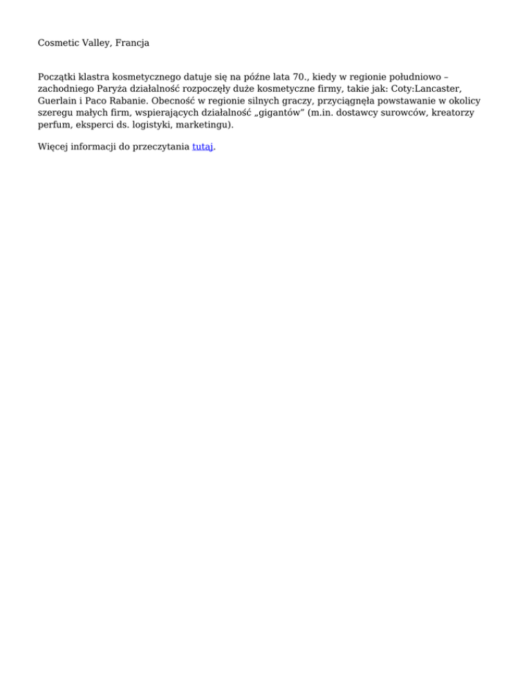 Cosmetic Valley, Francja Początki klastra kosmetycznego datuje się na późne lata 70., kiedy w regionie południowo – zachodniego Paryża działalność rozpoczęły duże kosmetyczne firmy, takie jak: Coty:Lancaster, Guerlain i Paco Rabanie. Obecność w regionie silnych graczy, przyciągnęła powstawanie w okolicy szeregu małych firm, wspierających działalność „gigantów” (m.in. dostawcy surowców, kreatorzy perfum, eksperci ds. logistyki, marketingu). Więcej informacji do przeczytania tutaj.