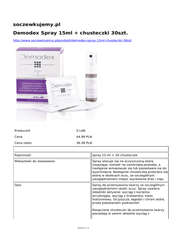 soczewkujemy.pl Demodex Spray 15ml + chusteczki 30szt. http://www.soczewkujemy.pl/produkt/demodex-spray-15ml-chusteczki-30szt Producent S-LAB Cena 44.99 PLN Cena netto 36.58 PLN Pojemność spray 15 ml + 30 chusteczek Wskazówki do stosowania Spray stosuje się na oczyszczoną skórę rozpylając roztwór na zamkniętą powiekę, a następnie wmasowuje się lub pozostawia się do wyschnięcia. Następnie chusteczką przeciera się skórę w okolicach oczu, ze szczególnym uwzględnieniem miejsc wyrastania brwi i rzęs. Opis Spray do przemywania twarzy ze szczególnym uwzględnieniem okolic oczu. Spray zawiera składniki aktywne: wyciąg z korzenia arcydzięgla, wyciąg z krwawnika, kwas hialuronowy. Oczyszcza, łagodzi i chroni skórę przed powstaniem podrażnień. Nasączane chusteczki do przemywania twarzy posiadają w swoim składzie wyciąg z Strona 1 z 2 arcydzięgla, ekstrakt z kory białej wierzby, D-panthenol, alatoninę oraz tlenek cynku. Działają oczyszczająco i łagodząco, doskonale sprawdzają się w mechanicznym usuwaniu zanieczyszczeń, w tym roztoczy, z powierzchni skóry twarzy. Długa data ważności 1 Strona 2 z 2
