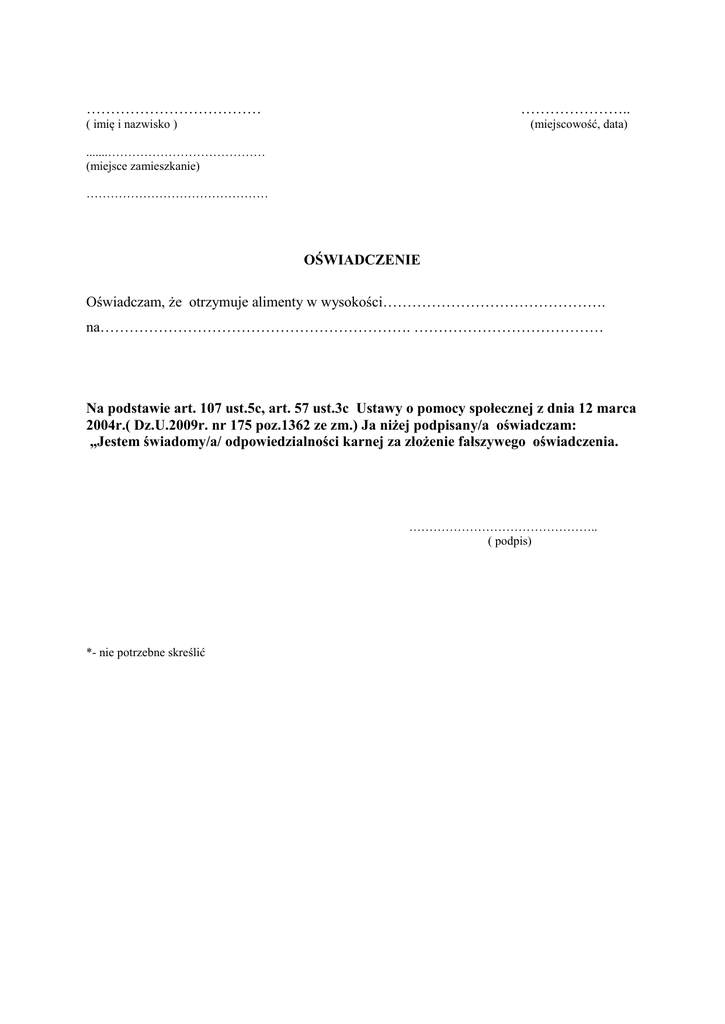 ……………………………… ………………….. ( imię i nazwisko ) (miejscowość, data) .......………………………………… (miejsce zamieszkanie) ……………………………………… OŚWIADCZENIE Oświadczam, że otrzymuje alimenty w wysokości………………………………………. na………………………………………………………. ………………………………… Na podstawie art. 107 ust.5c, art. 57 ust.3c Ustawy o pomocy społecznej z dnia 12 marca 2004r.( Dz.U.2009r. nr 175 poz.1362 ze zm.) Ja niżej podpisany/a oświadczam: „Jestem świadomy/a/ odpowiedzialności karnej za złożenie fałszywego oświadczenia. ……………………………………….. ( podpis) *- nie potrzebne skreślić