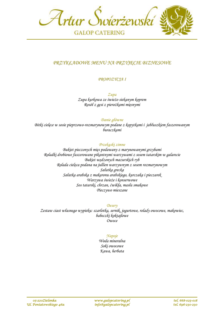 PRZYKŁADOWE MENU NA PRZYJĘCIE BIZNESOWE PROPOZYCJA I Zupa Zupa kurkowa ze świeżo siekanym koprem Rosół z gęsi z pierożkami mięsnymi Danie główne Bitki cielęce w sosie pieprzowo-rozmarynowym podane z kopytkami i jabłuszkiem faszerowanym buraczkami Przekąski zimne Bukiet pieczonych mięs podawany z marynowanymi grzybami Roladki drobiowe faszerowane pikantnymi warzywami z sosem tatarskim w galarecie Bukiet wędzonych mazurskich ryb Rolada cielęca podana na jullien warzywnym z sosem rozmarynowym Sałatka grecka Sałatka arabska z makaronu arabskiego, kurczaka i pieczarek Warzywa świeże i konserwowe Sos tatarski, chrzan, ćwikła, masła smakowe Pieczywo mieszane Desery Zestaw ciast własnego wypieku: szarlotka, sernik, jogurtowe, rolady owocowe, makowiec, babeczki koktajlowe Owoce Napoje Woda mineralna Soki owocowe Kawa, herbata 05-220Zielonka Ul. Poniatowskiego 46a www.galopcatering.pl [email protected] tel. 668-023-018 tel. 696-230-230 PRZYKŁADOWE MENU NA PRZYJĘCIE BIZNESOWE PROPOZYCJA II Zupa Zupa szczawiowa z wędzonym łososiem Barszcz ukraiński z wędzoną kaczką i serową grzanką Danie główne Kaczka luzowana z sosem borówkowym podawana na gratin ziemniaczanym z miodowymi buraczkami Pstrąg potokowy pieczony w soli morskiej podawany z cytrynowymi ziemniaczkami i bukietem kolorowych warzyw Przekąski zimne Bukiet pieczonych mięs podawany z marynowanymi grzybami Rożki schabowe z farszem chrzanowo-pietruszkowym w galarecie Łosoś w cytrynowej galarecie Roladki z cukinii z serkiem szczypiorkowym i marynowanymi pomidorkami Pasztet z sarny podawany na buraczanej galaretce z chatney gruszkowym Tatar tradycyjny z duetem cebulowym, kwaszeniakiem i borowikami Sałatka cesarska z kurczakiem, pomidorami suszonymi, dressingiem czosnkowym i płatkami parmezanu Sałatka węgierska z wołowiną i warzywami marynowanymi Warzywa świeże i konserwowe Sos tatarski, chrzan, ćwikła, masła smakowe, pieczywo mieszane Desery Zestaw ciast własnego wypieku: szarlotka, sernik, jogurtowe, rolady owocowe, makowiec, babeczki koktajlowe Owoce Napoje Woda mineralna Soki owocowe Napoje gazowane Kawa, herbata 05-220Zielonka Ul. Poniatowskiego 46a www.galopcatering.pl [email protected] tel. 668-023-018 tel. 696-230-230 Podane menu jest propozycją i zawsze zostanie dostosowane do Państwa oczekiwań. Na Państwa życzenie możemy przygotować propozycję menu jarskiego, wegetariańskiego bądź bezglutenowego. Podane oferty zawierają Transport sprzętu cateringowego i dań na terenie Warszawy i okolic Podstawowe dekoracje z elementów stałych Obsługę kucharską Dodatkowe koszty stanowią Wynajęcie sprzętu cateringowego (stoły bufetowe i koktajlowe, obrusy, porcelana, sztućce, wyposażenie bufetowe etc.) Obsługa kelnerska przyjęcia Jeżeli chcieliby Państwo wzbogacić swoje przyjęcie o inne elementy, za dodatkową opłatą proponujemy : Tort Welcome dirnk Organizację baru z alkoholem Dekorację kwiatową Oraz inne pozycje z naszej oferty specjalnej Mamy nadzieję, iż nasza oferta spotka się z Państwa oczekiwaniami. Pragniemy jednocześnie zaznaczyć, że jesteśmy elastyczni podczas negocjacji i postaramy się jak najdokładniej dopasować naszą ofertę do Państwa potrzeb i możliwości. Z wyrazami szacunku, Zespół Galop Catering Zakaz kopiowania i powielania w części lub w całości bez zgody firmy Artur Świerżewski Galop Catering. 05-220Zielonka Ul. Poniatowskiego 46a www.galopcatering.pl [email protected] tel. 668-023-018 tel. 696-230-230
