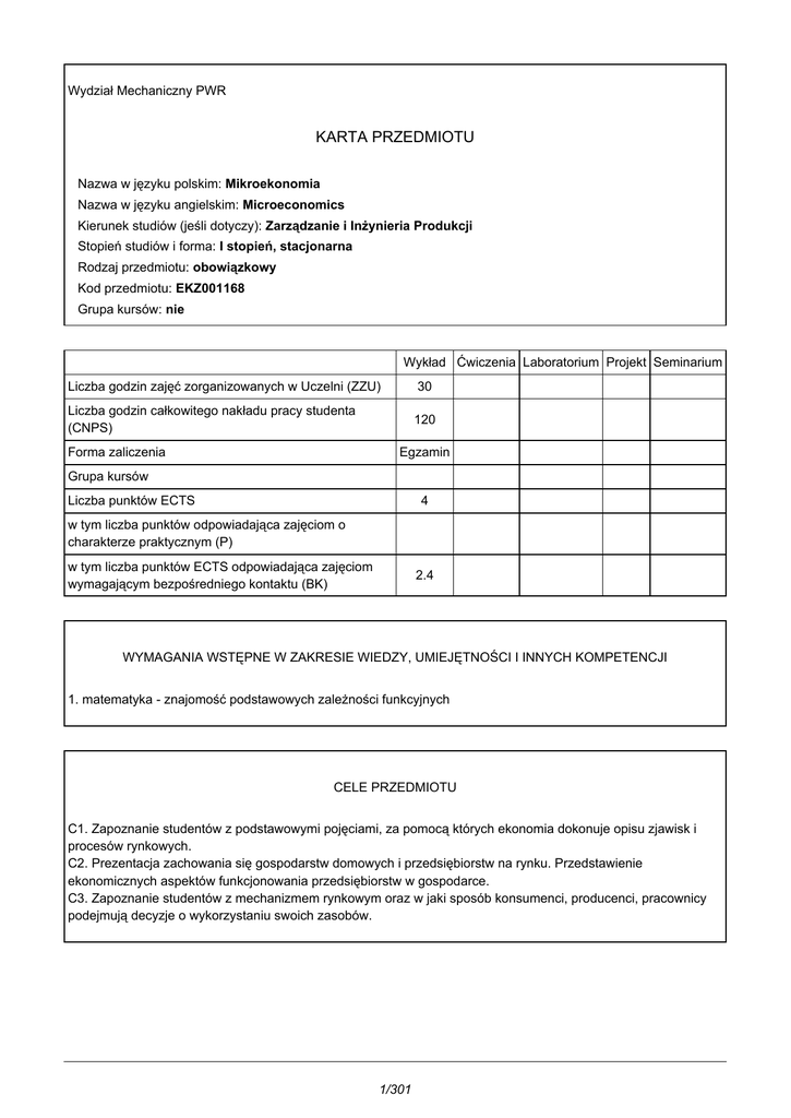 Wydział Mechaniczny PWR KARTA PRZEDMIOTU Nazwa w języku polskim: Mikroekonomia Nazwa w języku angielskim: Microeconomics Kierunek studiów (jeśli dotyczy): Zarządzanie i Inżynieria Produkcji Stopień studiów i forma: I stopień, stacjonarna Rodzaj przedmiotu: obowiązkowy Kod przedmiotu: EKZ001168 Grupa kursów: nie Wykład Ćwiczenia Laboratorium Projekt Seminarium Liczba godzin zajęć zorganizowanych w Uczelni (ZZU) 30 Liczba godzin całkowitego nakładu pracy studenta (CNPS) 120 Forma zaliczenia Egzamin Grupa kursów Liczba punktów ECTS 4 w tym liczba punktów odpowiadająca zajęciom o charakterze praktycznym (P) w tym liczba punktów ECTS odpowiadająca zajęciom wymagającym bezpośredniego kontaktu (BK) 2.4 WYMAGANIA WSTĘPNE W ZAKRESIE WIEDZY, UMIEJĘTNOŚCI I INNYCH KOMPETENCJI 1. matematyka - znajomość podstawowych zależności funkcyjnych CELE PRZEDMIOTU C1. Zapoznanie studentów z podstawowymi pojęciami, za pomocą których ekonomia dokonuje opisu zjawisk i procesów rynkowych. C2. Prezentacja zachowania się gospodarstw domowych i przedsiębiorstw na rynku. Przedstawienie ekonomicznych aspektów funkcjonowania przedsiębiorstw w gospodarce. C3. Zapoznanie studentów z mechanizmem rynkowym oraz w jaki sposób konsumenci, producenci, pracownicy podejmują decyzje o wykorzystaniu swoich zasobów. 1/301 PRZEDMIOTOWE EFEKTY KSZTAŁCENIA I. Z zakresu wiedzy: PEK_W01 - Zna i rozumie podstawowe pojęcia, prawa ekonomiczne i zjawiska gospodarcze oraz ich efekty w gospodarce rynkowej. PEK_W02 - Zna warunki i zasady podejmowania optymalnych decyzji przez podmioty rynkowe (producentów i konsumentów), PEK_W03 - Ma wiedzę na temat rynków i czynników produkcji II. Z zakresu umiejętności: III. Z zakresu kompetencji społecznych: TREŚCI PROGRAMOWE Forma zajęć – Wykład Liczba godzin Wy1 Wprowadzenie do ekonomii: ekonomia, gospodarowanie, podstawowe problemy ekonomiczne (przedmiot ekonomii), potrzeba, dobro (rodzaje dóbr według wybranych kryteriów klasyfikacji), zasób; strumień, ekonomia pozytywna, normatywna, mikroekonomia, makroekonomia; Ekonomia jako nauka, ceteris paribus. 2 Wy2 Główne nurty ekonomii: fizjokratyzm, merkantylizm, ekonomia klasyczna, szkoła neoklasyczna, keynesizm, monetaryzm, nowa szkoła austriacka, instytucjonalizm, 2 Wy3 Problem decyzji w ekonomii: pojęcie, rodzaje i założenia racjonalności działania (racjonalność rzeczywista i proceduralne), krótki okres, długi okres, krzywa możliwości produkcyjnych, koszt alternatywny, prawo rosnącego kosztu alternatywnego, produkt całkowity i marginalny, prawo malejącego produktu marginalnego, krzywa możliwości produkcyjnych a decyzje krótkookresowe i długookresowe, zasady optymalizacji decyzji. 2 Wy4 Rynek. Gospodarka rynkowa: rodzaje gospodarek i mechanizmy alokacji zasobów w tych gospodarkach, pojęcie rynku w ujęciu wybranych szkół ekonomicznych, elementy rynku. Konkurencja. 2 Wy5 Popyt, podaż, cena: Rynek i jego elementy; Popyt, funkcja popytu, determinanty popytu, zapotrzebowanie (wielkość popytu), prawo popytu; Nietypowe krzywe popytu (efekt owczego pędu i snobizmu, paradoks Giffena, paradoks Veblena); Podaż, funkcja i determinanty podaży, ilość oferowana (wielkość podaży), prawo podaży; 2 Wy6 Reakcja popytu na zmiany cen i dochodów. Elastyczność cenowa podaży: Elastyczność: cenowa popytu (punktowa, łukowa), dochodowa popytu (dobra niższego rzędu, normalne, pierwszej potrzeby, luksusowe, prawo i krzywa Engla), mieszana cenowa popytu (dobra substytucyjne, komplementarne, neutralne), cenowa podaży; podatku kwotowego - koszty i transfery. 2 Wy7 Mechanizm rynkowy: cena maksymalna i minimalna; równowaga rynkowa, nadwyżka: konsumenta, producenta. Zachowanie organizacji na rynku. 2 Wy8 Teoria wyboru konsumenta: teoria użyteczności, linia budżetowa, krzywa obojętności, krańcowa stopa substytucji; ścieżka wzrostu dochodu; efekt substytucyjny i dochodowy; Indywidualna krzywa popytu, preferencje klienta a transfery rzeczowe i gotówkowe; 2 2/301 Wy9 Przedsiębiorstwo i jego funkcje w gospodarce: Cele i formy organizacyjno-prawne przedsiębiorstw; koszt alternatywny i księgowy; zysk ekonomicznego i księgowy. Ekonomiczne aspekty funkcjonowania organizacji non profit. 2 Wy10 Koszty i przychody w przedsiębiorstwie w krótkim okresie: krótki okres; Prawo malejącej wydajności dodatkowych nakładów; koszt: stały, zmienny, przeciętny, marginalny, związki między tymi kosztami; przychód: całkowity, marginalny, optymalna wielkość produkcji w krótkim okresie. 2 Wy11 Decyzje producenta dotyczące optymalnej wielkości produkcji w długim okresie: wybór techniki produkcji, izokwanta, krańcowa stopa technicznej substytucji czynników produkcji; kapitałochłonność, pracochłonność, izokoszta. Koszty przeciętne w długim okresie (korzyści, niekorzyści skali produkcji). Optymalna wielkość produkcji w długim okresie. 2 Wy12 Struktury rynku. Charakterystyka porównawcza struktur rynku: konkurencja doskonała, konkurencja monopolistyczna, oligopol, monopol, monopson. Równowaga przedsiębiorstwa w warunkach konkurencji doskonałej i monopolu naturalnego. 2 Wy13 Analiza rynków czynników produkcji: Popyt na czynniki produkcji; krańcowy przychód z zasobu; popyt na zasoby a maksymalizacja zysku przedsiębiorstw; rynek: pracy, kapitału; ziemi (renta ekonomiczna). 2 Wy14 Wpływ czynników ekonomicznych na bezpieczeństwo instytucji i procesy zarządzania: Ryzyko, niepewność; malejąca użyteczność krańcowa; łączenie i dzielenie ryzyka; ryzyko moralne; selekcja negatywna; portfel inwestycyjny; teoria rynków efektywnych; rynki: asekuracyjne, transakcji terminowych; cena spot. 2 Wy15 Ekonomia dobrobytu: Zróżnicowanie dochodów i majątku. Źródła nierówności. Efektywna alokacja zasobów. Efektywność w sensie Pareto. Równość a efektywność. Zawodność rynku. Efekty zewnętrzne. Prywatne a społeczne koszty i korzyści. Efekty zew