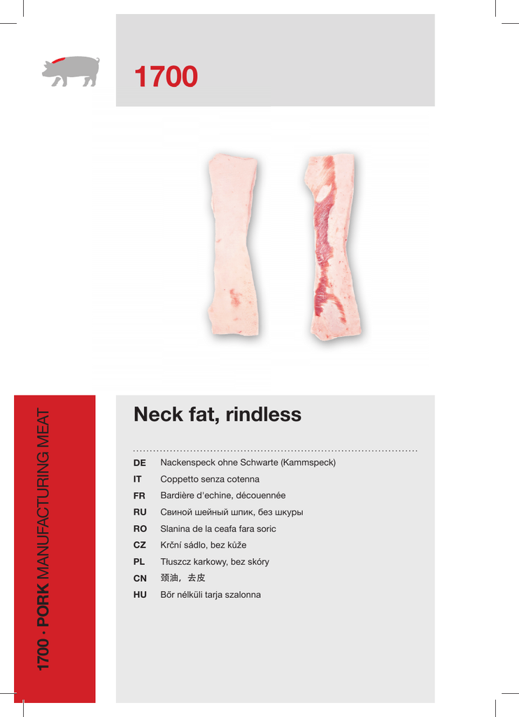 1700 · PORK MANUFACTURING MEAT 1700 Neck fat, rindless DE Nackenspeck ohne Schwarte (Kammspeck) IT Coppetto senza cotenna FR Bardière d'echine, découennée RU Cвиной шейный шпик, без шкуры RO Slanina de la ceafa fara soric CZ Krční sádlo, bez kůže PL Tłuszcz karkowy, bez skóry CN 颈油,去皮 HU Bőr nélküli tarja szalonna