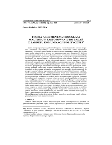 Humanities and Social Sciences HSS, vol. XXI, 23 (1/2016), pp. 123-136 2016 January - March Joanna Kazimiera SKULSKA1 TEORIA ARGUMENTACJI DOUGLASA WALTONA W ZASTOSOWANIU DO BADAŃ Z ZAKRESU KOMUNIKACJI POLITYCZNEJ2 Celem niniejszego artykułu jest metodologiczna ocena użyteczności narzędzi (w postaci schematów argumentacji), jakich dostarcza współczesna teoria argumentacji Douglasa N. Waltona w zastosowaniu do badań z zakresu komunikacji politycznej. Jest to zatem próba odpowiedzi na pytanie: czy zaproponowane przez Douglasa N. Waltona schematy argumentacji są możliwą do zastosowania w badaniach z zakresu komunikacji politycznej (analizach wypowiedzi argumentacyjnych wyrażonych w języku naturalnym) alternatywą dla nieadekwatnych i nieskutecznych w tym zakresie narzędzi, dostarczanych przez logikę formalną? W tym celu opisano kluczowe pojęcia, stanowiące bazę dla niniejszych rozważań, m.in. podejście dialogowe, reprezentowane przez Jürgena Habermasa, będące jednym z kluczowych paradygmatów badań, dotyczących sposobów komunikowania politycznego oraz niemonotonicznego charakteru nauk społecznych. Dialogiczna struktura komunikacji stanowi fundament wypowiedzi argumentacyjnych, co umożliwia wykorzystanie schematów argumentacji jako narzędzi metodologicznych do przeprowadzania badań z tego zakresu, zaś niemonotoniczność jest trzonem współczesnych koncepcji, związanych z teorią argumentacji, w tym także waltonowskiej koncepcji schematów argumentacji. Działania te doprowadzą w konsekwencji do próby wykazania, że zaproponowane w niniejszym artykule analizy argumentacyjne w obszarze zachowań komunikacyjnych mogą mieć znaczący wpływ na rozwój metodologii badań politycznych oraz weryfikację dotychczasowych sposobów ich interpretacji. Przeprowadzenie badań i analiz argumentacyjnych w obszarze politycznych zachowań komunikacyjnych ma duże znaczenie dla zrozumienia istniejącej rzeczywistości politycznej. Zastosowanie wyników badań współczesnej teorii argumentacji do badania dyskursu naturalnego politologii znacząco wpłynie na rozwój metodologii badań politologicznych. Zwróci uwagę na problem nieuniknionego wartościowania, podejmowania decyzji oraz niemonotoniczności wyciąganych wniosków. Teoria argumentacji jest aktualnie bardzo burzliwie rozwijającą się nauką i podsuwa wiele rozwiązań w tej dziedzinie. Słowa kluczowe: logika nieformalna, dyskurs naturalny, metodologia badań politologicznych, rozumowania niemonotoniczne. 1. WSTĘP Jednym z kluczowych nurtów współczesnych badań nad argumentacją jest tzw. logika nieformalna (informal logic). Wśród jej czołowych przedstawicieli należy wymie1 Mgr Joanna Kazimiera Skulska, Wojskowa Akademia Techniczna w Warszawie, Wydział Cybernetyki, ul. gen. Sylwestra Kaliskiego 2, 00–908 Warszawa 49, tel.: (22) 683 95 24, e-mail: [email protected] 2 Niniejszy tytuł jest tożsamy z tytułem pracy doktorskiej Joanny Skulskiej, która stanowiła inspirację dla powstania niniejszego artykułu. 124 J.K. Skulska nić takich uczonych, jak J. Anthony Blair, Ralph H. Johnson czy Douglas Walton3. Motywacją do stworzenia tej koncepcji była chęć zaangażowania narzędzi logiki do zastosowań, takich jak analiza i ocena argumentacji prowadzonej w życiu codziennym, w politycznych debatach, prawnych sporach, czy społecznych komentarzach charakterystycznych dla gazet, telewizji, internetu. Charakterystyczną cechą tego typu argumentów jest po pierwsze – ich dialogiczna struktura, po drugie – niemonotoniczny (podważalny) charakter. Logika nieformalna dostarcza metodologicznych narzędzi w postaci schematów argumentacji, które umożliwiają tego typu analizę. Schematy argumentacji obejmują dedukcyjne formy rozumowania, jak modus ponens, i indukcyjne formy, jak argument ze zgromadzonych zbiorów danych do statystycznego wniosku wynikającego z tych danych. Ten rodzaj rozumowania wspomaga wnioskowanie w wypadku jego niekompletności, umożliwia domyślenie się niewiadomych danych. Stanowi on zatem idealne narzędzie wspierające, stosowaną w naukach społecznych, analizę „języka” w danym dyskursie naturalnym. Podobnie jak wszystkie nauki o społeczeństwie, tak i politologia ma indukcyjne pochodzenie4. Metody, jakimi posługuje się politologia, osadzone są zatem we współczesnym pojęciu rozumowań niepewnych (nonmonotonic, defeasible, presumptive)5. Rozumowania te pod pewnym względem stanowią odpowiednik reguł inferencji monotonicznych systemów dedukcyjnych z jedną jednak różnicą. Wniosek wyprowadzony na podstawie rozumowania niemonotonicznego nie jest przyjęty z całkowitą pewnością. Rozszerzenie zbioru przesłanek o jakieś nowe informacje zobowiązuje (commit) nas do wycofania poprzedniego wniosku i przyjęcia nowego. Rozumowania te opierają się nie na przesłankach koniecznych, ale na przesłankach prawdopodobnych. Przesłankach, które opisują najczęściej (zazwyczaj) występującą sytuację, przesłanki te są zazwyczaj (choć nie zawsze) prawdziwe. Podstawę poznania politologicznego stanowią materiały źródłowe. Dostarczają one określonych informacji nazywanych wiedzą źródłową. Z punktu widzenia poznania politologicznego źródłem jest każdy utrwalony i zachowany ślad myśli, działania oraz aktywności ludzkiej służący do jego deskrypcji, eksplantacji oraz przewidywania związanej z nim rzeczywistości politycznej 6. Owe materiały źródłowe, które stanowią podstawę poznania politologicznego, są mocno związane ze zjawiskiem komunikacji międzyludzkiej. Badania nad dyskursem są związane z przekonaniem, „że rzeczywistość 3 Zob. R.H. Johnson, T. Blair, Logical Self-Defence, Toronto 1977; D. Walton, Informal Logic: A Handbook for Critical Argumentation, Cambridge University Press, New York 1989. 4 Indukcja (łac. inductio – wprowadzenie) to typ rozumowania redukcyjnego. Określa się je jako wnioskowanie „od s