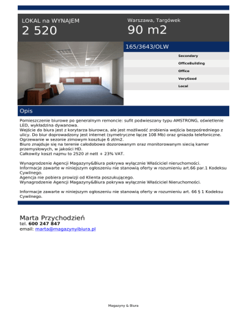 LOKAL na WYNAJEM 2 520 Warszawa, Targówek 90 m2 165/3643/OLW Secondary OfficeBuilding Office VeryGood Local Opis Pomieszczenie biurowe po generalnym remoncie: sufit podwieszany typu AMSTRONG, oświetlenie LED, wykładzina dywanowa. Wejście do biura jest z korytarza biurowca, ale jest możliwość zrobienia wejścia bezpośredniego z ulicy. Do biur doprowadzony jest internet (symetryczne łącze 108 Mb) oraz gniazda telefoniczne. Ogrzewanie w sezonie zimowym kosztuje 6 zł/m2. Biuro znajduje się na terenie całodobowo dozorowanym oraz monitorowanym siecią kamer przemysłowych, w jakości HD. Całkowity koszt najmu to 2520 zł nett + 23% VAT. Wynagrodzenie Agencji Magazyny&Biura pokrywa wyłącznie Właściciel nieruchomości. Informacje zawarte w niniejszym ogłoszeniu nie stanowią oferty w rozumieniu art.66 par.1 Kodeksu Cywilnego. Agencja nie pobiera prowizji od Klienta poszukującego. Wynagrodzenie Agencji Magazyny&Biura pokrywa wyłącznie Właściciel Nieruchomości. Informacje zawarte w niniejszym ogłoszeniu nie stanowią oferty w rozumieniu art. 66 § 1 Kodeksu Cywilnego. Marta Przychodzień tel. 600 247 847 email: [email protected] Magazyny & Biura Powered by TCPDF (www.tcpdf.org)