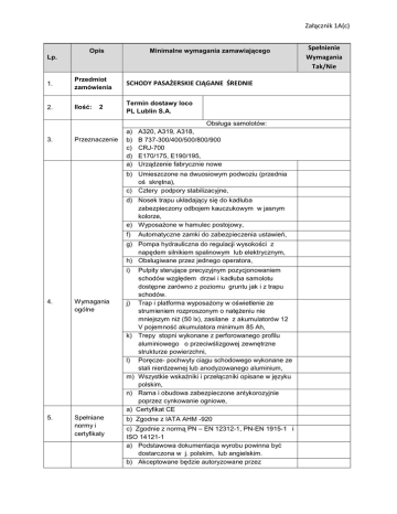 Załącznik 1A(c) Minimalne wymagania zamawiającego Opis Lp. 1. Przedmiot zamówienia SCHODY PASAŻERSKIE CIĄGANE ŚREDNIE 2. Ilość: Termin dostawy loco PL Lublin S.A. 3. 2 Przeznaczenie a) b) c) d) a) Obsługa samolotów: A320, A319, A318, B 737-300/400/500/800/900 CRJ-700 E170/175, E190/195, Urządzenie fabrycznie nowe b) Umieszczone na dwuosiowym podwoziu (przednia oś skrętna), c) Cztery podpory stabilizacyjne, d) Nosek trapu układający się do kadłuba zabezpieczony odbojem kauczukowym w jasnym kolorze, e) Wyposażone w hamulec postojowy, f) Automatyczne zamki do zabezpieczenia ustawień, g) Pompa hydrauliczna do regulacji wysokości z napędem silnikiem spalinowym lub elektrycznym, h) Obsługiwane przez jednego operatora, Pulpity sterujące precyzyjnym pozycjonowaniem schodów względem drzwi i kadłuba samolotu dostępne zarówno z poziomu gruntu jak i z trapu schodów. j) Trap i platforma wyposażony w oświetlenie ze strumieniem rozproszonym o natężeniu nie mniejszym niż (50 lx), zasilane z akumulatorów 12 V pojemność akumulatora minimum 85 Ah, k) Trepy stopni wykonane z perforowanego profilu aluminiowego o przeciwślizgowej zewnętrzne strukturze powierzchni, l) Poręcze- pochwyty ciągu schodowego wykonane ze stali nierdzewnej lub anodyzowanego aluminium, m) Wszystkie wskaźniki i przełączniki opisane w języku polskim, n) Rama i obudowa zabezpieczone antykorozyjnie poprzez cynkowanie ogniowe, a) Certyfikat CE i) 4. Wymagania ogólne 5. Spełniane normy i certyfikaty b) Zgodne z IATA AHM -920 c) Zgodnie z normą PN – EN 12312-1, PN-EN 1915-1 i ISO 14121-1 a) Podstawowa dokumentacja wyrobu powinna być dostarczona w j. polskim, lub angielskim. b) Akceptowane będzie autoryzowane przez Spełnienie Wymagania Tak/Nie Załącznik 1A(c) c) 6. Dokumentacja d) a) b) 7. Gwarancja, serwis c) d) a) b) c) d) e) 8. Dane techniczne f) producenta tłumaczenie dokumentacji wyrobu na j. polski, a dotyczące w szczególności; Instrukcji Obsługi, Instrukcji Napraw, zaleceń dotyczących bezpieczeństwa użytkowania wyrobu. Autoryzowany przez producenta Katalog części zamiennych wraz z rysunkami powinien być dostarczony w j. polskim lub w j. angielskim. Wszelkie zmiany dokumentacji, biuletyny obsługowe lub serwisowe dotyczące wyrobu albo dokumenty podobne, będą dostarczane bezpłatnie do zamawiającego, w terminie bezzwłocznym od daty wydania Gwarancja dotycząca wyrobu i dokumentacji, zapewniona na okres 24 miesiące, licząc od daty przyjęcia wyrobu przez zamawiającego. Z chwilą wymiany wyrobu, zespołu lub części w ramach gwarancji, następuje automatyczne przedłużenie gwarancji odpowiednio na ten wyrób, zespół lub część, na okres wyszczególniony w pp. a) powyżej. Gwarancja na dostawę części zamiennych i/lub remont wyrobu, będzie zapewniona w okresie 10 lat licząc od daty przyjęcia wyrobu przez zamawiającego. Gwarancja dotycząca serwisu gwarancyjnego/pogwarancyjnego, dostawy części zamiennych, oraz dostaw dokumentacji dotyczącej wyrobu - loco PL Lublin, będzie zapewniona w czasie 7 dni kalendarzowych, od daty zgłoszenia zamówienia. Zakres roboczy operacyjny minimalny : 2400 mm do 3800 mm, Dopuszczalne obciążenia podestu 480 kg , Pomost podnoszony przez siłownik hydrauliczny sterowany pompą hydrauliczną o napędzie elektrycznym lub spalinowym, Zabezpieczenie schodów podczas pracy jak i postoju poprzez układ mechaniczno-hydrauliczny stabilizatorów, Szerokość ciągu schodowego nie większa niż 1300mm. Szerokość podestu nie mniej niż 2350mm . g) Dyszel w wykonaniu standardowym (oczko Ø 76)przewidzianym do podczepiania ciągników lotniskowych, chowany na czas pracy schodów h) Koła gumowe pełne lub pneumatyczne i) j) Schody wyposażone w pasy bezpieczeństwa na wejściu jak i pomoście górnym Burty boczne górne przesuwne z blokadą k) Pomost jak i burty przesuwne wyposażone w odbój ochronny niebrudzący Załącznik 1A(c) Prędkość trakcyjna holowania nie mniej niż 20 km/godz. m) Stabilność przy obciążeniach wiatrowych 75 km/godz. a) Światło antykolizyjne odblaskowe (przód i tył ) l) 9. Wyposażenie dodatkowe a) Producent przeszkoli 4 przedstawicieli zamawiającego, w uzgodnionym terminie, przed terminem dostawy wyrobu loco PL Lublin. 10. Szkolenie personelu b) Producent zapewni przeszkolenie personelu zmawiającego w zakresie bezpiecznej obsługi wyrobu oraz przeszkolenie w zakresie serwisu podstawowego (podstawowe naprawy, wymiana części lub zespołów, konserwacja wyrobu). Szczegółowy zakres przeszkolenia będzie przedmiotem zapisu w umowie na dostawę wyrobu. c) Przeszkolony personel otrzyma Zaświadczenia lub Certyfikaty producenta. Wzory w/w dokumentów będą uzgodnione pomiędzy Stronami. d) Miejsce szkolenia zostanie uzgodnione pomiędzy dostawcą, a producentem. e) Producent zapewni na każde żądanie konsultacje techniczne dla personelu zamawiającego, zapewniające bezpieczną eksploatację wyrobu. a) Standard i kolor pokrycia lakierniczego wyrobu: RAL 9016 b) Gwarancja producenta dotycząca skuteczności zabezpieczenia antykorozyjnego: 3 lata od dostawy, 11. Inne c) Producent gwarantuje, że wyrób nie generuje zakłóceń radiowych i spełnia odpowiednie normy dot. ochrony środowiska naturalnego. d) Zostaną naniesione w sposób trwały, według wzoru dostarczonego przez zamawiającego logo PL Lublin i napisy identyfikujące użytkownika. e) Producent gwarantuje spełnienie wymagań homologacyjnych i/lub przepisów dozoru technicznego (jeżeli to wymagane), f) Wyrób będzie wyposażony w wymagane oświetlenie, g) Wyrób będzie wyposażony w blokady postojowe kół lub wyposażenie podobne, h) Wyrób będzie wyposażony w koło zapasowe jezdne, i) Producent dostarczy wraz z wyrobem uzgodnione z zamawiającym niezbędne rysunki, plany, procedury lub instrukcje obsługi wyrobu, wraz z zestawem części zamiennych dla serwisu podstawowego oraz zestawem narzędzi i wyposażenia wymaganego do bez