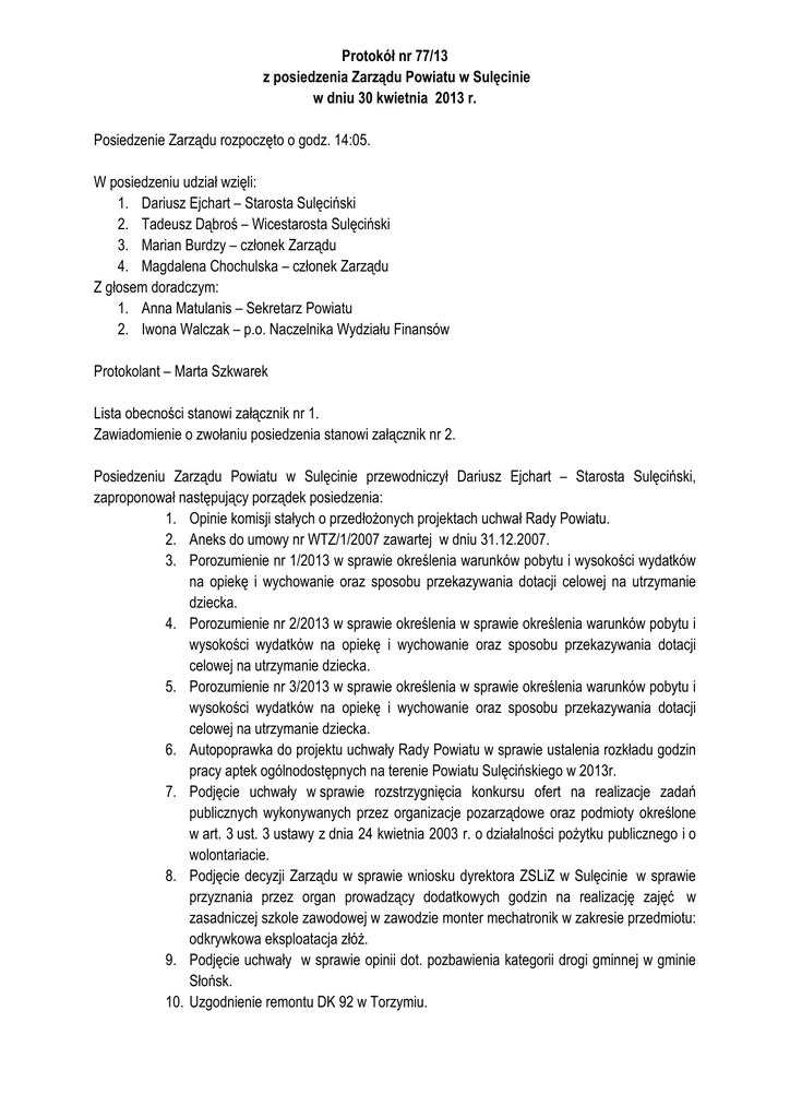 Protokół nr 77/13 z posiedzenia Zarządu Powiatu w Sulęcinie w dniu 30 kwietnia 2013 r. Posiedzenie Zarządu rozpoczęto o godz. 14:05. W posiedzeniu udział wzięli: 1. Dariusz Ejchart – Starosta Sulęciński 2. Tadeusz Dąbroś – Wicestarosta Sulęciński 3. Marian Burdzy – członek Zarządu 4. Magdalena Chochulska – członek Zarządu Z głosem doradczym: 1. Anna Matulanis – Sekretarz Powiatu 2. Iwona Walczak – p.o. Naczelnika Wydziału Finansów Protokolant – Marta Szkwarek Lista obecności stanowi załącznik nr 1. Zawiadomienie o zwołaniu posiedzenia stanowi załącznik nr 2. Posiedzeniu Zarządu Powiatu w Sulęcinie przewodniczył Dariusz Ejchart – Starosta Sulęciński, zaproponował następujący porządek posiedzenia: 1. Opinie komisji stałych o przedłożonych projektach uchwał Rady Powiatu. 2. Aneks do umowy nr WTZ/1/2007 zawartej w dniu 31.12.2007. 3. Porozumienie nr 1/2013 w sprawie określenia warunków pobytu i wysokości wydatków na opiekę i wychowanie oraz sposobu przekazywania dotacji celowej na utrzymanie dziecka. 4. Porozumienie nr 2/2013 w sprawie określenia w sprawie określenia warunków pobytu i wysokości wydatków na opiekę i wychowanie oraz sposobu przekazywania dotacji celowej na utrzymanie dziecka. 5. Porozumienie nr 3/2013 w sprawie określenia w sprawie określenia warunków pobytu i wysokości wydatków na opiekę i wychowanie oraz sposobu przekazywania dotacji celowej na utrzymanie dziecka. 6. Autopoprawka do projektu uchwały Rady Powiatu w sprawie ustalenia rozkładu godzin pracy aptek ogólnodostępnych na terenie Powiatu Sulęcińskiego w 2013r. 7. Podjęcie uchwały w sprawie rozstrzygnięcia konkursu ofert na realizacje zadań publicznych wykonywanych przez organizacje pozarządowe oraz podmioty określone w art. 3 ust. 3 ustawy z dnia 24 kwietnia 2003 r. o działalności pożytku publicznego i o wolontariacie. 8. Podjęcie decyzji Zarządu w sprawie wniosku dyrektora ZSLiZ w Sulęcinie w sprawie przyznania przez organ prowadzący dodatkowych godzin na realizację zajęć w zasadniczej szkole zawodowej w zawodzie monter mechatronik w zakresie przedmiotu: odkrywkowa eksploatacja złóż. 9. Podjęcie uchwały w sprawie opinii dot. pozbawienia kategorii drogi gminnej w gminie Słońsk. 10. Uzgodnienie remontu DK 92 w Torzymiu. 11. Wyrażenie zgody na rozstrzygniecie przetargu dot. programu szwajcarskiego m. Prześlice i Rychlik. 12. Wniosek szkoły tańca „Viktor” o ufundowanie pucharów i medali w ramach „Ogólnopolskiego Turnieju Tańca Towarzyskiego o Puchar Starosty Sulęcińskiego” (1606-2013r). 13. Podjęcie uchwały w sprawie zmiany w budżecie powiatu na rok 2013. 14. Autopoprawka do projektu uchwały Rady Powiatu w sprawie zmiany uchwały budżetowej powiatu na 2013 rok 15. Autopoprawka do projektu uchwały Rady Powiatu w sprawie zmiany uchwały w sprawie Wieloletniej Prognozy Finansowej Powiatu na lata 2013-2024. 16. Zatwierdzenie łącznych sprawozdań finansowych powiatu za rok 2012. 17. Wnioski i zapytania. Członkowie Zarządu przyjęli porządek obrad przy 4 głosach „za”, bez głosów „przeciw”, bez głosów „wstrzymujących się” (na 4 obecnych). Ad.1 Opinie komisji stałych o przedłożonych projektach uchwał Rady Powiatu. Anna Matulanis – Sekretarz Powiatu poinformowała, że projekt uchwały przedłożony komisjom do zaopiniowana w sprawie ustalenia rozkładu godzin pracy aptek ogólnodostępnych na terenie Powiatu Sulęcińskiego w 2013 r., został zaopiniowany negatywnie na posiedzeniu Komisji Rolnictwa, Ochrony Środowiska, Drogownictwa i Porządku Publicznego, pozostałe projekty uchwał przedłożone komisjom do zaopiniowania uzyskały opinię pozytywną. Komisja Rolnictwa, Drogownictwa i Porządku Publicznego wniosła wniosek o zmianę uzasadnienia do projektu w/w uchwały. Pozostałe Komisje nie wniosły uwag ani wniosków do projektów uchwał. Opinie komisji stanowią załącznik nr 3 do protokołu. Ad.2 Aneks do umowy nr WTZ/1/2007 zawartej w dniu 31.12.2007. Aneks przedstawił Tomasz Szablewski – Kierownik Powiatowego Centrum Pomocy Rodzinie. Aneks stanowi załącznik nr 4 do protokołu. Ad.3, Ad.4 i Ad.5 Porozumienie nr 1/2013, 2/2013, 3/2013 w sprawie określenia w sprawie określenia warunków pobytu i wysokości wydatków na opiekę i wychowanie oraz sposobu przekazywania dotacji celowej na utrzymanie dziecka. Porozumienia przedstawił Tomasz Szablewski – Kierownik Powiatowego Centrum Pomocy Rodzinie. Zarząd podjął decyzję o podpisaniu porozumienia nr 1/2013, 2/2013, 3/12013 przy 4 głosach „za”, bez głosów „przeciw”, bez głosów „ wstrzymujących się” (na 4 obecnych). Porozumienia stanowią załącznik nr 5, 6 i 7 do protokołu. Ad.6 Autopoprawka do projektu uchwały Rady Powiatu w sprawie ustalenia rozkładu godzin pracy aptek ogólnodostępnych na terenie Powiatu Sulęcińskiego w 2013r. Autopoprawkę do projektu uchwały przedstawiła Grażyna Jaśnikowska – Naczelnik Wydziału Promocji, Edukacji i Spraw Społecznych. Poinformowała, że autopoprawka dot. : • błędu pisarskiego dot. nie uwzględnienia w 6 kolumnie ostatnim wierszu dyżuru nocnego • zmiany godzin pracy apteki „Lub-far” Zarząd przyjął autopoprawkę i skierował projekt uchwały pod obrady Rady Powiatu przy 4 głosach „za”, bez głosów „przeciw:, bez głosów „wstrzymujących się”(na 4 obecnych). Projekt uchwały wraz z autopoprawką stanowi załącznik nr 8 do protokołu. Ad.7 Podjęcie uchwały w sprawie rozstrzygnięcia konkursu ofert na realizacje zadań publicznych wykonywanych przez organizacje pozarządowe oraz podmioty określone w art. 3 ust. 3 ustawy z dnia 24 kwietnia 2003 r. o działalności pożytku publicznego i o wolontariacie. Projekt uchwały przedstawiła Grażyna Jaśnikowska – Naczelnik Wydziału Promocji, Edukacji i Spraw Społecznych. Poinformowała, że wpłynęło 19 ofert na realizację w/w zadania, wszystkie ofert zostały p