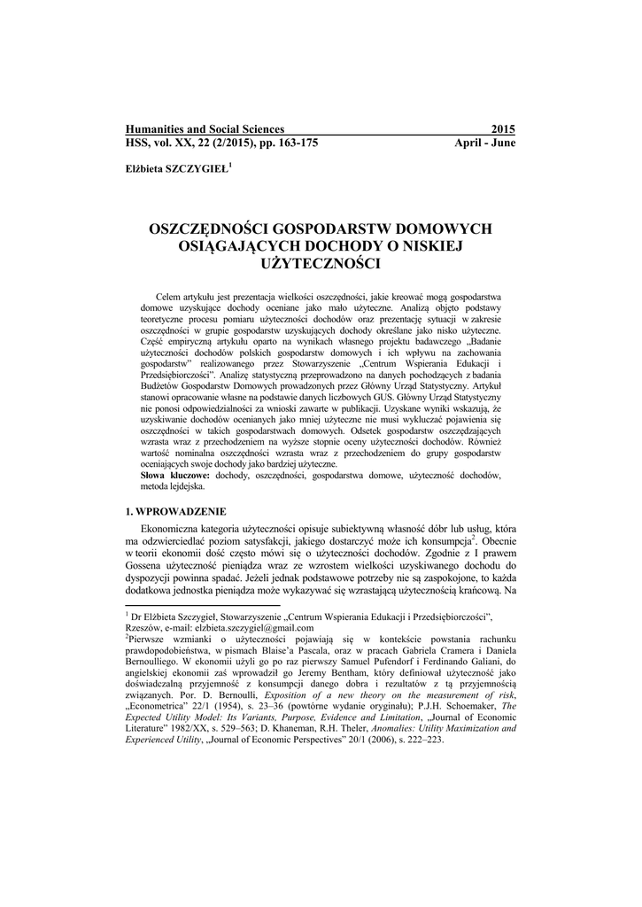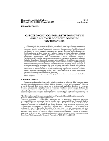 Humanities and Social Sciences HSS, vol. XX, 22 (2/2015), pp. 163-175 2015 April - June Elżbieta SZCZYGIEŁ1 OSZCZĘDNOŚCI GOSPODARSTW DOMOWYCH OSIĄGAJĄCYCH DOCHODY O NISKIEJ UŻYTECZNOŚCI Celem artykułu jest prezentacja wielkości oszczędności, jakie kreować mogą gospodarstwa domowe uzyskujące dochody oceniane jako mało użyteczne. Analizą objęto podstawy teoretyczne procesu pomiaru użyteczności dochodów oraz prezentację sytuacji w zakresie oszczędności w grupie gospodarstw uzyskujących dochody określane jako nisko użyteczne. Część empiryczną artykułu oparto na wynikach własnego projektu badawczego „Badanie użyteczności dochodów polskich gospodarstw domowych i ich wpływu na zachowania gospodarstw” realizowanego przez Stowarzyszenie „Centrum Wspierania Edukacji i Przedsiębiorczości”. Analizę statystyczną przeprowadzono na danych pochodzących z badania Budżetów Gospodarstw Domowych prowadzonych przez Główny Urząd Statystyczny. Artykuł stanowi opracowanie własne na podstawie danych liczbowych GUS. Główny Urząd Statystyczny nie ponosi odpowiedzialności za wnioski zawarte w publikacji. Uzyskane wyniki wskazują, że uzyskiwanie dochodów ocenianych jako mniej użyteczne nie musi wykluczać pojawienia się oszczędności w takich gospodarstwach domowych. Odsetek gospodarstw oszczędzających wzrasta wraz z przechodzeniem na wyższe stopnie oceny użyteczności dochodów. Również wartość nominalna oszczędności wzrasta wraz z przechodzeniem do grupy gospodarstw oceniających swoje dochody jako bardziej użyteczne. Słowa kluczowe: dochody, oszczędności, gospodarstwa domowe, użyteczność dochodów, metoda lejdejska. 1. WPROWADZENIE Ekonomiczna kategoria użyteczności opisuje subiektywną własność dóbr lub usług, która ma odzwierciedlać poziom satysfakcji, jakiego dostarczyć może ich konsumpcja2. Obecnie w teorii ekonomii dość często mówi się o użyteczności dochodów. Zgodnie z I prawem Gossena użyteczność pieniądza wraz ze wzrostem wielkości uzyskiwanego dochodu do dyspozycji powinna spadać. Jeżeli jednak podstawowe potrzeby nie są zaspokojone, to każda dodatkowa jednostka pieniądza może wykazywać się wzrastającą użytecznością krańcową. Na 1 Dr Elżbieta Szczygieł, Stowarzyszenie „Centrum Wspierania Edukacji i Przedsiębiorczości”, Rzeszów, e-mail: [email protected] 2 Pierwsze wzmianki o użyteczności pojawiają się w kontekście powstania rachunku prawdopodobieństwa, w pismach Blaise’a Pascala, oraz w pracach Gabriela Cramera i Daniela Bernoulliego. W ekonomii użyli go po raz pierwszy Samuel Pufendorf i Ferdinando Galiani, do angielskiej ekonomii zaś wprowadził go Jeremy Bentham, który definiował użyteczność jako doświadczalną przyjemność z konsumpcji danego dobra i rezultatów z tą przyjemnością związanych. Por. D. Bernoulli, Exposition of a new theory on the measurement of risk, „Econometrica” 22/1 (1954), s. 23–36 (powtórne wydanie oryginału); P.J.H. Schoemaker, The Expected Utility Model: Its Variants, Purpose, Evidence and Limitation, „Journal of Economic Literature” 1982/XX, s. 529–563; D. Khaneman, R.H. Theler, Anomalies: Utility Maximization and Experienced Utility, „Journal of Economic Perspectives” 20/1 (2006), s. 222–223. 164 E. Szczygieł istnienie tej zależności zwrócili uwagę Arie Kapteyn i Tom Wansbeek, wykazując, że nie jest ona podstawą do uchylenia I prawa Gossena, ale że jest to własność wręcz pożądana3. Pomiar użyteczności dochodów odbywa się obecnie na podstawie danych uzyskiwanych od samych gospodarstw domowych, które mają możliwość dokonania werbalnej oceny poziomu uzyskiwanego dochodu oraz odniesienia poszczególnych ocen użyteczności do poziomu dochodów hipotetycznych (szerzej o pomiarze w dalszej części artykułu). Od poziomu oceny użyteczności realnego dochodu może zależeć wiele decyzji gospodarstwa domowego, w tym o odroczeniu konsumpcji, czyli kreowaniu oszczędności w danym okresie. Celem przeprowadzonego badania empirycznego stanowiącego przedmiot artykułu było uzyskanie odpowiedzi na pytanie, na ile czynnik, jakim jest ocena użyteczności danego, faktycznie uzyskiwanego dochodu, może wpływać na kreowanie oszczędności przez gospodarstwa domowe. Próbując zrealizować ten cel badawczy, przyjęto dwie hipotezy badawcze: H1: osiąganie dochodów ocenianych jako mniej użyteczne może nie wykluczać kreowania oszczędności. H2: wzrastającemu poziomowi użyteczności dochodów towarzyszy wzrastające prawdopodobieństwo kreowania oszczędności. W celu weryfikacji zaprezentowanych hipotez wykorzystano dane nieidentyfikowane pochodzące z badania budżetów gospodarstw domowych przeprowadzonego przez Główny Urząd Statystyczny (GUS) za rok 2012. Prezentowane wyniki badania nawiązują także do wcześniejszej analizy wpływu oceny użyteczności dochodu na wielkość oszczędności gospodarstw domowych, jakie autorka zaprezentowała w pracy pt. Ocena użyteczności dochodu i jej wpływ na oszczędności gospodarstw domowych4. Wspomniane opracowanie obejmowało jednak lata 2003-2009 i dotyczyło wszystkich poziomów oceny, zaś kwestie oceny w obecnie analizowanej grupie dochodowej zostały przedstawione jedynie sygnalnie. Niniejszy artykuł stanowi rozwinięcie i pogłębienie analizy podjętego uprzednio tematu poprzez opracowanie danych dla roku 2012 oraz zastosowanie poszerzonej analizy zjawiska dla gospodarstwach domowych osiągających dochody oceniane jako użyteczne w niskim stopniu. 2. MODEL POMIARU UŻYTECZNOŚCI DOCHODÓW Możliwość bezpośredniego pomiaru użyteczności dochodu została zaproponowana przez Bernarda M.S. van Praaga w roku 19685. Metoda ta opiera się na estymacji funkcji 3 Jak wskazuje Stanisław M. Kot za Arie Kapteynem i Tomem Wansbeekiem (S.M. Kot, Modelowanie poziomu dobrobytu. Teoria i zastosowanie, Zakład Narodowy im. Ossolińskich, Wroc