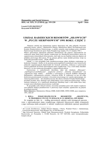 Humanities and Social Sciences HSS, vol. XIX, 21 (2/2014), pp. 193-220 2014 April – June Leszek PAWLIKOWICZ1 Krzysztof SUROWIEC2 UDZIAŁ RADZIECKICH RESORTÓW „SIŁOWYCH” W „PUCZU SIERPNIOWYM” 1991 ROKU. CZĘŚĆ 2 Niniejszy artykuł jest kontynuacją syntezy dotyczącej roli, jaką odegrały ówczesne radzieckie resorty „siłowe”: Ministerstwo Obrony, Ministerstwo Spraw Wewnętrznych oraz Komitet Bezpieczeństwa Państwowego, w próbie zamachu stanu podjętej przez członków Państwowego Komitetu do spraw Stanu Wyjątkowego między 19 a 21 sierpnia 1991 r. Wbrew pierwotnym założeniom planistów demonstracja siły poprzez wprowadzenie do większych miast dużej ilości sprzętu wojskowego nie zniechęciła przeciwników puczu do organizowania różnorodnych form protestu, choć stały się one bardziej widoczne dopiero od południa pierwszego dnia puczu. W tej sytuacji główny ciężar działań powinny wziąć na siebie dwa pozostałe resorty – KGB i MWD. Jednak i w tym przypadku brak skonkretyzowanego planu działania rozpisanego na konkretne formacje i służby aż do poziomu poszczególnych (centralnych oraz terenowych) jednostek organizacyjnych doprowadził do licznych zaniechań, zwłaszcza w pierwszych sześciu godzinach od chwili wprowadzenia stanu wyjątkowego. Trzy z nich miały charakter kluczowy i to one ostatecznie przesądziły o niepowodzeniu puczu Zastosowane w cudzysłowach określenia, takie jak: działania „filtracyjne”, „zapobiegawczo-profilaktyczne”, „negatywne postawy”, „elementy antyspołeczne” czy „zagraniczne kręgi władzy” – pochodzą z cytowanych w różnych źródłach oficjalnych dokumentów wspomnianych resortów, zwłaszcza KGB. W większości są one nie tylko dosłownie przytoczonymi zwrotami z ówcześnie stosowanego tzw. języka operacyjnego, ale stanowią jednocześnie – tak charakterystyczny dla okresu istnienia Związku Radzieckiego – przykład prymatu sfery ideologii nad całokształtem życia społeczno-politycznego. Należy zarazem zaznaczyć, że w państwach demokracji liberalnej część z nich miała nieco inny, a często nawet absolutnie przeciwstawny wydźwięk. W przypadku osób, których imiona, ówcześnie posiadane przez nich stopnie wojskowe oraz pełnione funkcje przedstawiono w pierwszej części artykułu, ograniczono się jedynie do podania nazwisk. Słowa kluczowe: Ministerstwo Obrony ZSRR, KGB ZSRR, MWD ZSRR, pucz sierpniowy 1991, GKCzP 1. ROLA POSZCZEGÓLNYCH RESORTÓW „SIŁOWYCH„ W PRZEBIEGU PUCZU W DNIACH 19–21 SIERPNIA 1991 ROKU Ze względu na fakt, że – według pierwotnych założeń osób kierujących puczem – wraz z wprowadzeniem stanu wyjątkowego większość kluczowych zadań związanych z jego realizacją miała przypaść w udziale wojskowym oddziałom operacji specjalnych 1 Dr Leszek Pawlikowicz, Zakład Historii Państwa i Prawa, Wydział Prawa i Administracji, Uniwersytet Rzeszowski, Aleja Rejtana 16c, 35-959 Rzeszów. 2 Mgr Krzysztof Surowiec, Zakład Nauk Humanistycznych, Wydział Zarządzania, Politechnika Rzeszowska, ul. Poznańska 1, 35-084 Rzeszów, tel. 017 8651204, autor korespondencyjny: [email protected] 194 L. Pawlikowicz, K. Surowiec oraz formacjom ogólnowojskowym znajdującym się w dyspozycji Ministerstwa Obrony, KGB i MWD, jak również ze względu na ich specyfikę – działania te zaprezentowano odrębnie od przedsięwzięć wykonywanych przez pozostałe formacje i służby podległe radzieckim resortom „siłowym”. 1.1. Działania wojskowych oddziałów operacji specjalnych oraz formacji ogólnowojskowych podległych Ministerstwu Obrony, MWD i KGB Dzień przed puczem, w niedzielę 18 sierpnia o godz. 8.00, marszałek Dmitrij Jazow spotkał się w Ministerstwie Obrony z dowódcą Moskiewskiego Okręgu Wojskowego – gen. płk. Nikołajem Kalininem oraz dowódcą wojsk powietrzno-desantowych – gen. mjr. Pawłem Graczowem3. Podczas rozmowy poinformował ich o możliwym wprowadzeniu stanu wyjątkowego, nakazując zarazem podniesienie gotowości bojowej oraz przygotowanie do redyslokacji do radzieckiej stolicy następujących oddziałów ze składu związków taktycznych resortu, które stacjonowały w pobliżu Moskwy: • trzech (1., 15. i 236.) pułków strzelców zmotoryzowanych oraz jednego pułku (290.) pancernego ze składu 2. „Tamańskiej” Dywizji Strzelców Zmotoryzowanych Gwardii; • trzech (12., 13. i 14.) pułków pancernych gwardii oraz jednego pułku (423.) strzelców zmotoryzowanych ze składu 4. „Kantemirowskiej” Dywizji Pancernej Gwardii; • trzech (51., 137. i 331.) pułków powietrzno-desantowych gwardii ze składu 106. „Tulskiej” Dywizji Powietrzno-Desantowej Gwardii4. Niemal dobę później, w poniedziałek 19 sierpnia o godz. 6.00, na krótkiej odprawie z kadrą dowódczą minister obrony osobiście odczytał treść komunikatu Państwowego Komitetu ds. Stanu Wyjątkowego, po czym wydał instrukcje: • wsparcia działań mających na celu zaprowadzenie porządku społecznego we współdziałaniu z formacjami MWD; • wzmocnienia ochrony obiektów wojskowych (zwłaszcza miejsc stałej dyslokacji wojsk oraz magazynów broni, w szczególności jądrowej); • zorganizowania ochrony siedzib naczelnych organów władzy, ważniejszych budynków użyteczności publicznej oraz środków masowego przekazu; • nieulegania prowokacjom sił zewnętrznych5. Tego samego dnia postawiono w stan gotowości bojowej również ogólnowojskowe związki taktyczne znajdujące się w dyspozycji pozostałych resortów „siłowych”: • 103. Dywizję Powietrzno-Desantową Gwardii KGB z Witebska (stacjonującą na terenie Białoruskiego Okręgu Wojskowego); 3 В. Степанков, Е. Лисов, Кремлевский заговор: Версия следствия, Огонек, Москва 1992, s. 20; J. Brusstar, E. Jones, The Russian Military’s Role in Politics, Institute for National Strategic Studies-National Defe