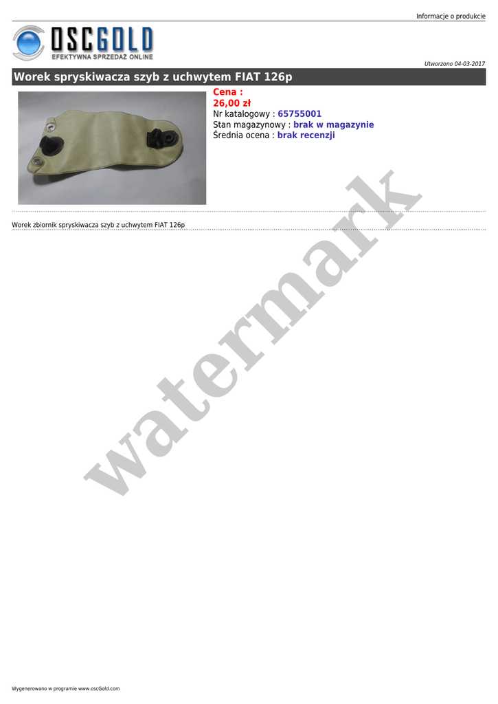 Informacje o produkcie Utworzono 04-03-2017 Worek spryskiwacza szyb z uchwytem FIAT 126p Cena : 26,00 zł er m ar k Nr katalogowy : 65755001 Stan magazynowy : brak w magazynie Średnia ocena : brak recenzji w at Worek zbiornik spryskiwacza szyb z uchwytem FIAT 126p Wygenerowano w programie www.oscGold.com