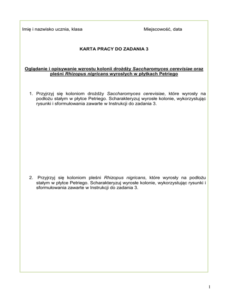 Imię i nazwisko ucznia, klasa Miejscowość, data KARTA PRACY DO ZADANIA 3 Oglądanie i opisywanie wzrostu kolonii drożdży Saccharomyces cerevisiae oraz pleśni Rhizopus nigricans wyrosłych w płytkach Petriego 1. Przyjrzyj się koloniom drożdży Saccharomyces cerevisiae, które wyrosły na podłożu stałym w płytce Petriego. Scharakteryzuj wyrosłe kolonie, wykorzystując rysunki i sformułowania zawarte w Instrukcji do zadania 3. 2. Przyjrzyj się koloniom pleśni Rhizopus nigricans, które wyrosły na podłożu stałym w płytce Petriego. Scharakteryzuj wyrosłe kolonie, wykorzystując rysunki i sformułowania zawarte w Instrukcji do zadania 3. 1