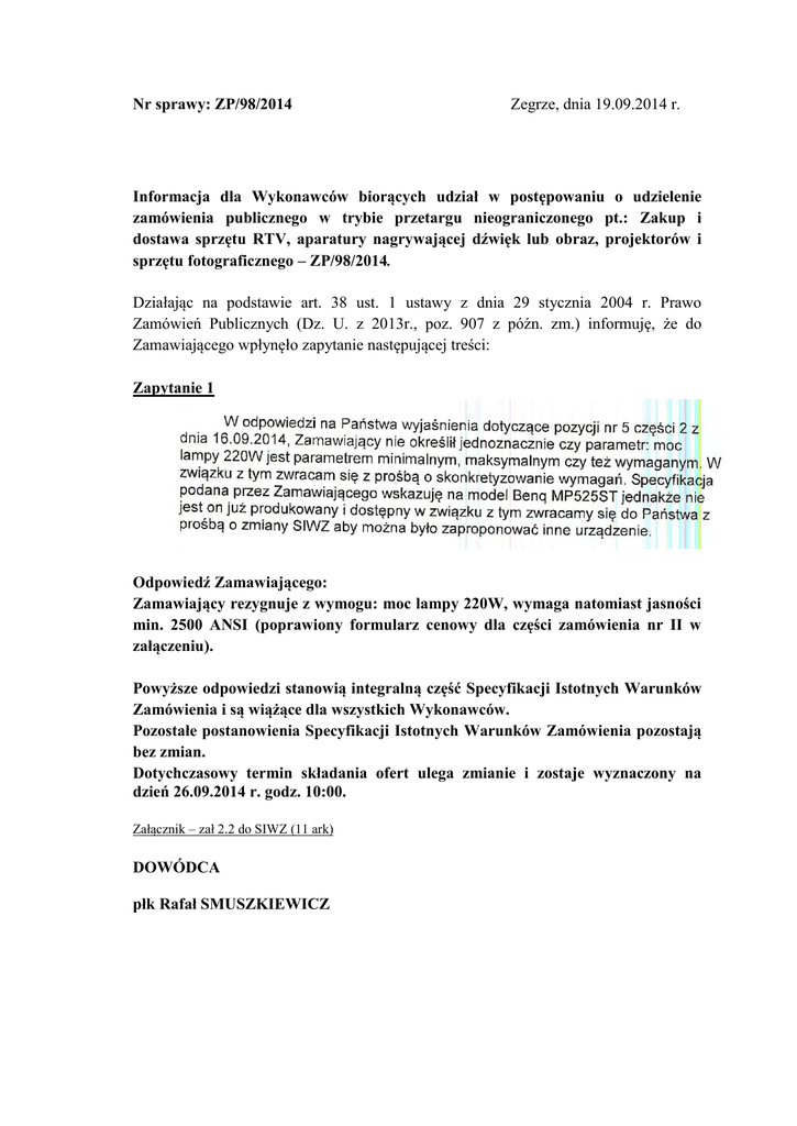 Nr sprawy: ZP/98/2014 Zegrze, dnia 19.09.2014 r. Informacja dla