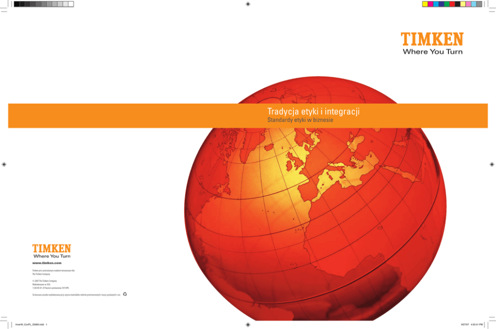 Tradycja etyki i integracji Standardy etyki w biznesie www.timken.com Timken jest zastrzeżonym znakiem towarowym dla The Timken Company © 2007 The Timken Company Wydrukowano w USA 1.5M 09-07-29 Numer zamówienia 10159PL Ta broszura została wydrukowana przy użyciu materiałów wtórnie przetworzonych i tuszy uzyskanych z soi. InnerW_CovPL_53369.indd 1 9/27/07 4:53:41 PM InnerW_CovPL_53369.indd 2 9/27/07 4:53:41 PM Etyka i uczciwość Spis treści List od prezesa i dyrektora generalnego............................................................................................................................................................................... 3 Określenie zasad............................................................................................................................................................................................................................ 5 Infolinia firmy Timken.................................................................................................................................................................................................................. 6 W miejscu pracy............................................................................................................................................................................................................................. 7 Równe szanse zatrudnienia i powszechna akceptacja odmienności (łącznie z problematyką miejsca pracy wolnego od znęcania się)............................................................................................7 Zdrowie, bezpieczeństwo i problematyka środowiska pracy 7 Miejsce pracy wolne od narkotyków i alkoholu.....................................................................................................................................8 Zasady wynagrodzenia i wymiaru godzinowego pracy...................................................................................................................8 Sposoby postępowania z klientami, dostawcami, konkurencją i przedstawicielami władz.............................................................................. 9 Zasady antymonopolowe i konkurencja....................................................................................................................................................9 Uczciwe postępowanie.........................................................................................................................................................................................9 Prezenty, rozrywki i sprzeczność interesów...........................................................................................................................................10 Międzynarodowe prawo handlowe...........................................................................................................................................................11 Integralność produktu.........................................................................................................................................................................................12 Respektowanie prawa własności intelektualnej innych osób....................................................................................................13 Kontakty z przedstawicielami władz...........................................................................................................................................................14 Wykorzystywanie informacji i własności firmy.................................................................................................................................................................16 Informacje poufne.................................................................................................................................................................................................16 Przechowywanie dokumentów....................................................................................................................................................................16 Informacje wewnętrzne.....................................................................................................................................................................................16 Korzyści dla firmy....................................................................................................................................................................................................17 Ochrona i odpowiednie wykorzystywanie informacji należących do firmy Timken oraz innych jej własności, w tym intelektualnych..............................................................................................................................17 Dokładne i pełne raporty...................................................................................................................................................................................17 Publiczne raporty i komunikaty....................................................................................................................................................................17 Współpraca z audytorami.................................................................................................................................................................................18 Uzyskiwanie pomocy i zgłaszanie naruszania prawa.....................................................................................................................................................19 Przestrzeganie niniejszych zasad..........................................................................................................................................................................................20 Odstąpienie od niniejszych zasad..........................................................................................................................