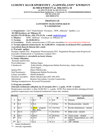 LUDOWY KLUB SPORTOWY „NADWIŚLANIN” KWIDZYN 82-500 KWIDZYN ul. MIŁOSNA 18 tel. 055-279-39-58 fax 055-279-33-54 KONTO Powiślański Bank Spółdzielczy w Kwidzynie Nr 13830000090000088220000010 NIP 581-10-96-249 KRS 0000122741 __________________________________________________________________________________________ PROPOZYCJE ZAWODÓW OGÓLNOPOLSKICH W UJEŻDŻENIU 1. Organizator: LKS ”Nadwiślanin” Kwidzyn , TRW „Miłosna” Spółka z o.o. 82-500 Kwidzyn ,ul. Miłosna 18 tel.(55) 279-39-58 fax. (55) 279-33-54, e-mail: [email protected] 2. Miejsce: TRW „Miłosna” Kwidzyn, ul. Miłosna 18 3. Termin: 26-28.08.2011r. 4. Uczestnicy: Kluby zarejestrowane w PZJ oraz zawodnicy bez przynależności klubowej 5. Termin zgłoszeń ostatecznych do 12.08.2011r. wyłącznie na drukach PZJ z podaniem wszystkich danych faksem lub e-mail. 6. Warunki ogólne: Przepisy Ogólne PZJ , Regulamin Weterynaryjny PZJ , Regulamin Rozgrywania Krajowych Zawodów Jeździeckich w Ujeżdżeniu wydanie 2011. 7. Uczestnictwo w zawodach na koszt własny. 8. Osoby Oficjalne: Komisja sędziowska: Przewodniczący : Helena Zagor, Członkowie Zofia Górska ,Małgorzata Hałeła-Pawłowska, Adam Jończyk, Józef Zagor, Sędzia PZJ: Maria Pilichowska Szef Komisarzy: Małgorzata Hałeła-Pawłowska Lekarz zawodów: Marek Rudnicki Dyrektor zawodów: Marta Głuchowska (692-396-303) Sekretariat: Bożena Nacwalska, Cecylia Czarnowska Obsługa komputerowa: Krzysztof Przyjemski 9. Program zawodów: Zebranie techniczne odbędzie się 25 sierpnia 2011 r. o godz. 19.30 / w kuźni/ Rozpoczęcie zawodów w dniu 26.08.2011 r. o godz. 10.00. Przy dużej liczbie startujących koni godzina rozpoczęcia oraz kolejność konkursów może ulec zmianie. Runda I DZIEŃ II * 8 N-9 III * 15 Uczestnictwo i ograniczenia startowe Otwarte 1 N-6 * 1 N-7 2 C-3 2 C-4 9 C-6 Kur 16 Runda juniorska - otwarte 3 CC-1 10 CC-6 Kur 17 Runda młodzieżowa - otwarte 4 CC-4 3 CC-2 – program Św. Jerzy, 4 CC-7 11 CC-8 Kur 18 Mała runda - otwarte 5 6** CS-1 P-2 5 CS-2 6 P-3 12 CS-5 Kur 13 P-4 19 20 7** L-1 7 L-2 14 L-3 21 Duża runda - otwarte Mistrz. Województwa Jun. i ZR -otwarte ZR - otwarte *- numer konkursów ** - zawody regionalne 1 PROGRAMY UJEŻDŻENIOWE ZGODNIE Z TABELĄ NR 1- ZAŁĄCZNIK DO REGULAMINU 2011 W ramach zawodów regionalnych w dniach 26-28.08.2011r. odbędą się Mistrzostwa Juniorów Województwa Pomorskiego /runda nr 6/. Są to konkursy otwarte. 10. Opłaty i zgłoszenia: - boksy ( stajnia namiotowa) – 250 zł za całe zawody , tj. od 25.08.2011r. od godz. 12.00 do 28.08.2011r. (organizator zapewnia ściółkę na cała zawody - trociny). Wniesione opłaty za niewykorzystane boksy nie podlegają zwrotowi. W przypadku wcześniejszego przyjazdu na zawody, ewentualnie późniejszego wyjazdu pobierana będzie dodatkowa opłata w wysokości 50 zł dziennie za boks. Ze względów organizacyjnych ewentualny wcześniejszy przyjazd na zawody należy uzgodnić z organizatorem. UWAGA ! Prosimy o zabranie na zawody wiader i żłobów. - Opłata organizacyjna – 250 zł od konia za rundę lub 90 zł od pojedynczego startu. - 15 zł od konia na program badań antydopingowych (tylko ZO). - Przyłącze do prądu – 50 zł /prosimy zaznaczyć w zgłoszeniu/ Opłaty za boksy prosimy dokonać na konto bankowe LKS „Nadwiślanin” Kwidzyn Powiślański Bank Spółdzielczy Kwidzyn nr 13 83000009 00000 882 2000 0010. Potwierdzenie wpłaty należy dołączyć do zgłoszenia ostatecznego na zawody. Dla koni zgłoszonych do zawodów bez potwierdzenia wpłaty organizator nie zapewnia boksów. Pozostałe opłaty należy uiścić najpóźniej do czasu zakończenia odprawy technicznej w biurze zawodów lub przesłać na w/w konto. Zawody regionalne: Oplata organizacyjna: - 50 zł od konia za dzień zawodów- zawody regionalne w tym Mistrzostwa Juniorów Organizator zastrzega sobie prawo do zmiany programu. Za konie zgłoszone po terminie pobierana będzie opłata organizacyjna powiększona o 50 % 11. Warunki techniczne: 1. Czworoboki – podłoże piaszczyste 2. Rozprężalnia – podłoże piaszczyste Czworobok konkursowy będzie udostępniony do treningu w dniu 25.08.10 r. w godz. 12.00 – 19.30. 12. Sprawy weterynaryjne: Konie muszą posiadać aktualne szczepienia zgodnie z przepisami weterynaryjnymi. Bez w/w dokumentów konie nie będą wpuszczone na teren TRW „Miłosna” Kwidzyn. Przegląd weterynaryjny ewentualnie na życzenie lekarza wet. przed stajnią. Lp. 1. 2. 3. funkcja Powiatowy lekarz wet. Pełnomocnik Pow.lek.wet. Lekarz wet. zawodów Imię i nazwisko Józef Świokło Andrzej Olszewski Marek Rudnicki Telefon 055/279-31-62 0601-680-364 601-594-589 Szczepienia ochronne przeciwko grypie koni – obowiązuje następujący schemat szczepień: a. szczepienie podstawowe: • pierwsze szczepienie – w dniu rozpoczęcia szczepień • drugie szczepienie – nie wcześniej niż 21-go dnia i nie później niż 92-go dnia od pierwszego szczepienia 2 b. szczepienia przypominające: • co 6 miesięcy od ostatniego szczepienia (jest dopuszczalny 21 dniowy okres karencji): żadne szczepienie przypominające nie może odbyć się później niż na 7 dni przez przybyciem na zawody. 13. Dokumentacja Klubów, zawodników i koni zgodna z przepisami Polskiego Związku Jeździeckiego . 14. Dla zwycięskich koni przewidziane są flot’s oraz puchary i nagrody rzeczowe (rundy 1 i 2) za trzy pierwsze miejsca w rundzie i nagrody finansowe( rundy 3,4,5) . W tych rundach liczba nagradzanych miejsc będzie zależna od ilości startujących koni np.5 koni – 1 nagroda, 8 koni2 nagrody., 12 koni – 3 ) W Mistrzostwach Województwa Juniorów flot’s + medale 15. Hotele: Organizator nie pośredniczy w zamawianiu noclegów. PENSJONAT „MIŁOSNA” tel. 055- 279-40-52 „Brzozowy Dwór” Pensjonat Rakowiec 70 tel. 055- 275-16-18 /ok. 8 km./ Hotel „SAGA” Kwidzyn ul. Chopina 42 tel. 055-279-37-32 Zajazd Sportowy / Stadion/ Kwidzyn ul. Sportowa 6 tel. 055- 2