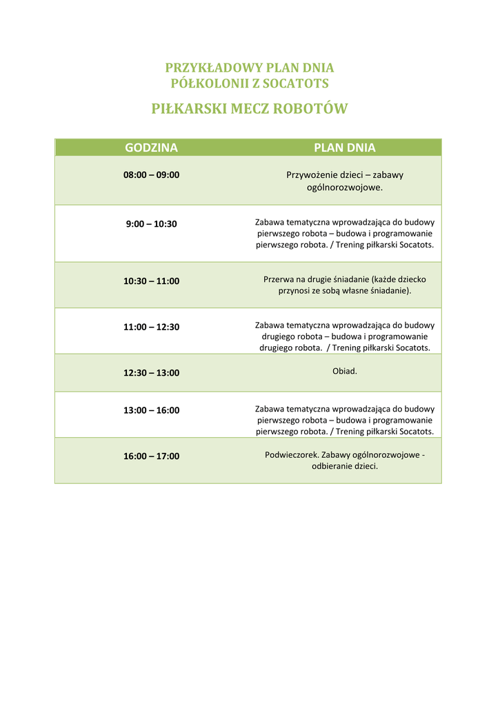 PRZYKŁADOWY PLAN DNIA PÓŁKOLONII Z SOCATOTS PIŁKARSKI MECZ ROBOTÓW GODZINA PLAN DNIA 08:00 – 09:00 Przywożenie dzieci – zabawy ogólnorozwojowe. 9:00 – 10:30 Zabawa tematyczna wprowadzająca do budowy pierwszego robota – budowa i programowanie pierwszego robota. / Trening piłkarski Socatots. 10:30 – 11:00 Przerwa na drugie śniadanie (każde dziecko przynosi ze sobą własne śniadanie). 11:00 – 12:30 Zabawa tematyczna wprowadzająca do budowy drugiego robota – budowa i programowanie drugiego robota. / Trening piłkarski Socatots. 12:30 – 13:00 Obiad. 13:00 – 16:00 Zabawa tematyczna wprowadzająca do budowy pierwszego robota – budowa i programowanie pierwszego robota. / Trening piłkarski Socatots. 16:00 – 17:00 Podwieczorek. Zabawy ogólnorozwojowe odbieranie dzieci.