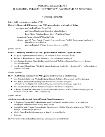 PROGRAM SZCZEGÓŁOWY II KONGRESU POLSKICH TOWARZYSTW NAUKOWYCH NA OBCZYŹNIE 4 września (czwartek) 9.00 – 10.00 rejestracja uczestników (PAU) 10.00 – 11.30 otwarcie II Kongresu (Aula PAU), prowadzenie – prof. Andrzej Białas - powitania: prof. Andrzej Białas, Prezes PAU prof. Jacek Majchrowski, Prezydent Miasta Krakowa Poseł Maciej Płażyński, Prezes Stow. „Wspólnota Polska” - wystąpienie Premiera Rządu RP Donalda Tuska - referaty: prof. C. Pierre Zaleski (Francja) Cele i oczekiwania Polskich Stowarzyszeń Naukowych Zawodowych poza Krajem prof. Andrzej Zoll (Polska) Społeczeństwo obywatelskie przerwa kawowa 12.00 – 13.30 obrady plenarne (Aula PAU), prowadzenie dr Kazimierz Jagiełło (Kanada) • • • • ks. bp. dr Zygmunt Zimowski (Polska) Jan Paweł II w trosce o Polonię Świata Tadeusz A. Pilat (Szwecja) Nowa Emigracja – potrzeba badań naukowych prof. Tadeusz Gromada (Stany Zjednoczone) Przyszłość Polskiego Instytutu Naukowego w Ameryce. Potrzeby i kierunki. prof. Ryszard Chmielowiec (Wielka Brytania) „Inicjatywa Londyńska” – konieczność czy wybór polskiego inżyniera w Europie przerwa obiadowa 15.30 – 18.20 obrady plenarne (Aula PAU), prowadzenie Tadeusz A. Pilat (Szwecja) prof. Wojciech Falkowski (Wielka Brytania) Historia Polskiego Uniwersytetu na Obczyźnie, I cz. prof. Halina Taborska (Wielka Brytania) Polski Uniwersytet na Obczyźnie - alternatywny model placówki akademickiej poza granicami macierzystego kraju, II cz. • prof. Tadeusz Radzik (Polska) Polskie Towarzystwa Naukowe na Obczyźnie • dr Joanna Pyłat (Wielka Brytania) Inicjatywy i kierunki działania polskich środowisk emigracyjnych w Londynie w latach 2004 – 2008. Zarys sytuacji. • • przerwa kawowa c.d. obrad, prowadzenie prof. Andrzej Nowak (Stany Zjednoczone) • • • • dr Bogusław Szymański (Polska) Podejmowanie i odbywanie studiów w Polsce przez studentów polonijnych w świetle zapisów ustawy Karta Polaka Adam Gałkowski (Polska) Instytut Badań Biograficznych i Zakład Biografistyki Polonijnej PUNO we Francji. Dwie instytucje - jeden cel. Maciej Bator (Irlandia) Nowa emigracja. Łosoś, czy jednak bocian. dyskusja 18.30 otwarcie wystawy Henryki Justyńskiej z Gruzji (Galeria Domu Polonii) 5 września (piątek) 9.00 – 13.00 Współczesne migracje Polaków – obrady plenarne (Aula PAU), prowadzenie prof. Tadeusz Gromada (Stany Zjednoczone) • • • • • dr Aleksandra Galasińska (History and Governance Research Institute, University of Wolverhampton) Dynamika sieci migracyjnej – mikro-socjologia środowiska imigrantów polskich w Środkowej Anglii Alicja Bobek i Justyna Salamońska (Trinity College Dublin) „Wykształciuchy i „Marianny”. Polscy migranci w Irlandii ze szczególnym uwzględnieniem Dublina Agnieszka Małek (Uniwersytet Jagielloński) <A w niedzielę jest czas na wszystko...> Formy spędzania czasu wolnego przez imigrantki polskie w Rzymie Katharina Blumberg-Stankiewicz (Viadrina) Odkrywanie migracyjnych biografii. Polscy imigranci i imigrantki drugiego pokolenia, w Niemczech – kraju imigracji. dr Anna Sosnowska-Jordanovska (Uniwersytet Warszawski) Polacy, Żydzi i Portorykanie. Liderzy polskiego Greenpointu o nowojorskich grupach etnicznych. przerwa kawowa cd. obrad, prowadzenie prof. Piotr Małoszewski (Niemcy) • • • • • • dr Aleksandra Grzymała-Kazłowska (Ośrodek Badań nad Migracjami, Uniwersytet Warszawski) Niepełna migracja a funkcjonowanie nielegalnych polskich pracowników w Belgii w latach 90. Elżbieta Kuźma (Université Libre de Bruxelles) Podlasiaki na papierach. Transformacja polskiej społeczności imigracyjnej w Brukseli w latach 2003-2008 Marcin Galent (Uniwersytet Jagielloński) Kontakt i zmiana. Tożsamości polskich migrantów wahadłowych w Belgii Agata Kalinowska-Bouvy (Francja) Kwestia migracji do Francji – nowy typ emigracji, problemy i oczekiwania – wpływ na środowisko Polonii. dr Alina Siomkajło (Wielka Brytania) Dyskretny urok cenzury emigracyjnej (1940-2008) dyskusja 9.00 – 13.00 Polski inżynier w kraju i na świecie, I Sympozjum (Centrum Konferencyjne AGH) – wg oddzielnego programu przerwa obiadowa 15.00 – 17.45 Przemiany migracji środowisk polonijnych – obrady plenarne (Centrum Konferencyjne AGH), prowadzenie prof. Zygmunt Kolenda dr Paweł Kaczmarczyk (Uniwersytet Warszawski) Migracje z Polski przed i po 1 maja 2004 roku prof. Piotr Małoszewski (Niemcy) Stan nauczania języka polskiego w Niemczech w świetle zapisów polskoniemieckiego traktatu z 17 czerwca 1991r. • Marek Piekarski (Wielka Brytania) Polski inżynier w Europie: wczoraj, dziś i jutro. • • cd. obrad, prowadzenie Mirosław Niedziński (Stany Zjednoczone) • • • • dr Kazimierz Jagiełło (Kanada) Adaptacja i kariera polskiego inżyniera w Ameryce Północnej Joanna Napierała i Paulina Travena (Ośrodek Badań nad Migracjami, UW) Warunki życia i pracy polskich migrantów w Norwegii: studium przypadku Polaków w Oslo. dr Jan Płachta (Stany Zjednoczone) Rudolf Modrzejewski dyskusja i podsumowanie 19.15 Koncert Chopinowski (Dom Polonii) 6 września (sobota) 9.00 – 11.00 obrady plenarne (Aula PAU), prowadzenie Janusz Ptak (Francja) • • • • • • prof. Henryk Stroński (Ukraina) Stowarzyszenie Uczonych Polskich Ukrainy wobec problemów narodowego odrodzenia Polaków w kraju zamieszkania prof. Czesław Bieńkowski (Białoruś) Działalność Polskiego Towarzystwa Naukowego na Białorusi: sukcesy i porażki dr Sergiusz Rudnicki (Ukraina) Działalność naukowa i popularyzatorska polskich organizacji społecznych na Żytomierszczyźnie w okresie 1989 – 2007r. dr Lech Suchomłynow (Ukraina) Tożsamość narodowa Polaków na pograniczu ukraińsko-rosyjskim: modyfikacja wartości fundamentalnych w warunkach tygla kulturowego Irena Perszko (Ukraina) Polskie Towarzystwo Naukowe w Żytomierzu: pierwotne założenia i kierunki ewolucji Józef Szostakowski (Litwa) Obszary badawc