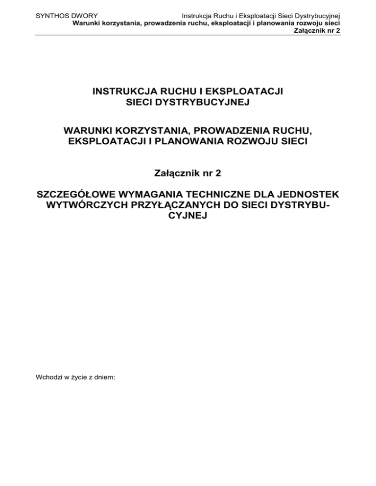SYNTHOS DWORY Instrukcja Ruchu i Eksploatacji Sieci Dystrybucyjnej Warunki korzystania, prowadzenia ruchu, eksploatacji i planowania rozwoju sieci Załącznik nr 2 INSTRUKCJA RUCHU I EKSPLOATACJI SIECI DYSTRYBUCYJNEJ WARUNKI KORZYSTANIA, PROWADZENIA RUCHU, EKSPLOATACJI I PLANOWANIA ROZWOJU SIECI Załącznik nr 2 SZCZEGÓŁOWE WYMAGANIA TECHNICZNE DLA JEDNOSTEK WYTWÓRCZYCH PRZYŁĄCZANYCH DO SIECI DYSTRYBUCYJNEJ Wchodzi w życie z dniem: SYNTHOS DWORY Instrukcja Ruchu i Eksploatacji Sieci Dystrybucyjnej Warunki korzystania, prowadzenia ruchu, eksploatacji i planowania rozwoju sieci Załącznik nr 2 S P I S T R E Ś C I POSTANOWIENIA OGÓLNE ................................................................................................ 3 URZĄDZENIA ŁĄCZENIOWE ............................................................................................... 4 ZABEZPIECZENIA ................................................................................................................ 5 KOMPENSACJA MOCY BIERNEJ ....................................................................................... 7 ZAŁĄCZANIE JEDNOSTEK WYTWÓRCZYCH .................................................................... 8 CZĘSTOTLIWOŚĆ I NAPIĘCIE............................................................................................. 9 DODATKOWE KRYTERIA OCENY MOŻLIWOŚCI PRZYŁĄCZENIA JEDNOSTEK WYTWÓRCZYCH DO SIECI SN i nN .................................................................................. 11 VII.1. Informacje ogólne. ................................................................................................... 11 VII.2. Kryterium stabilności lokalnej. .................................................................................. 11 VII.3. Kryterium dynamicznej zmiany napięcia................................................................... 12 VII.4. Kryteria oceny możliwości przyłączenia źródeł do sieci nN. ............................................. 12 VIII. DODATKOWE WYMAGANIA DLA MIKROŹRÓDEŁ WSPÓŁPRACUJĄCYCH Z SIECIĄ DYSTRYBUCYJNĄ ............................................................................................. 13 VIII.1. Postanowienia ogólne. ............................................................................................. 13 VIII.2. Przyłączanie mikroźródeł do sieci. ............................................................................ 13 VIII.3. Kryteria współpracy z siecią. .................................................................................... 13 IX. DODATKOWE WYMAGANIA DLA FARM WIATROWYCH PRZYŁĄCZANYCH DO SIECI DYSTRYBUCYJNYCH .............................................................................................. 15 IX.1. Postanowienia ogólne. ............................................................................................. 15 IX.2. Regulacja mocy czynnej farmy wiatrowej. ................................................................. 15 IX.3. Praca farmy wiatrowej w zależności od częstotliwości i napięcia.............................. 16 IX.4. Załączanie i wyłączanie farm wiatrowych. ................................................................ 16 IX.5. Regulacja napięcia i mocy biernej............................................................................. 16 IX.6. Praca farm wiatrowych przy zakłóceniach w sieci. ................................................... 17 IX.7. Dotrzymanie standardów jakości energii. ................................................................. 17 IX.8. Elektroenergetyczna automatyka zabezpieczeniowa. .............................................. 18 IX.9. Monitoring i komunikacja farmy wiatrowej z operatorem systemu. ........................... 18 IX.10. Testy sprawdzające. ................................................................................................. 19 I. II. III. IV. V. VI. VII. SYNTHOS DWORY Instrukcja Ruchu i Eksploatacji Sieci Dystrybucyjnej Warunki korzystania, prowadzenia ruchu, eksploatacji i planowania rozwoju sieci Załącznik nr 2 I. I.1. I.2. I.3. I.4. I.5. I.6. POSTANOWIENIA OGÓLNE Wymagania zawarte w niniejszym załączniku dotyczą jednostek wytwórczych przyłączanych i przyłączonych do sieci dystrybucyjnej. Istniejące jednostki wytwórcze muszą spełniać przedmiotowe wymagania techniczne po ich remoncie lub modernizacji oraz w innych przypadkach przewidzianych w niniejszej IRiESDn. SYNTHOS DWORY określa warunki przyłączenia do sieci dla jednostek wytwórczych, w tym ustala do sieci o jakim poziomie napięcia znamionowego należy przyłączyć jednostki wytwórcze, w zależności od wielkości mocy przyłączeniowej i lokalnych warunków pracy sieci dystrybucyjnej oraz z uwzględnieniem wyników ekspertyzy wpływu przyłączanych instalacji na system elektroenergetyczny. Sposób przyłączenia jednostek wytwórczych do sieci dystrybucyjnej, powinien umożliwiać ich odłączenie oraz stworzenie przerwy izolacyjnej, w sposób nieograniczony dla SYNTHOS DWORY. Jednostki wytwórcze o mocy osiągalnej powyżej 150 kVA przyłączane do sieci dystrybucyjnej powinny być zautomatyzowane i dostosowane do zdalnego sterowania. SYNTHOS DWORY decyduje o konieczności wyposażenia łącznika sprzęgającego jednostkę wytwórczą z siecią dystrybucyjną w urządzenia umożliwiające zdalne sterowanie. Moc zwarciowa w miejscu przyłączenia jednostek wytwórczych do sieci dystrybucyjnej powinna być przynajmniej 20 razy większa od ich mocy zainstalowanej. Praca wyspowa jednostek wytwórczych jest możliwa jedynie na wyspę urządzeń tego wytwórcy, o ile uwzględniono to w warunkach przyłączenia. SYNTHOS DWORY Instrukcja Ruchu i Eksploatacji Sieci Dystrybucyjnej Warunki korzystania, prowadzenia ruchu, eksploatacji i planowania rozwoju sieci Załącznik nr 2 II. URZĄDZENIA ŁĄCZENIOWE II.1. Jednostki wytwórcze muszą posiadać następujące urządzenia łączeniowe: a