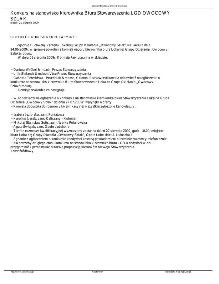 Serwis internetowy Gminy Karczmiska Konkurs na stanowisko kierownika Biura Stowarzyszenia LGD OWOCOWY SZLAK piątek, 21 sierpnia 2009 PROTOKÓL KOMISJI REKRUTACYJNEJ Zgodnie z uchwałą Zarządu Lokalnej Grupy Działania ,,Owocowy Szlak" Nr 14/09 z dnia 24.06.2009r. w sprawie powołania komisji naboru kierownika biura Lokalnej Grupy Działania ,,Owocowy Szlak”. W dniu 05 sierpnia 2009r. Komisja Rekrutacyjna w składzie: - Dariusz Wróbel — Prezes Stowarzyszenia - Lilla Stefanek — Vice Prezes Stowarzyszenia - Gabriela Teresińska - Pruchniak — Członek Radyzweryfikowała odpowiedź na ogłoszenie o konkursie na stanowisko kierownika Biura Stowarzyszenia Lokalna Grupa Działania ,,Owocowy Szlak”. Komisja stwierdza co następuje: - W odpowiedzi na ogłoszenie o konkursie na stanowisko kierownika biura Stowarzyszenia Lokalna Grupa Działania ,,Owocowy Szlak" do dnia 27.07.2009r. wpłynęły 4 oferty. - Komisja dopuściła do rozmowy kwalifikacyjnej wszystkie zgłoszone kandydatury: - Izabela Jeziorska, zam. Poniatowa - Karolina Lasek, zam. Kaliszany - Kolonia - Mikołaj Stanisław Solis, zam. Wólka Polanowska - Agata Swiątek, zam. Opole Lubelskie - Termin rozmowy kwalifikacyjnej wyznaczony został na dzień 27 sierpnia 2009, godz. 10.00, miejsce: biuro Lokalnej Grupy Diałania ,,Owocowy Szlak", Opole Lubelskie ul. Lubelska 4. - Zgodnie z ogłoszeniem o konkursie kandydaci zostaną powiadomieni o terminie rozmowy telefonicznie. - Na potrzeby drugiego etapu konkursu na stanowisko kierownika biura LGD Kandydaci winni przygotować i przedstawić autorską propozycję kierunków rozwoju Stowarzyszenia. Tekst źródłowy http://www.karczmiska.pl Kreator PDF Utworzono 4-03-2017, 08:55