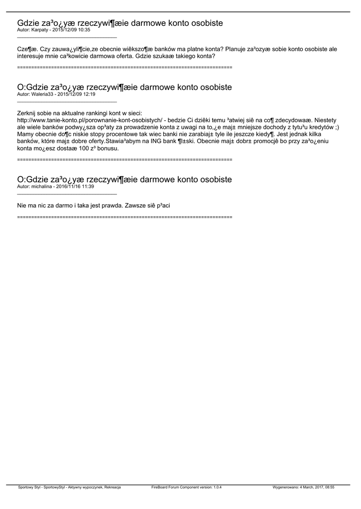 Gdzie za³o¿yæ rzeczywi¶æie darmowe konto osobiste Autor: Karpaty - 2015/12/09 10:35 _____________________________________ Cze¶æ. Czy zauwa¿yli¶cie,ze obecnie wiêkszo¶æ banków ma platne konta? Planuje za³ozyæ sobie konto osobiste ale interesuje mnie ca³kowicie darmowa oferta. Gdzie szukaæ takiego konta? ============================================================================ O:Gdzie za³o¿yæ rzeczywi¶æie darmowe konto osobiste Autor: Waleria33 - 2015/12/09 12:19 _____________________________________ Zerknij sobie na aktualne rankingi kont w sieci: http://www.tanie-konto.pl/porownanie-kont-osobistych/ - bedzie Ci dziêki temu ³atwiej siê na co¶ zdecydowaæ. Niestety ale wiele banków podwy¿sza op³aty za prowadzenie konta z uwagi na to,¿e maj± mniejsze dochody z tytu³u kredytów ;) Mamy obecnie do¶c niskie stopy procentowe tak wiec banki nie zarabiaj± tyle ile jeszcze kiedy¶. Jest jednak kilka banków, które maj± dobre oferty.Stawia³abym na ING bank ¶l±ski. Obecnie maj± dobr± promocjê bo przy za³o¿eniu konta mo¿esz dostaæ 100 z³ bonusu. ============================================================================ O:Gdzie za³o¿yæ rzeczywi¶æie darmowe konto osobiste Autor: michalina - 2016/11/16 11:39 _____________________________________ Nie ma nic za darmo i taka jest prawda. Zawsze siê p³aci ============================================================================ Sportowy Styl - SportowyStyl - Aktywny wypoczynek, Rekreacja FireBoard Forum Component version: 1.0.4 Wygenerowano: 4 March, 2017, 08:55