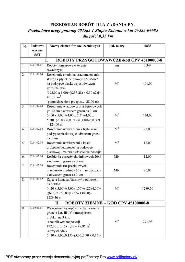PRZEDMIAR ROBÓT DLA ZADANIA PN. Przebudowa drogi gminnej 003585 T Słupia-Kolonia w km 0+335-0+685 długości 0,35 km Lp Podstawa wyceny SST Nazwy elementów rozliczeniowych I. 1. D.01.01.01 2. D.01.02.04 3. D.01.02.04 4. D.01.02.04 5. D.01.02.04 6. D.01.02.04 7 D.01.02.04 8. D.01.02.02 9. ilość ROBOTY PRZYGOTOWAWCZE-kod CPV 45100000-8 Roboty pomiarowe w terenie równinnym Rozebranie chodnika oraz umocnienia skarpy z płytek betonowych 50x50x7 na podsypce piaskowej z odwozem gruzu na 3km (192,00 x 1,00)+[(237-28) x 0,50 x2)]= 401,00 m2 -pomniejszenie o przepusty -28,00 mb Rozebranie wjazdów z płyt betonowych gr. 12 cm z odwozem gruzu na 3 km (4,00 x 5,00)+(4,00 x 2,5)+(4,00 x 5,50)+(2,00 x 6,00 x 2)+(4,00x6,00x2) = 124,00 m2 Rozebranie nawierzchni z trylinki na podsypce piaskowej z odwozem gruzu na 3 km Rozebranie nawierzchni z kostki brukowej betonowej na podsypce piaskowej /materiał właściciela posesji/ Rozbiórka obrzeży chodnikowych 20x6 z odwozem gruzu na 3 km Rozebranie rur przelotowych przepustów średnicy 60 cm na zjazdach z odwozem gruzu na 3 km Zdjęcie humusu /darniny/ z odwozem na odkład (4,20 x 5,00)+(5,00x1,70)+(127x4,00)+ [(6+3)/2 x66,00]+ (3,5x130,00)= 1289,50 m2 II. D.02.01.01 Jed. miary km 0,344 M2 401,00 M2 124,00 M2 22,00 M2 12,00 Mb. 12,00 Mb. 20,00 M2 1289,50 ROBOTY ZIEMNE – KOD CPV 45100000-8 Wykonanie wykopów mechanicznie w gruncie kat. III-IV z transportem urobku na 3 km. -chodnik wzdłuż posesji 192,00 x 0,15x 1,70 = 48,96 m3 -nowy chodnik (4,20 x 5,00x0,15)+(5,00x1,70 x 0,15)= M3 PDF stworzony przez wersję demonstracyjną pdfFactory Pro www.pdffactory.pl/ 271,93 10. 11. D.02.01.01 D.02.03.01 4,43 m3 -zjazdy na posesje (4,00 x 5,00)+(4,00 x 2,5)+(4,00 x 5,50)+(2,00 x 6,00x2) +(4,00x6,00x2)= 124,00 x0,20=24,80 m3 Skosy 5,00 m2 x 0,20 = 1,00 m3 -parking [(4,65x82,00)+(4,50x4,50/2x2)]x0,48= 192,74 m3 Wykonanie wykopu w gruncie kat. IIIIV z wbudowaniem gruntu w nasyp z formowaniem i zagęszczeniem nasypu i zwilżeniem nasypu w miarę potrzeb warstw zagęszczanych /poszerzenie jezdni w km 0+194-0+319/ 125,00 x 0,65 x 0,44=35,75 m3 Wykonanie nasypów z gruntu III-IV z transportem urobku na nasyp z formowaniem i zagęszczeniem nasypu i zwilżeniem nasypu w miarę potrzeb warstw zagęszczanych .Grunt z dokopu. Pod nowy chodnik. (2,00+2,50)/2 x 0,40 x 127,00=114,30 m3 III. 12. D.03.02.01 13. 35,75 M3 114,30 ODWODNIENIE KORPUSU DROGOWEGO –kod CPV 45230000-8 Wykonanie studzienki ściekowej średnicy 50 cm z osadnikiem, przyknalik z PCW średnicy 200 mm, ułożony na podłożu z piasku gr. 20 cm, wykopy liniowe o ścianach pionowych IV. D.04.01.01 M3 mb 8,00 PODBUDOWY-kod CPV 45233000-9 Profilowanie i zagęszczenie podłoża pod warstwy konstrukcyjne nawierzchni wykonane mechanicznie w gruncie kat. III-IV -chodnik wzdłuż posesji 192,00 x 1,70= 326,40 m2 -nowy chodnik (4,20 x 5,00)+(5,00x1,70 )+ (127,00 x 1,70) = 245,40 m2 -zjazdy na posesje (4,00 x 5,00)+(4,00 x 2,5)+(4,00 x 5,50)+(2,00 x 6,00x2) +(4,00x6,00x2)= 124,00 m2 Skosy- 5,00 m2 M2 1183,60 PDF stworzony przez wersję demonstracyjną pdfFactory Pro www.pdffactory.pl/ 14. 15. 16. 17. 18. D.04.02.01 D.04.04.02 D.04.04.02 D.04.04.02 D.05.03.05 -poszerzenie jezdni w km 0+194-0+319 125,00 x 0,65 =81,25 m2 -parking (4,65x82,00)+(4,50x4,50/2x2)= 401,55 m2 Wykonanie i zagęszczenie warstwy odsączającej z piasku gr. 15 cm po zagęszczeniu -poszerzenie jezdni w km 0+194-0+319 125,00 x 0,65 =81,25 m2 -parking (4,65x82,00)+(4,50x4,50/2x2)= 401,55 m2 Wykonanie podbudowy z kruszywa łamanego stabilizowanego mechanicznie 0-63 gr. 25 cm po zagęszczeniu -poszerzenie jezdni w km 0+194-0+319 125,00 x 0,65 =81,25 m2 -parking (4,65x82,00)+(4,50x4,50/2x2)= 401,55 m2 Wykonanie podbudowy z kruszywa łamanego stabilizowanego mechanicznie 0-63 gr. 20 cm po zagęszczeniu -zjazdy na posesje (4,00 x 5,00)+(4,00 x 2,5)+(4,00 x 5,50)+(2,00 x 6,00x2) +(4,00x6,00x2)= 124,00 m2 Skosy- 5,00 m2 Wykonanie podbudowy z kruszywa łamanego stabilizowanego mechanicznie 0-31,5 gr. 10 cm po zagęszczeniu -chodnik wzdłuż posesji 192,00 x 1,50= 288,00 m2 -nowy chodnik (4,00 x 5,00)+(5,00x1,50 )+ (127,00 x 1,50) = 245,40 m2 Wykonanie warstwy wiążącej z betonu asfaltowego o grubości 4 cm po zagęszczeniu kategorii dla ruchu KR 1 -poszerzenie jezdni w km 0+194-0+319 125,00 x 0,56 =70,00 m2 -parking (4,56x82,00)+(4,50x4,50/2x2)= M2 482,80 M2 482,80 M2 129,00 M2 533,40 M2 464,17 PDF stworzony przez wersję demonstracyjną pdfFactory Pro www.pdffactory.pl/ 19. D.04.03.01 20. D.04.08.01 21. D.04.03.01 394,17 m2 Oczyszczenie i skropienie nawierzchni ulepszonej emulsją asfaltową Trasa zasadnicza: -194,00 x5,00=970,00 m2 -125,00 x 4,50 =562,50 m2 Wyrównanie istniejącej nawierzchni mieszanką mineralno-bitumiczną wg tabeli wyrównań. V. 22. D.05.03.05 23. 1532,50 Mg 139,20 NAWIERZCHNIA-kod CPV 45233000-9 Skropienie mechaniczne warstw konstrukcyjnych ulepszonych emulsją asfaltową – skropienie międzywarstwowe /po wyrównaniu i ułożeniu warstwy wiążącej/ Trasa zasadnicza: -194,00 x5,00=970,00 m2 -125,00 x 4,50 =562,50 m2 Skrzyżowanie w 0+120 (12+4,20)/2 x 9,00=72,90 m2 Skrzyżowanie 0+184 (27,00+5,00)/2 x 20,00=320,00 m2 Zjazd do Urzędu Gminy 3,50 x 10,00= 35,00 m2 Parking (4,50x82,00)+(4,50x4,50/2x2)= 389,25 m2 Wykonanie nawierzchni z betonu asfaltowego o grubości 4 cm po zagęszczeniu, warstwa ścieralna dla kategorii ruchu KR 1 Trasa zasadnicza: -194,00 x5,00=970,00 m2 -125,00 x 4,50 =562,50 m2 Skrzyżowanie w 0+120 (12+4,20)/2 x 9,00=72,90 m2 Skrzyżowanie 0+184 (27,00+5,00)/2 x 20,00=320,00 m2 Zjazd do Urzędu Gminy 3,50 x 10,00= 35,00 m2 Parking (4,50x82,00)+(4,50x4,50/2x2)= 389,25 m2 VI. D.08.01.01 M2 M2 2349,65 M2 2349,65 ELEMENTY ULIC -kod CPV 45233000-0 Ustawienie krawężnika betonowego 15x30x100 ułożonego na płask na ławie betonowej /przekrój ławy 0,30x0,10- Mb. PDF stworzony przez wersję demonstracyjną pdfFactory Pro www.pdffactory.pl/ 29,00 24. D.08.03.01 25. D.08.02.02 26. D.08.02.02 1 mb./, beton B-10 Ust